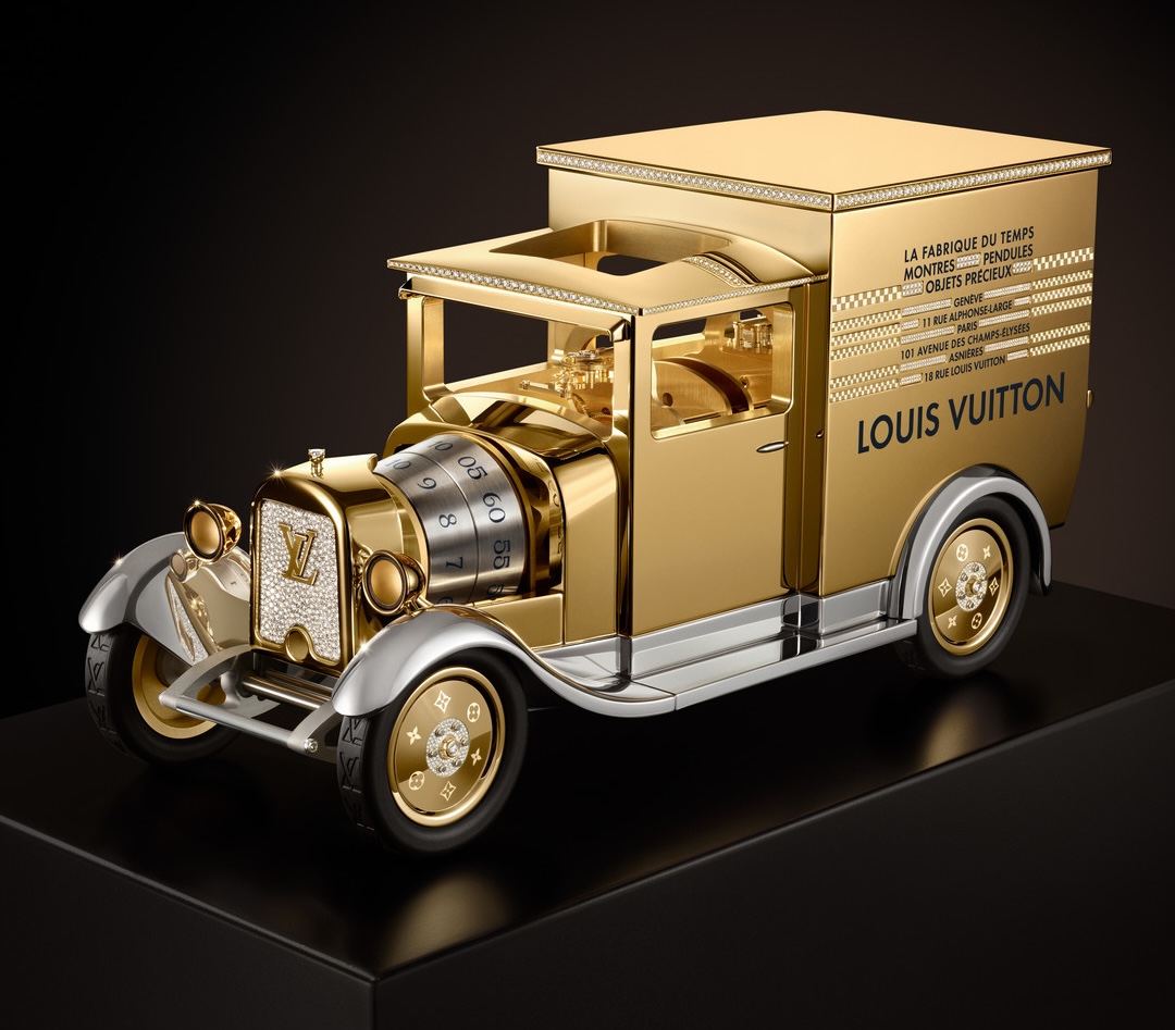 Après nous avoir fait voyager dans les airs avec la Montgolfière Aéro en 2024, La Fabrique du Temps Louis Vuitton nous entraîne sur les chemins inexplorés de l'imaginaire. La Maison s’empare aujourd’huides légendaires camionnettes siglées Louis Vuitton pour les élever au rang d’objets d’art. Au début du XXe siècle, ces véhicules historiques assuraient la liaison entre les ateliers d’Asnières, le cœur battant de la Maison, les clients et les magasins. En leur sein, des pièces emblématiques : les malles Louis Vuitton, qui effectuaient là leur toutpremier voyage. Aujourd'hui, Louis Vuitton transforme ces emblématiques camionnettes en une pièce horlogère extraordinaire, réveillant nos âmes d'enfants et donnant à cet héritage une nouvelle dimension. Silhouettes marquantes d'une époque, ces camionnettessymbolisaient le réseau en pleine expansion de la Maison, incarnant son esprit d’avant-garde et son adoption pionnière de l’automobile, sous l’impulsion de Gaston-Louis Vuitton. Avec leurs écritures caractéristiques, elles sont devenues les emblèmes de l’excellence mise au service de l’art du voyage. Chef-d'œuvre miniature, la Camionnette Louis Vuitton incarne désormais un objet d’art horloger. « Nous avons souhaité rester fidèles à l'esthétique originelle de cet objet légendaire,qui raconte les prémices de la Maison », explique Matthieu Hegi, Directeur Artistique de La Fabrique du Temps Louis Vuitton. « La symbolique du voyage est omniprésente. Cette pièce invite spontanément à la rêverie, nous replongeant dans l'imaginaire féerique et illimité de l'enfance. » Les camionnettes Louis Vuitton d’antan se distinguaient par les adresses peintes sur les flancs du véhicule, véritables signatures de leur époque. Ce clin d’œil historique se retrouvesur cet objet du temps, qui arbore les adresses des ateliers d’Asnières, de La Fabrique du Temps Louis Vuitton à Genève et du magasin des Champs-Élysées. Autant d’escales emblématiques qui insufflent vie à cette création, célébrant le dialogue constant entre les savoir-faire malletiers et horlogers de la Maison.
