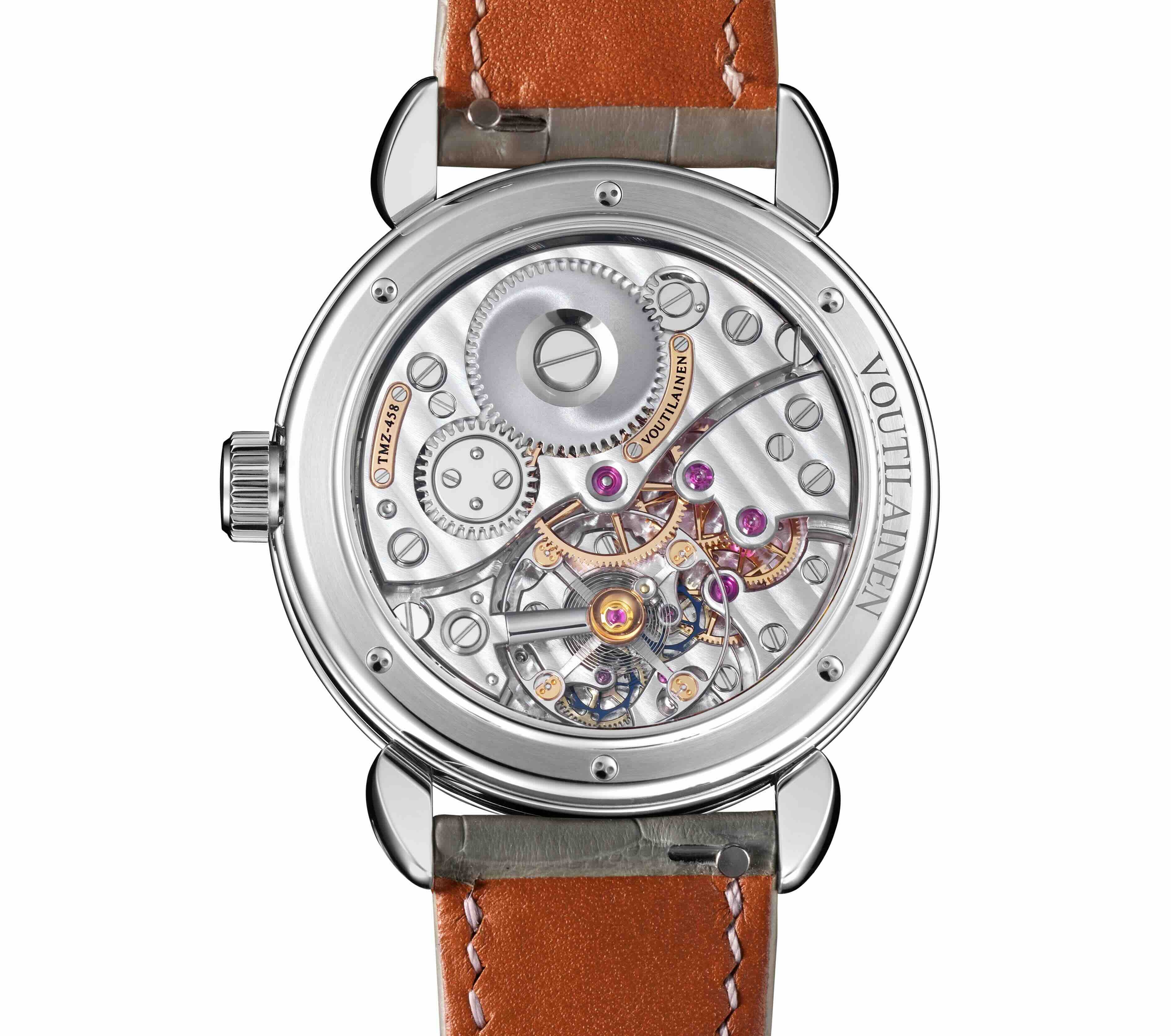 Le mécanisme a été conçu, construit, fabriqué, fini et assemblé dans l’atelier Voutilainen avec la plus grande précision, le plus grand soin et une réelle passion. Il présente un balancier très large manufacturé en interne, assurant une régulation parfaite dans des tolérances strictes. Afin d’équiper un tel garde-temps, un système rare et unique de spiral a été utilisé. La partie extérieure du spiral utilise une courbe Phillips typique, tandis que la courbe intérieure utilise la courbe Grossmann, moins connue, augmentant ainsi encore plus la précision.Le mouvement 216TMZ est particulièrement remarquable en raison de ses deux roues d'échappement, qui fournissent une impulsion directe au balancier à travers le plateau d’impulsion et sa levée. Cette construction innovante améliore l'efficacité en nécessitant moins d'énergie que l'échappement à ancre suisse et permet d'obtenir des bénéfices notables pour un usage quotidien, en termes de longévité, de stabilité et de réserve de marche plus longue. Le fond de la boîte offre une vue captivante sur les subtilités du calibre, méticuleusement fini selon les plus hauts standards par les artisans experts de l’atelier Voutilainen. Les surfaces des pignons et des roues sont complètement plates et polies avec des tolérances exceptionnellement uniformes. La platine et les ponts, fabriqués en maillechort, sont décorés à la main pour atteindre les plus hauts niveaux de finition de surface. Les vis et toutes les pièces en acier sont également finies et polies à la main. Rendant hommage à l’art du guillochage-main, le cadran se pare de magnifiques motifs distinctifs, rehaussés par la teinte bleue. Ce jeu raffiné de textures et de savoir-faire, sublimé par les reflets de la lumière, magnifie l’allure de la montre et souligne l’extraordinaire maîtrise nécessaire à sa réalisation.Complétant son esthétique, la montre de 39mm s’accompagne d’un élégant bracelet en crocodile noir cousu main. Le modèle 216TMZ peut également être personnalisé afin de refléter les souhaits du client, faisant de chaque pièce une pièce véritablement unique.