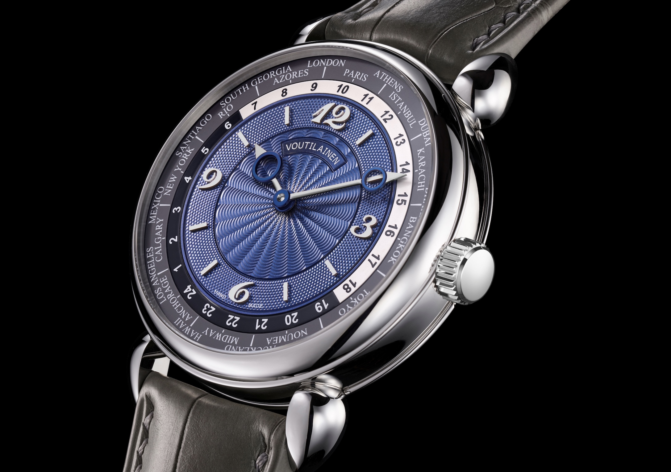 Inspirée par la philosophie de longévité, de précision et de tradition horlogère classique alliée à l’innovation qui anime l’atelier Voutilainen, la 216TMZ est dotée d’un mouvement entièrement intégré doté d’une complication heures universelles. Alliant esthétique raffinée et fonctionnalité pratique pour le voyageur contemporain, cette montre traverse les fuseaux horaires en toute fluidité. De son cadran guilloché main avec des appliques arabes en or à son calibre minutieusement décoré, en passant par son boîtier à la fois robuste et élégant, elle incarne la beauté intemporelle, la maîtrise technique et un véritable esprit d’exploration. Le mouvement 216TMZ a été conçu pour accueillir de nouvelles fonctions occupant l’intégralité de la surface de la platine côté cadran, sans augmenter de manière significative l’épaisseur du mouvement. Pour ce faire, l’échappement a été subtilement affiné, tout en préservant pleinement ses performances et sa fiabilité d’origine. La montre est dotée d’une complication heures universelles, un mécanisme sophistiqué permettant de lire aisément l’heure simultanément dans les principales villes du monde. Son utilisation est d’une grande simplicité : il suffit d’appuyer sur la couronne pour faire avancer, à chaque pression, l’aiguille des heures, le disque 24 heures avec indication jour/nuit ainsi que le disque des villes, tous parfaitement synchronisés. La ville située à 12 heures devient la référence pour l’heure locale, sans que les minutes ne soient affectées. Pendant ce temps, toutes les autres villes indiquées sur le disque affichent automatiquement l’heure exacte de leur fuseau horaire respectif. Le disque des villes, tout comme le cadran, peuvent être personnalisés selon les souhaits du client, faisant de chaque montre une création véritablement unique.