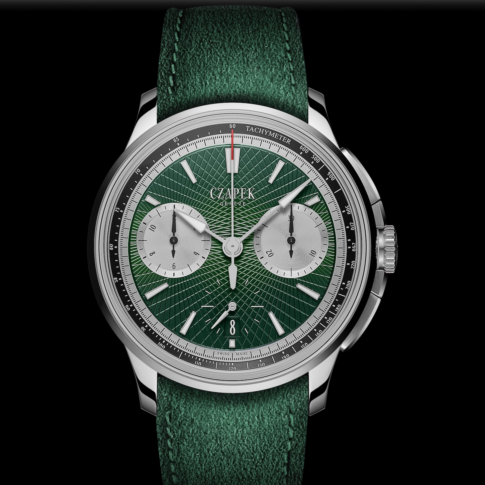 Aujourd’hui, malgré la généralisation des aides électroniques permettant de connaître sa vitesse instantanée, cet affichage demeure parmi les plus appréciés des amateurs. Sa présence a ainsi imposé de réduire le diamètre du cadran sur lequel se développe le guillochage. Toutefois, afin de lui conserver des proportions harmonieuses, les compteurs de temps chronométré sur 30 minutes et sur 12 heures ont été retravaillés. Décaissés par rapport à la surface, leur périphérie a été diamantée et leur centre a fait l’objet d’un discret azurage circulaire. Ces traitements, complexes à réaliser, surtout lorsque le cadran est guilloché, confèrent à ce dernier à la fois une présence forte autant qu’une excellente lisibilité. Présent encore à 6 h : le très sobre indicateur de seconde permanente qui se fond dans le décor, tout comme le guichet de quantième dans lequel se lit la date à saut semi-instantané. Le guillochage du cadran du chronographe Faubourg de Cracovie « Crossroads » Victory Green est une fois encore réalisé par un des cadraniers et partenaires historiques de la maison : Metalem. Comme pour les deux dernières versions de ce chronographe, une réinterprétation du guillochage « Double Soleil » créé pour les modèles Quai des Bergues 40,5 mm a été ici privilégiée. Pour la collection Faubourg de Cracovie, le motif est toutefois plus droit et plus profondément gravé afin d’évoquer le « profil » d’un pneu de voiture de sport. Ce décor se veut aussi une allusion subliminale au fait que Czapek se place, dans le métier, à la croisée de la tradition et de la modernité. Ce guillochage, avec sa teinte « Victory Green » obtenue par traitement PVD, voit donc son design contemporain évoluer en fonction des différents angles d’observation, ce qui contribue à renforcer la lisibilité en ne reflétant pas la lumière incidente.
