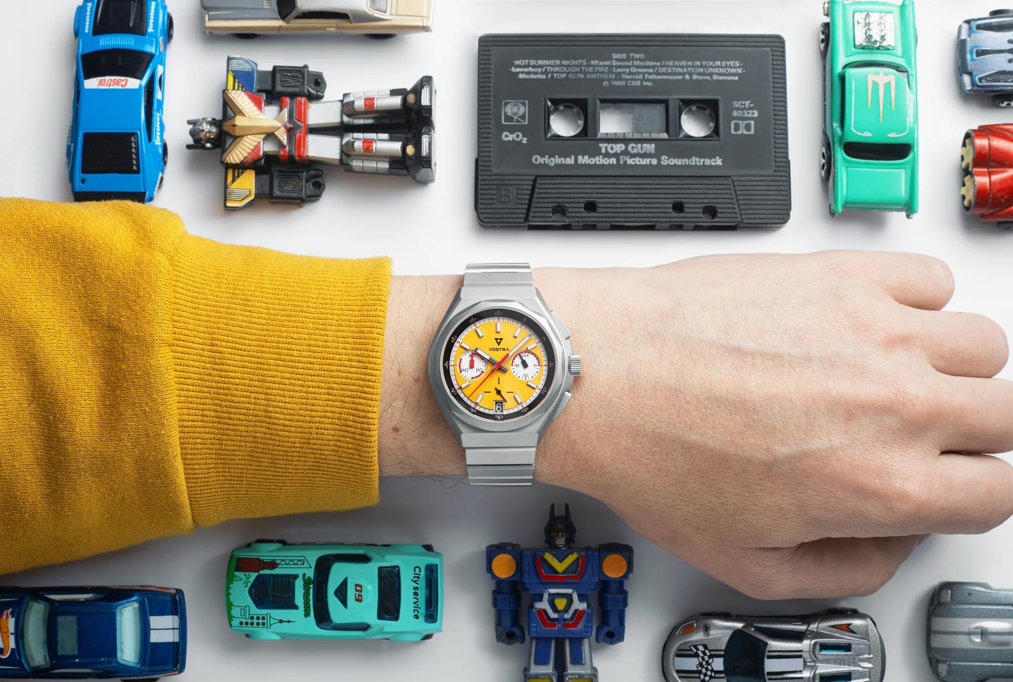 UN COMMENTAIRE ? En bleu (Atomic bleue), en gris (Gamma gris) ou en jaune (Electro Yellow), c’est beaucoup de plaisir pour une montre relativement accessible (moins de 280 dollars sans les taxes), avec un bracelet en acier et bracelet intégré à maillons métalliques, trois compteurs sur le cadran, deux poussoirs sur la carrure et un mouvement méca-quartz Seiko VK63. Rien de tout ceci ne se prend au sérieux, mais porter une Vector de Vostra peut finir par déclencher une très sérieuse envie de montres plus sérieuses…