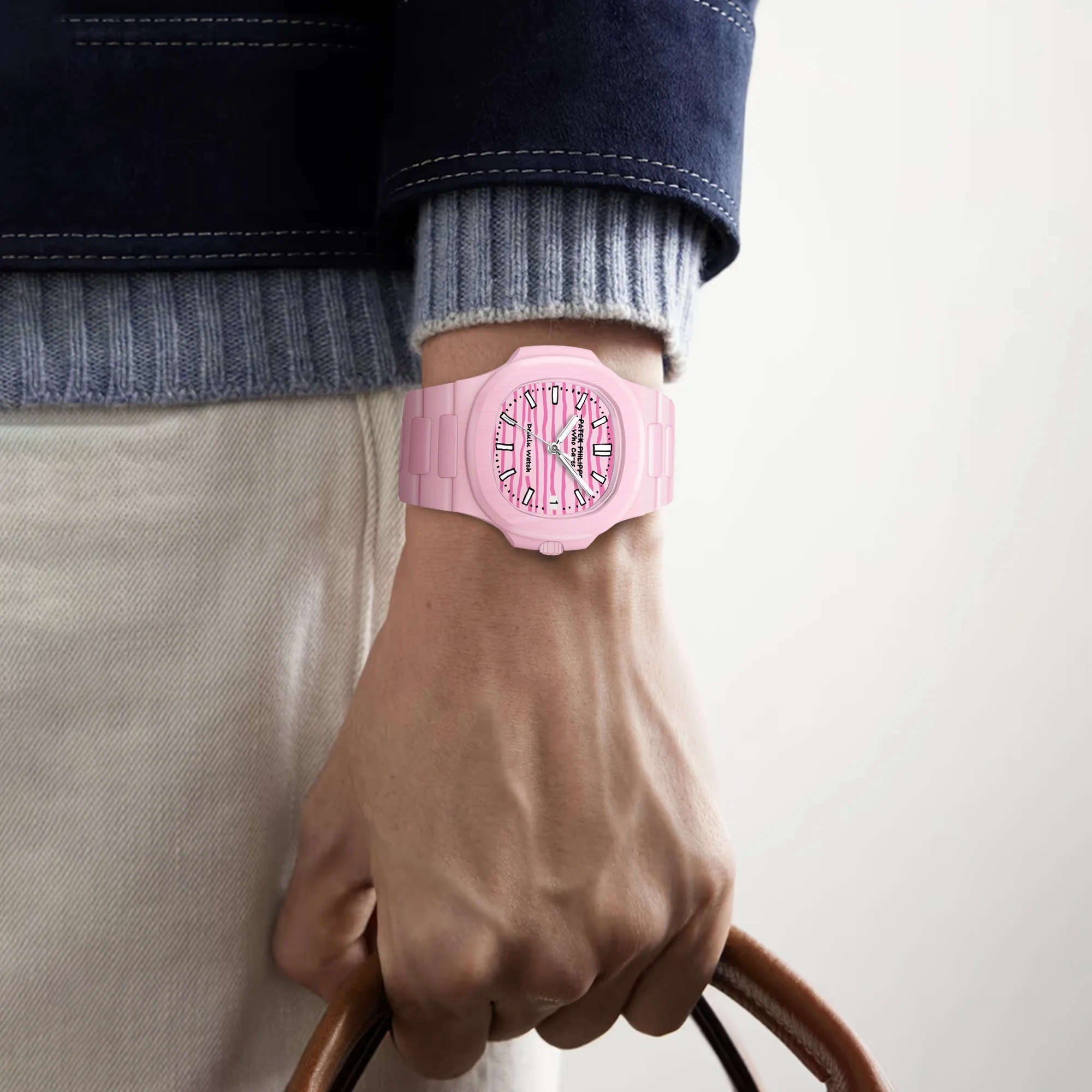 Rose vif, aucune règle — porte-le simplement à ta façon. Un cadran amusant et irrégulier imprimé avec « Who cares » et « Delulu Watch ». Léger, audacieux et immédiatement remarquable — ajoutant humour et personnalité aux tenues quotidiennes. Fabriqué en céramique rose—léger, lisse et très résistant aux rayures. La couleur et la brillance durables le rendent à la fois robuste et élégamment ludique. Précisément façonné et finement fini, le boîtier en céramique offre une texture douce et chaleureuse avec des contrastes mats subtils—créant un rythme et une présence uniques sous tous les angles. Conçu avec un cristal de saphir anti-rayures et antireflet pour une clarté et une durabilité exceptionnelles. Conçu pour la vie quotidienne — résistant aux éclaboussures et prêt pour toutes les routines. Parfait pour le streetwear, les looks café ou les tenues de voyage. Un accent rose ludique qui rend chaque style plus mignon, audacieux et expressif. Nous ne sommes pas nés des institutions horlogères traditionnelles. Nous sommes nés en les remettant en question. Dans une industrie obsédée par l'héritage et l'autorité, nous nous concentrons sur les matériaux, la structure et la liberté de création. Nous croyons qu'une montre doit refléter qui vous êtes — et non pas qui vous êtes censé admirer.