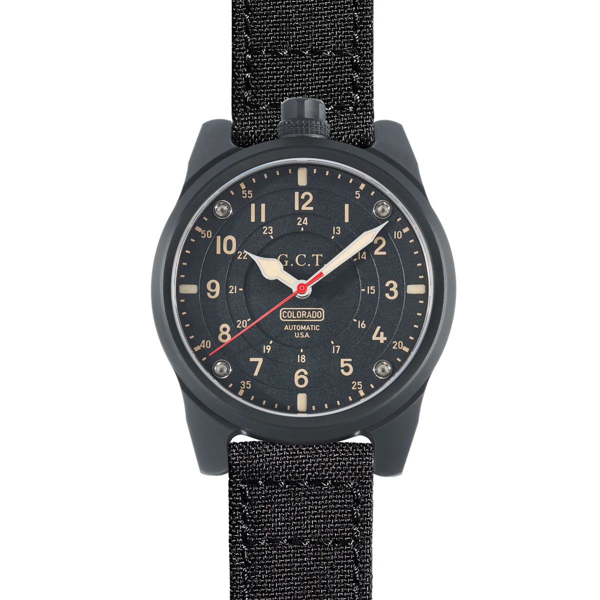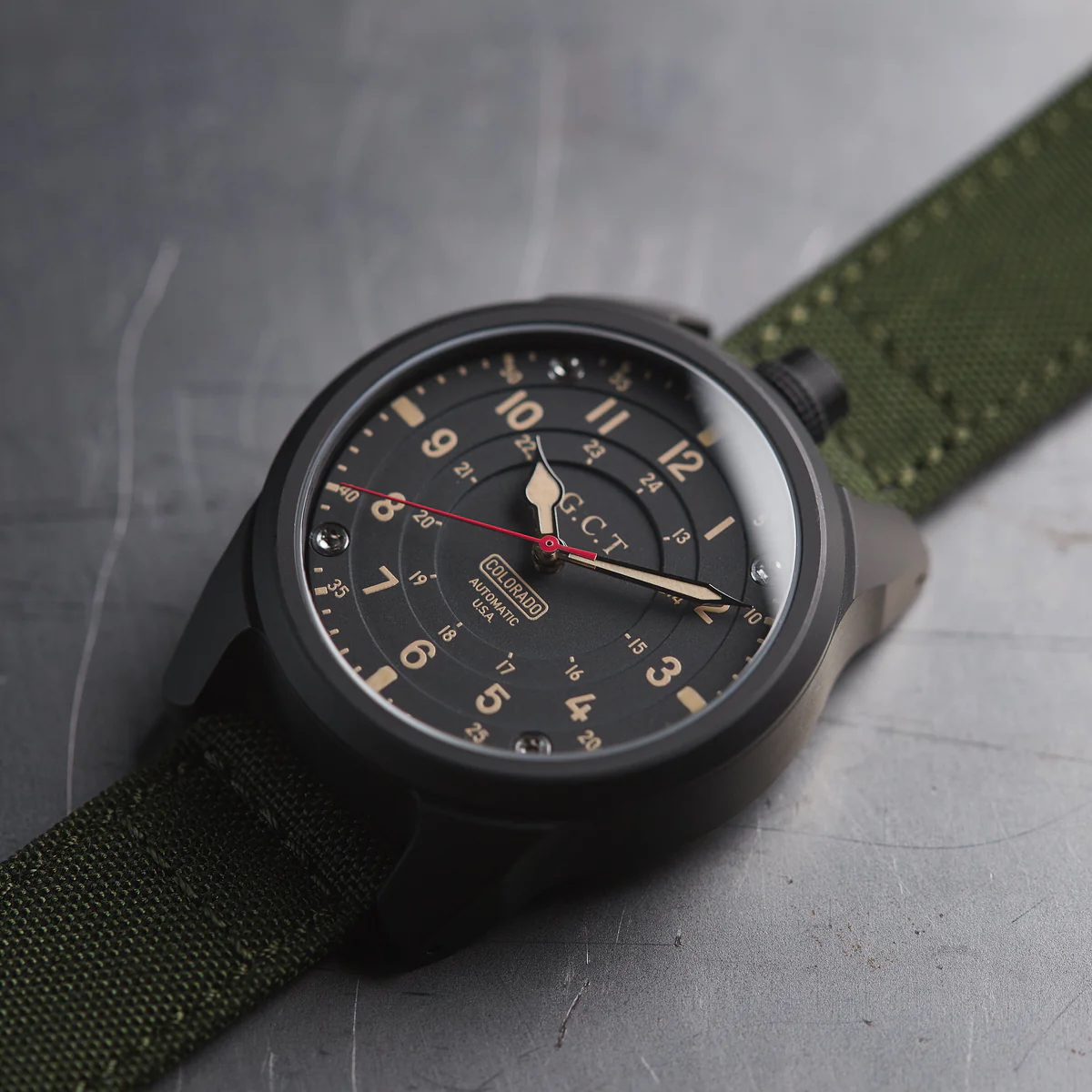 Le boîtier en acier inoxydable de 42 mm de diamètre et 13 mm d'épaisseur a été découpé dans un bloc de métal au Colorado. Nous avons travaillé la couronne pour la rendre facile à remonter et à visser (pour augmenter l’étanchéité) ! The GCT dispose d'un mouvement automatique avec 42 heures de réserve de marche, de sorte que vous n'aurez pas à le remonter souvent, mais vous voudrez peut-être le faire, car c’est très agréable... Faire des cadrans de montre est extrêmement difficile. Nous avons découvert en le faisant pourquoi personne d'autre ne le fait à grande échelle aux États-Unis. Après des centaines de prototypes, nous avons compris : le cadran GCT est découpé en aluminium ici à Fort Collins, Colorado, et un revêtement noir au carbone semblable à un diamant est appliqué par un fournisseur avant qu'il ne soit imprimé ici en interne. Nous avons même creusé des découpes dans ce cadran pour pouvoir appliquer le composé luminescent à la main. Nous avons parcouru le pays à la recherche des meilleurs fournisseurs de verre et après des années de recherche, nous avons trouvé quelqu'un pour fabriquer du verre saphir pour nous dans le New Hampshire. Jusqu'à présent, nous n'avons pu trouver que des verres plats fabriqués aux États-Unis, de sorte que le GCT a un verre saphir américain plat à l'arrière et un verre saphir étranger bombé à l'avant. Ces verres saphir protègent le cadran et le mouvement à l'intérieur de la montre tout en étant presque parfaitement clairs afin que vous puissiez voir toute la beauté à l'intérieur. Nos bracelets sont fabriqués en Cordura, un matériau de toile synthétique particulièrement durable que l'armée a utilisé pour sa solidité. Chaque montre est livrée avec un bracelet noir et notre boucle en acier inoxydable usiné en interne. Les bracelets Cordura ont une barrette à changement rapide, ce qui facilite le remplacement du bracelet. Vous pouvez ajouter un bracelet vert ou kaki à dégagement rapide (20 mm). Les bracelets en Cordura et les boucles de nos sangles supplémentaires (gratuites) sont fabriqués à l'étranger pour l'instant, mais nous espérons trouver un fournisseur national de Cordura et augmenter bientôt notre fabrication de boucles.