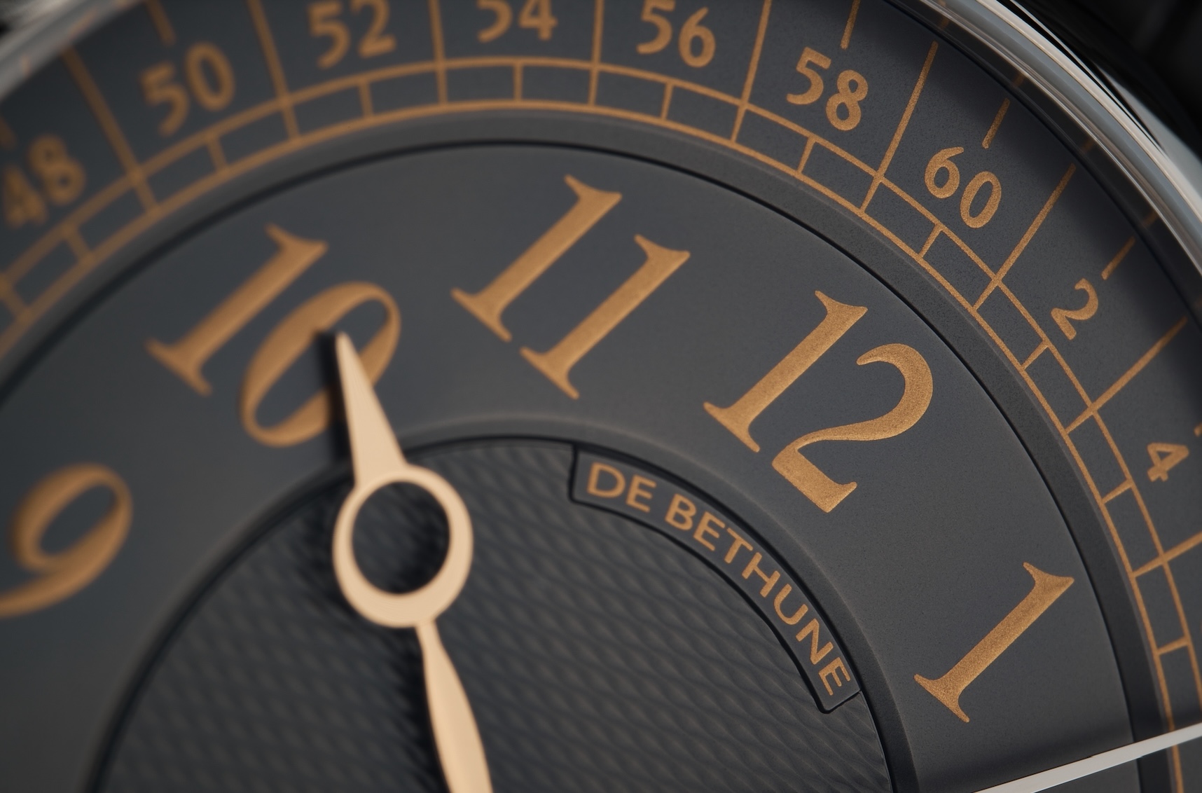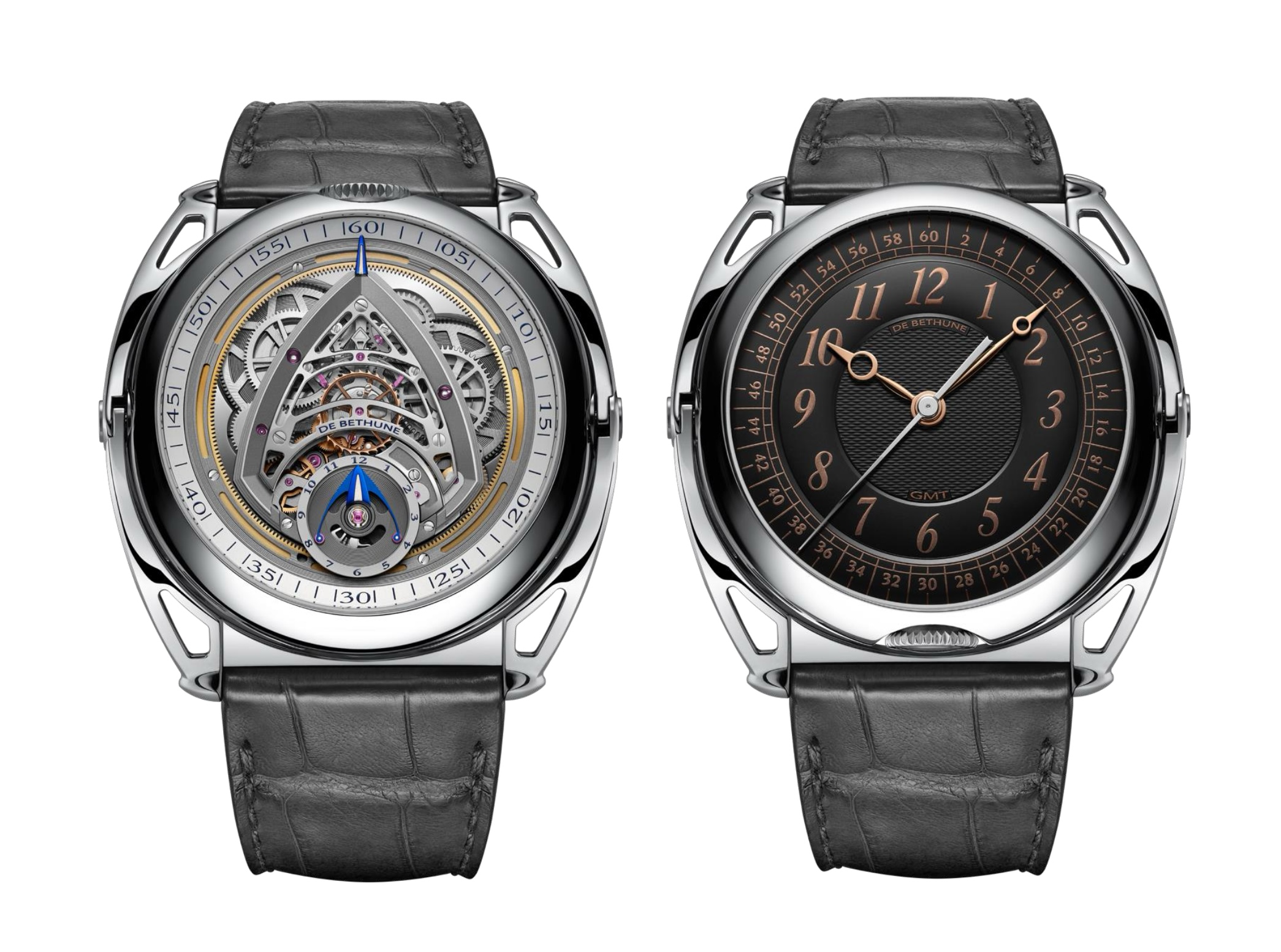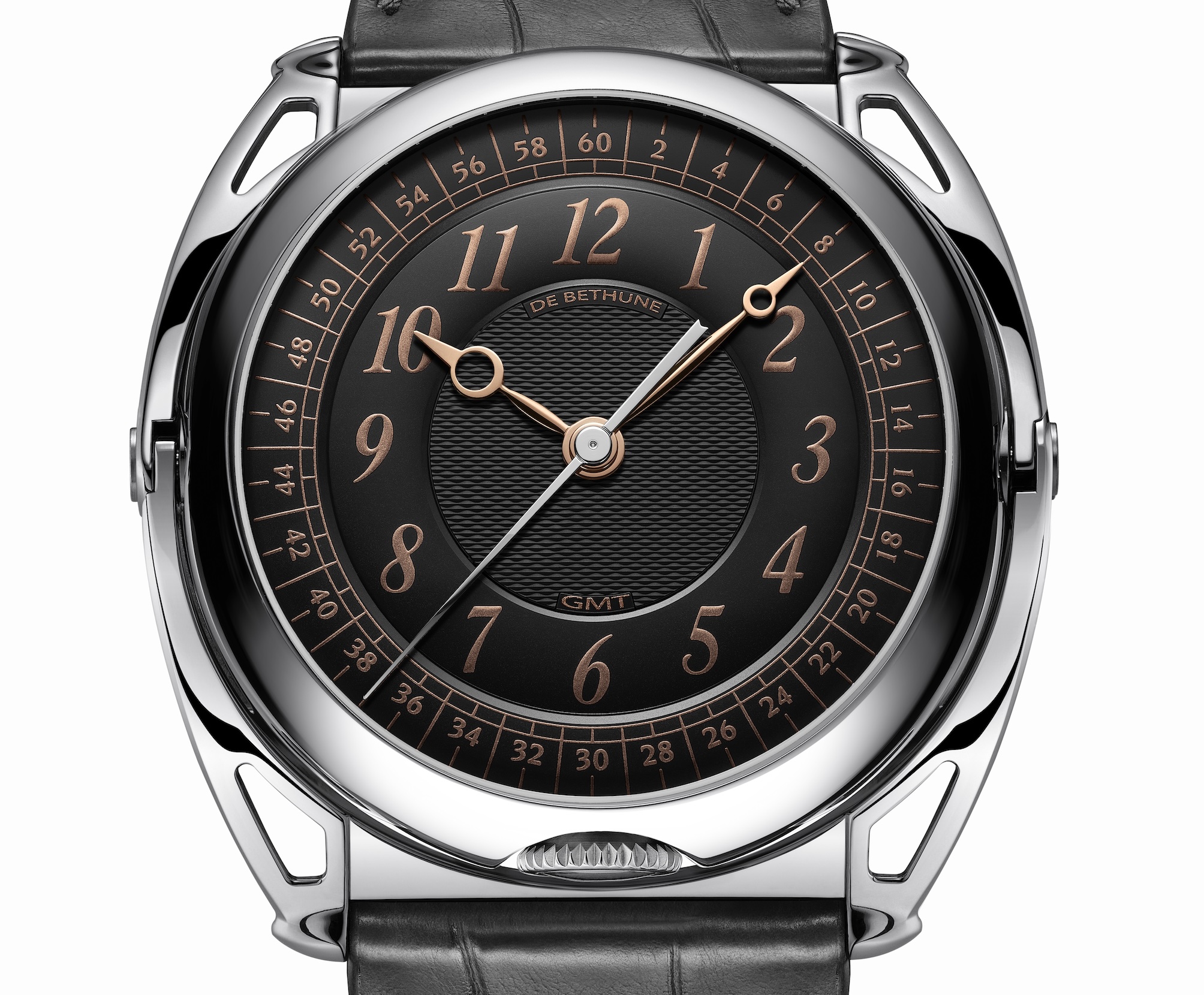 Face classique : l’affichage du GMT. Le verso, d’inspiration classique, présente un cadran anthracite bombé, guilloché en son centre, offrant une lecture sobre de l’heure. Les aiguilles galbées en or 5N, polies à la main, s’accordent délicatement aux index dorés. L’indicateur en titane poli m élégance le saut mécanique des secondes. Un réglage astucieux et simplifié : bien que la conception soit complexe, son utilisation est très simple. L’agencement des fonctions repose sur un double affichage recto/verso pour les heures et les minutes. À l'aide de la couronne en position 3, le collectionneur règle son heure de référence appelée heure du domicile, indiquée par les aiguilles des heures et des minutes de la face contemporaine. Il met à l’heure son second fuseau horaire en tirant la couronne en deuxième position sur la face GMT classique. Symbole de polyvalence et de créativité, cette montre à deux visages manifeste l’excellence technique de De Bethune et le remarquable travail des artisans sur les matières, les couleurs et la lumière. Son double affichage, opposant une identité contemporaine à une identité classique, traduit l’harmonie entre tradition et modernité. L’ensemble repose sur un bracelet souple doublé en alligator.