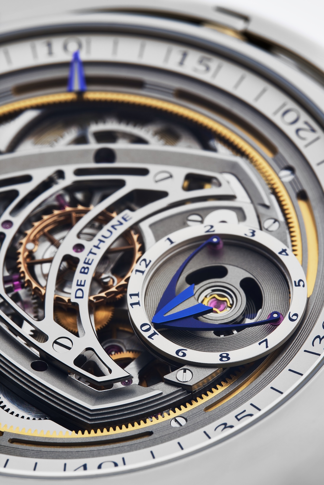 UN COMMENTAIRE ? Cette De Bethune DB King of Two Jumping GMT est une des plus belles créations contemporaines de la marque, mais également de toute la haute horlogerie suisse – ceci dans à peu près tous les compartiments du jeu mécanique, esthétique ou technique. Difficile de prendre Denis Flageollet en flagrant délit de conformisme ! Bien évidemment, l’excellence se paie et il faut compter dans les 230 000 euros pour ce simple boîtier en titane à double cadran, relativement svelte en dépit de sa taille (43,3 mm x 11,4 mm d’épaisseur), étanche à 30 m – ce qui est insuffisant – et animé par un mouvement à remontage manuel dont le double barillet propose quatre jours de réserve de marche (double affichage recto-verso des heures et des minutes, secondes sautantes et second fuseau horaire). L’architecture du cadran sait se faire à la fois néo-classique (face GMT) et avant-gardiste, avec une pointe de baroquisme, sinon de maniérisme architectural sur la face dite « contemporaine » (balancier à six heures, minutes périphériques)…
