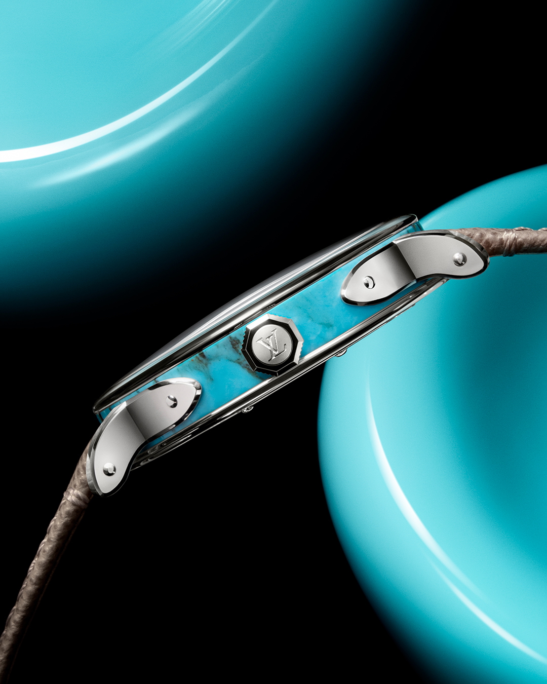 Le fond de boîte transparent dévoile le calibre automatique LFT023 certifié chronomètre suisse de haute précision par l’Observatoire de Genève, dévoilé il y a deux ans. Le micro-rotor en or rose 22 carats à haute inertie assure au mouvement une réserve de marche de 50 heures. Le contraste entre les surfaces microbillées et les chanfreins polis du calibre LFT023 font écho au choix judicieux de textures dans l’ensemble de la montre. Les saphirs transparents, signature emblématique du mouvement, apportent un effet d’élégance et de cohérence. Un dernier détail visuel subtil n’apparaît qu’au dos de la montre. Comme le veut la tradition dans l’univers horloger, une petite pierre précieuse indique l’utilisation de platine dans la montre. Sur les Escale Malachite et Turquoise, il s’agit d’un saphir couleur safran, teinte emblématique associée à la Maison. Ces deux nouveaux garde-temps Louis Vuitton Escale ornées de pierres ornementales allient maîtrise technique et audace esthétique, définissant de nouveaux sommets de savoir-faire horloger chez Louis Vuitton. À travers un geste artisanal, ces pièces révèlent la beauté unique de la nature. Tels les trésors rencontrés par hasard au cours d’une escapade guidée par l’Art du Voyage, chaque montre détient la clé qui éveille notre sens de l’exploration et de l’émerveillement. Avec une Escale au poignet, chaque instant porte en lui la promesse d’une nouvelle découverte.