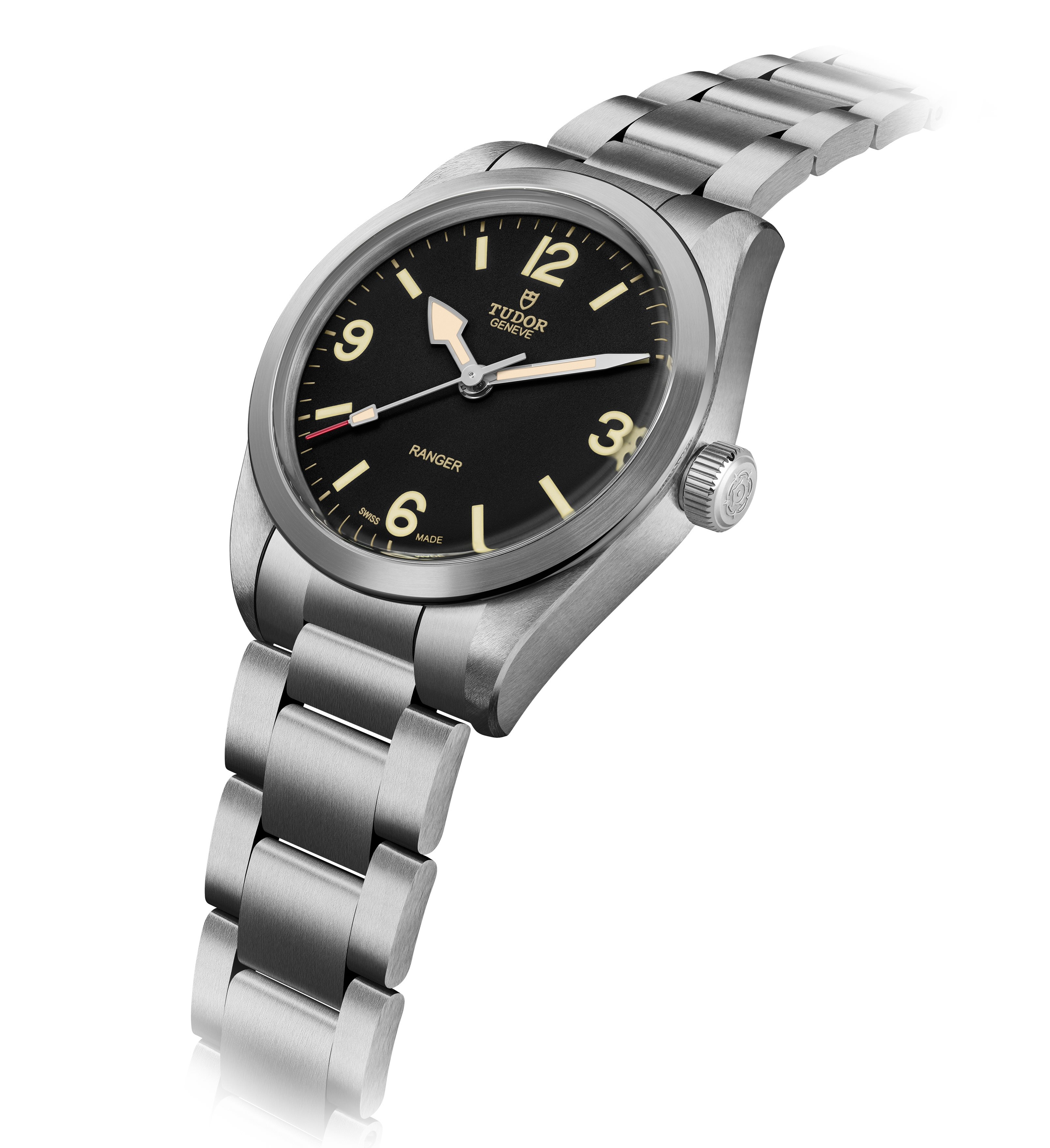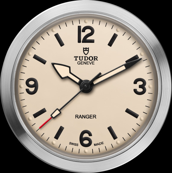 Il faut, pour trouver les origines de la famille Tudor Ranger, remonter à 1929. C’est en effet cette année‑là, trois ans après avoir fait déposer la marque « The Tudor », que Hans Wilsdorf fait enregistrer l’appellation « Ranger ». À l’époque, elle n’est pas utilisée pour désigner un modèle spécifiquement, mais plutôt pour ajouter une dimension aventurière à certaines montres de la collection Tudor . Il faut attendre les années soixante pour voir apparaître l’esthétique qui caractérise Ranger aujourd’hui encore. Une Tudor Ranger est en effet immédiatement reconnaissable à ses grands chiffres arabes généreusement surmontés de matière lumineuse à 3, 6, 9 et 12 heures de même que pour ses aiguilles au dessin unique. Proposée au cours de son histoire dans de nombreuses variations, avec et sans date, automatique ou à remontage manuel, avec le logo de la rose Tudor d’abord puis avec le bouclier ensuite, la Ranger est exécutée dès 1973 dans une version avec bracelet intégré sous l’appellation « Ranger II ». Le nouveau modèle Ranger respecte les standards esthétiques établis au cours de son histoire, en particulier un cadran avec chiffres arabes à 3, 6, 9 et 12 heures, tout en amenant des éléments techniques de pointe, notamment un Calibre Manufacture haute performance et un fermoir à ajustage rapide Tudor « T‑fit ». Il perpétue, au sein de la collection Tudor, la tradition de la montre d’expédition, née avec les montres Oyster Prince utilisées par les membres de la British North Greenland Expedition. La tradition d’un instrument robuste, pratique et accessible. Pour faire écho à cet héritage fonctionnel, le boîtier et le bracelet de la Ranger sont satinés, créant un rendu général mat, dans le plus pur esprit de la montre dʼexpédition. Quelques éléments sont quant à eux polis pour renforcer les lignes du boîtier, à l’image du pourtour de la lunette. Côté cadran, l’œil attentif ne manquera pas un détail d’inspiration historique : les index peints. De couleur beige ou noire, ils contrastent parfaitement avec l’arrière‑plan mat grené du cadran et sont coordonnés avec la tonalité du logo Tudor bouclier et des inscriptions. Les aiguilles en forme de flèche, arrondies pour les heures et angulaires pour les secondes, sont caractéristiques de l’esthétique Ranger, avec la signature Tudor: une extrémité de trotteuse traitée en bordeaux.