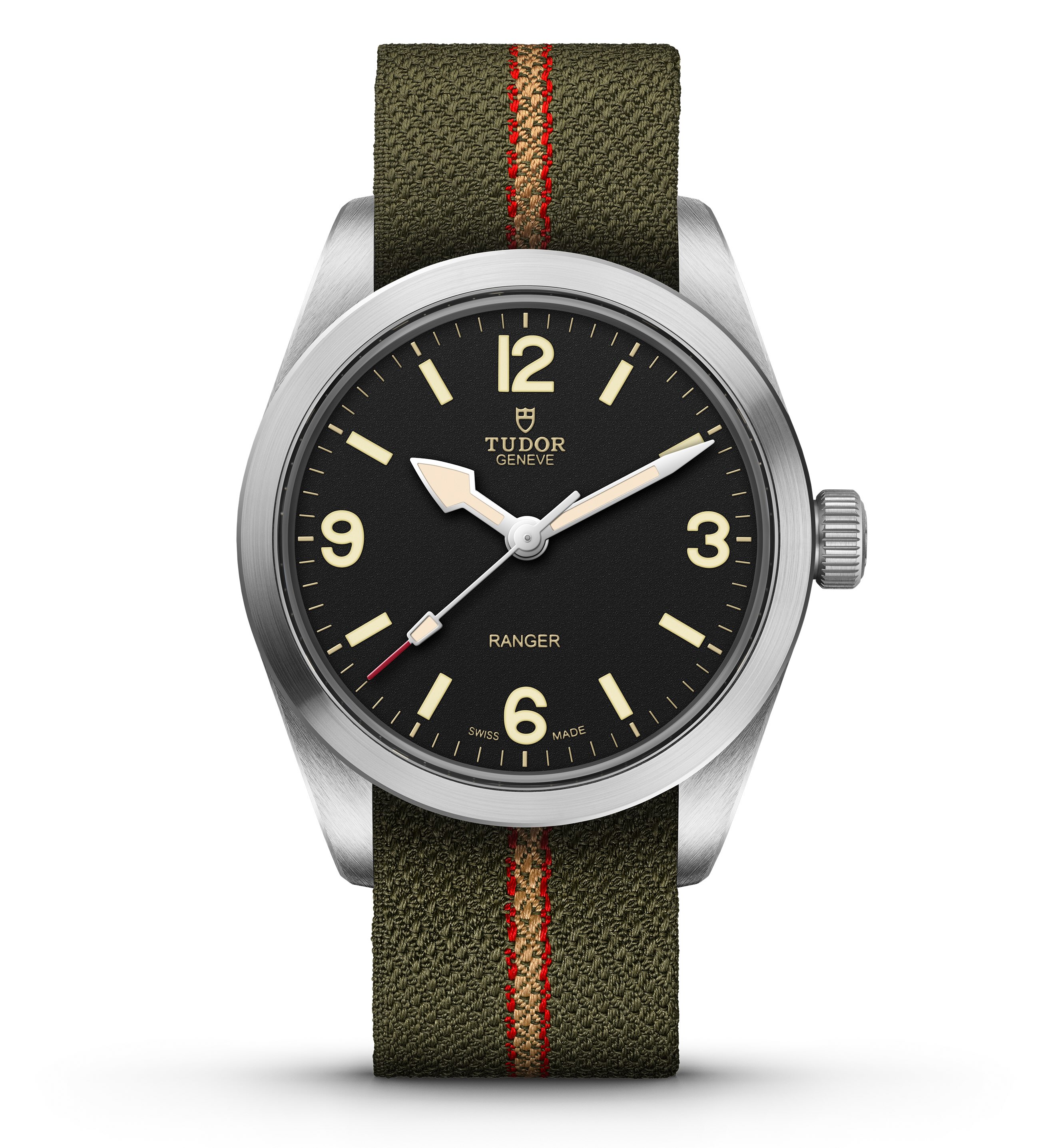 Les Calibres Manufacture MT5400 et MT5402 équipent respectivement les modèles Ranger de 36 mm et de 39 mm. Leur construction est pensée pour la robustesse, la longévité, la fiabilité et la précision, à l’image de leur balancier à inertie variable maintenu par un solide pont traversant à double point dʼancrage. Couplés à un spiral amagnétique en silicium, ces balanciers permettent aux Calibres Manufacture Tudor d’être certifiés chronomètres par le Contrôle Officiel Suisse des Chronomètres (COSC), avec des performances allant au‑delà des standards de cette institution indépendante. En effet, là où le COSC tolère une variation moyenne de marche journalière de –4 à +6 secondes par rapport au temps absolu sur un mouvement seul, Tudor s’impose –2 à +4 secondes de variation sur la marche de la montre entièrement assemblée. Autre élément notable, la réserve de marche des Calibres Manufacture Tudor est dite « weekend‑proof », soit de 70 heures environ, ce qui permet au porteur de poser sa montre le vendredi soir et de la reprendre le lundi matin sans devoir la remonter.La Ranger est proposée sur un bracelet en acier entièrement satiné, avec fermoir équipé du système d’ajustement rapide de la longueur Tudor « T‑fit ». Facile d’utilisation, ne nécessitant pas d’outil et proposant cinq positions, ce dispositif pratique permet au porteur de la Ranger d’effectuer lui‑même un réglage fin et instantané sur une fenêtre d’ajustage de la longueur totale du bracelet de 8 mm. Un bracelet en tissu dʼune seule pièce dans les tons terre est également proposé sur les modèles Ranger. Tissé de manière artisanale sur des métiers Jacquard à navette du XIXe siècle par l’entreprise Julien Faure dans la région de Saint‑Étienne, en France, sa qualité, sa robustesse et son confort au porter sont uniques.