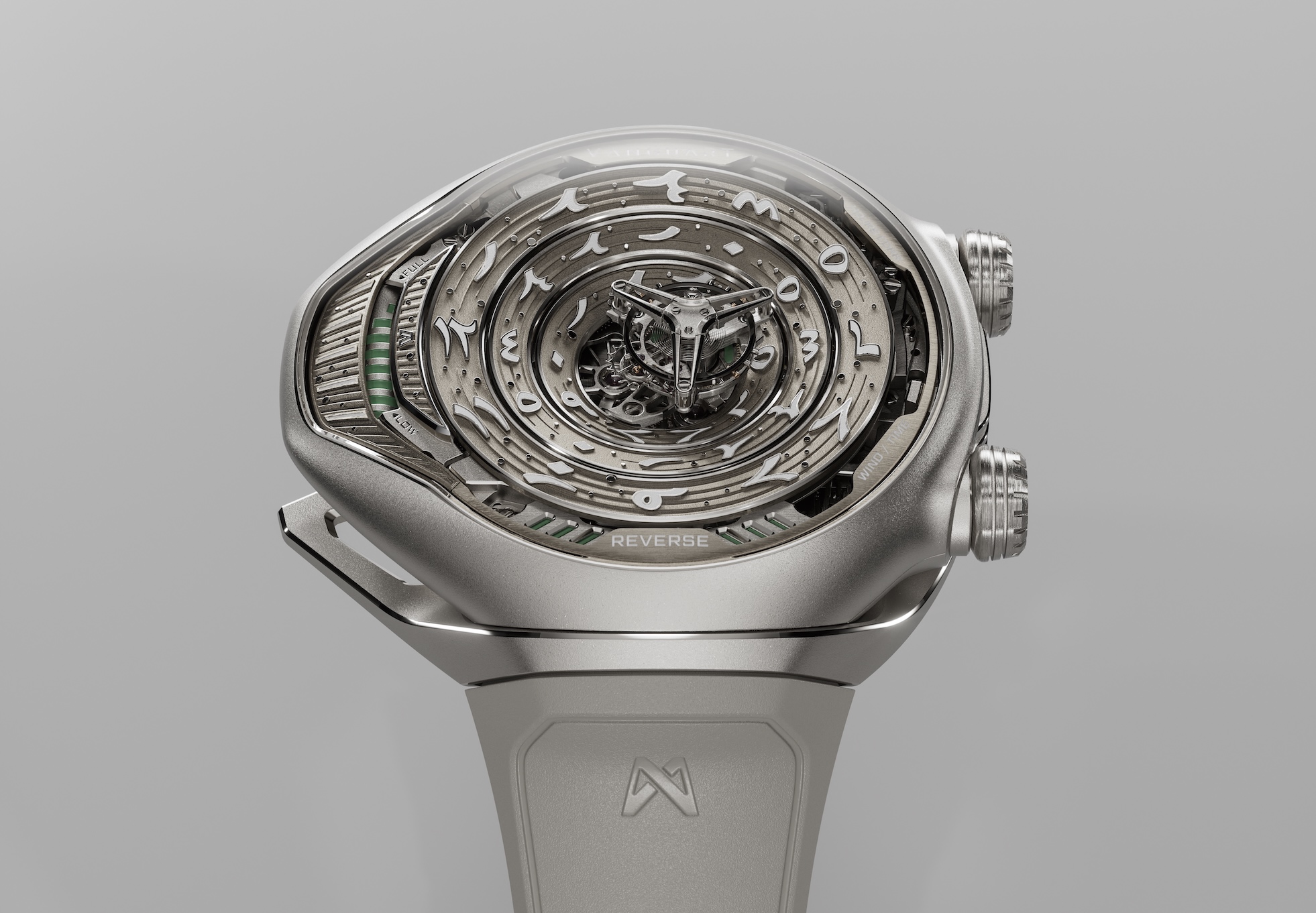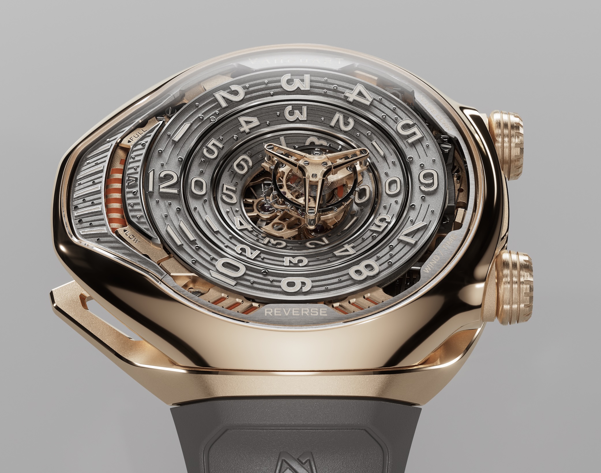 UN COMMENTAIRE ? On est ici dans la pointe la plus avancée de l’avant-garde la plus ultime de la nouvelle génération des marques horlogères, avec des prix assortis à ce positionnement hors normes (il faut compter 355 000 francs suisses pour la version en chiffres arabes et 410 000 francs pour la version en or rose). À ces altitudes commerciales extrêmes, l’atmosphère est raréfiée et mieux vaut prévoir des séries très limitées : pour ces tourbillons volants lévitants à cadrans automate sur trois niveaux et affichage linéaire (boîtier en titane microbillé/satiné ou en or rose de 45 mm x 15,7 mm d’épaisseur, avec un mouvement à remontage manuel de 775 composants offrant 42 heures de réserve de marche), chaque série limitée ne comporte que huit pièces. Le dispositif à gauche du boîtier est une réserve de marche verticale. Deux propositions très sympathiques, aussi rupturistes qu’intéressantes à découvrir, pour lesquelles on espère qu’il y a encore des collectionneurs assez audacieux pour apprécier ces avancées esthético-mécaniques…