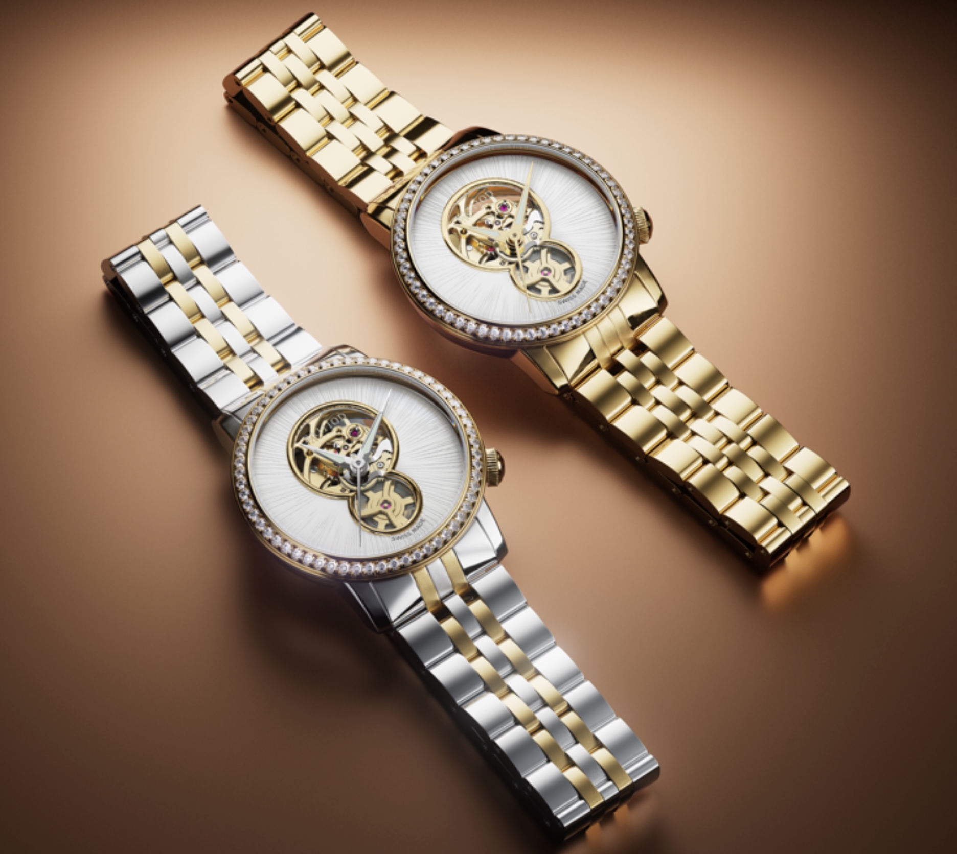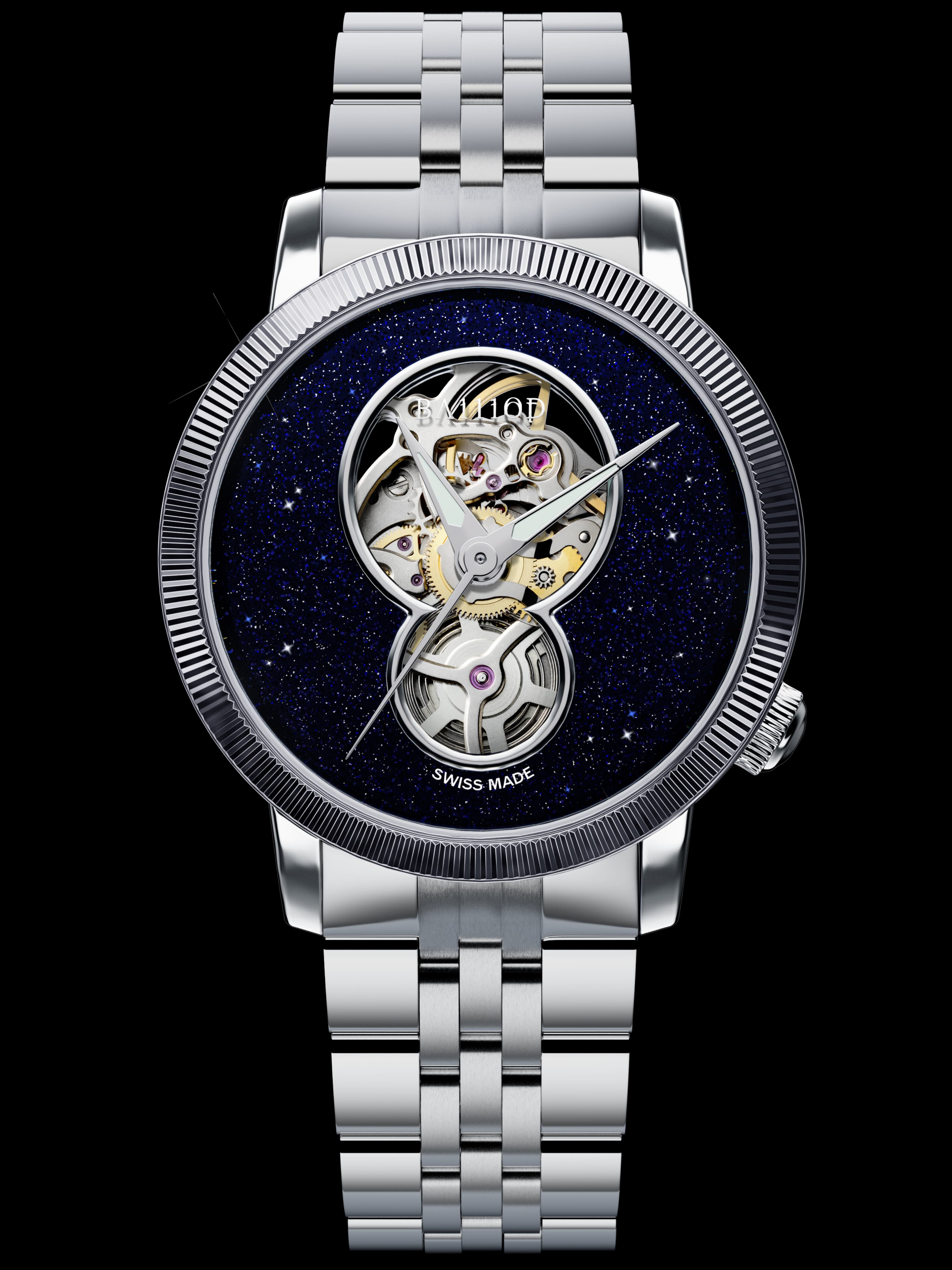 Au cœur bat un mouvement automatique Soprod P024 Squelette Swiss Made doté d’une réserve de marche de 38 heures, visible à travers l’architecture semi-ouverte du cadran et à nouveau par le fond transparent. La lecture est nette grâce au verre saphir avec double traitement antireflet. Le boîtier de 36 mm affiche une épaisseur de 10,5 mm hors verre, une couronne à 4 heures gravée du logo Ba111od et une étanchéité de 3 ATM. Il se décline avec un choix de lunettes : finement cannelée ou sertie de diamants pour encore plus d’éclat. Les cadrans se parent d’aventurine ou de finitions soleillées texturées. Les autres teintes existanntes sont désormais disponibles également en version bracelet — bleu, menthe, gris et champagne. La montre se présente sur un bracelet à cinq maillons en acier 316L – disponible en acier, bicolore ou PVD or 2N – avec boucle déployante papillon, parfaitement compatible avec notre système easy-clip pour alterner acier, satin ou cuir selon l’occasion.
