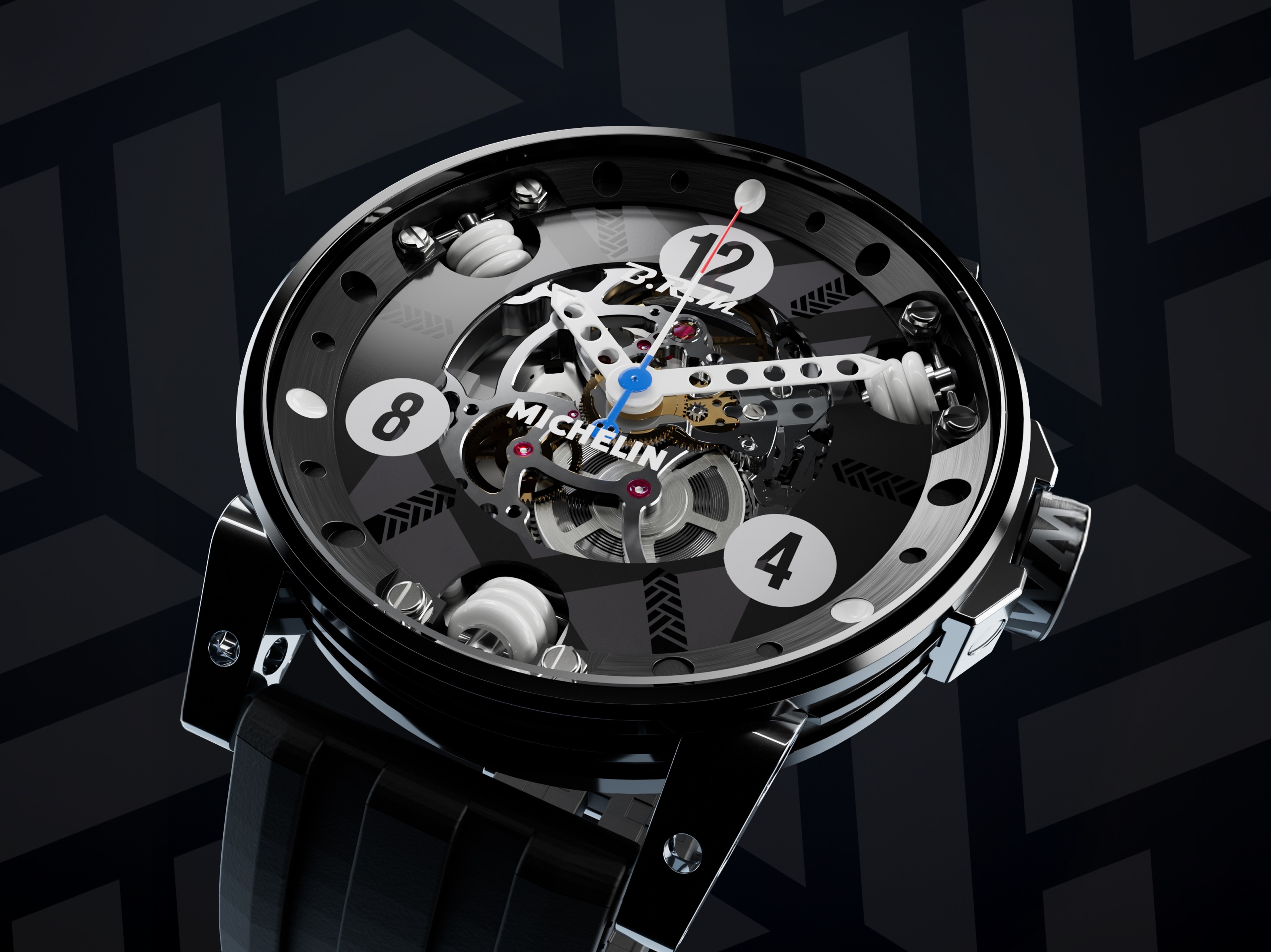 La montre est montée sur un bracelet en caoutchouc noir, qui renforce son confort et son style sportif. Le cadran, squelette ou plein, intègre discrètement la silhouette du pneu Michelin historique, symbole d’empreinte laissée sur le temps comme sur la route. Sur la version cadran plein, le guichet de date est placé à 6h00, tandis que la version squelette, laisse apparaître le mouvement automatique de la montre. La couronne, inspirée du pneu « M » de 1919, souligne le lien entre l’horlogerie et l’univers du pneumatique. Le numéro de la série limitée y est gravé. Les ressorts traditionnels laissent place à trois silent-blocs blancs, évoquant Bibendum, qui absorbent les chocs pour assurer un fonctionnement précis et fiable. Enfin, la trotteuse tricolore met en avant l’excellence du savoir-faire français partagé par les deux maisons. Ce partenariat inédit s’inscrit dans l’ADN partagé des deux marques : la performance, l’innovation et la passion du sport automobile. De la piste à l’atelier, les mêmes valeurs guident les ingénieurs, les horlogers et les pilotes : précision, endurance, excellence du geste. À l’image des pneus haute performance qui font gagner de précieuses secondes sur les chronos des circuits les plus exigeants, les montres B.R.M Chronographes incarnent la maîtrise du temps avec la rigueur et la robustesse d’un moteur de compétition. « Cette série de montres n’est pas seulement un objet de mesure du temps, c’est une trace laissée dans l’histoire, comme le “M” de 1919 sur les routes du monde entier » (Bernard Richards, CEO B.R.M Chronographes). « C’est avec une immense fierté que nous avons collaboré avec les équipes de BRM pour concevoir cette montre. En la développant, nous honorons notre héritage et soulignons que Michelin, depuis sa création, est une véritable source d’innovation, année après année, pour une meilleure mobilité » (Alexandre Simonin, Head of Michelin licensing Europe & AIM).