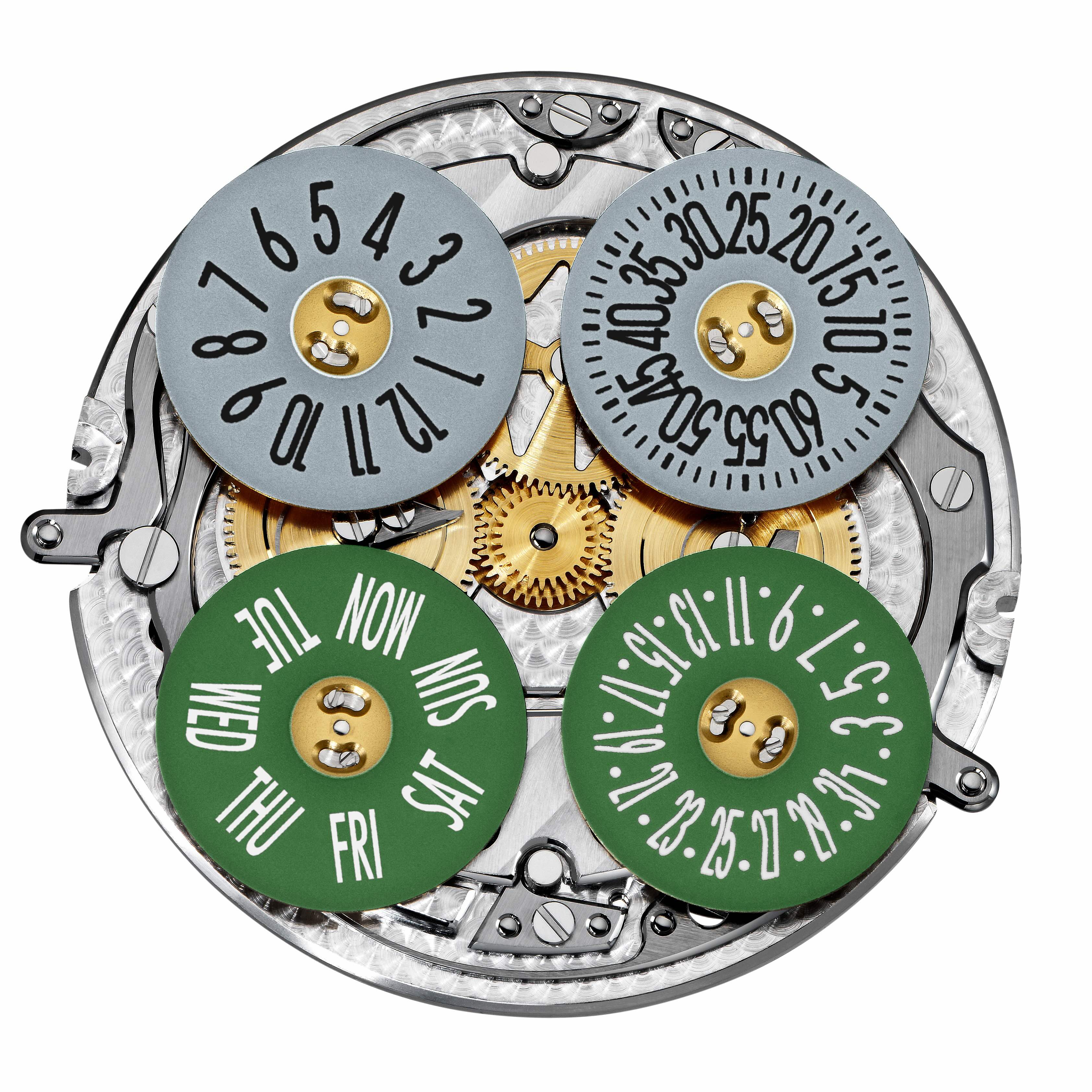 cheval et le rocher sont sculptés en or blanc ou en or rose 750/1000 par le maître graveur. Celui-ci façonne avec une extrême minutie des détails tels que la crinière et la queue de l’animal qui sont ensuite patinés à la main pour en accentuer les volumes et les textures. Les nuances chromatiques sont quant à elles soulignées par la peinture miniature sur émail. À elle seule, la réalisation de ce motif requiert trois jours d’un travail méticuleux. Pour le fond du cadran, deux techniques d’émaillage sont associées : l’émail grand feu en dégradé de plusieurs couleurs, qui évoluent de teintes plus claires au centre vers des tons légèrement plus soutenus en périphérie, et la peinture miniature sur émail destinée au décor végétal. Les couleurs sont appliquées en couches successives à l’aide d’un pinceau extrêmement fin. La plaque du cadran est ensuite cuite à plus de 800 °C, opération répétée autant de fois que nécessaire pour obtenir la palette complète de couleurs du motif et l’intensité de ton recherchée. Deux semaines de travail sont nécessaires pour accomplir l’émaillage du cadran. Dernier détail, les fonds colorés des indications affichées en périphérie dans les quatre guichets reprennent les nuances émaillées du cadran. L’édition limitée à 25 exemplaires en or rose est assortie d’un bracelet en cuir d’alligator brun, tandis que la version en platine, également limitée à 25 pièces, se pare d’un bracelet en alligator bleu.
