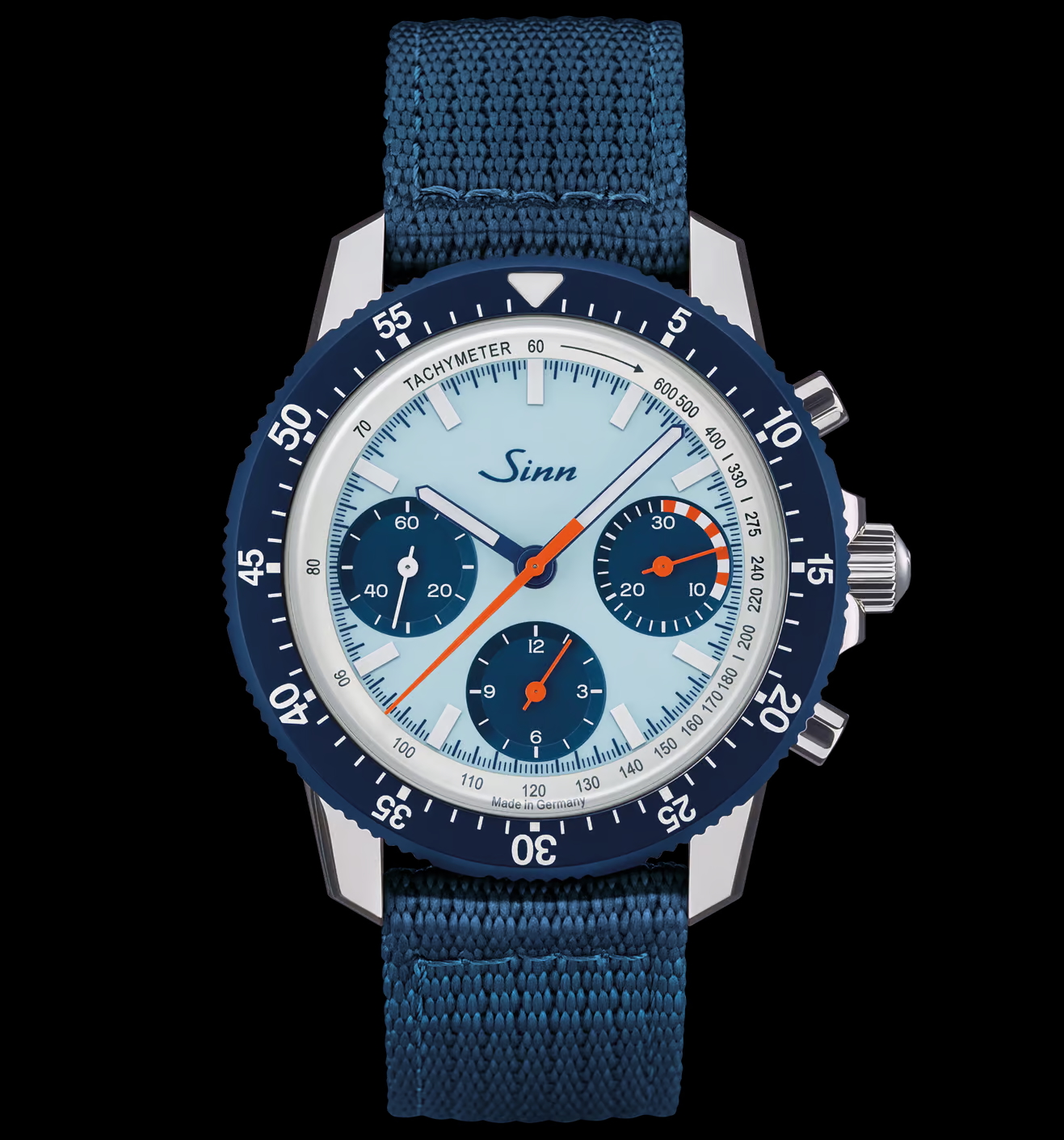 Les toolwatches et en particulier les chronographes d’aviateur, comme les modèles emblématiques de la série 103, marquent la collection de Sinn Spezialuhren depuis le milieu des années 1960. La forme classique du boîtier, axée sur la fonctionnalité et la lisibilité, séduit les passionnés d’horlogerie depuis des décennies. Depuis nos débuts jusqu’à aujourd’hui, nous avons développé de nombreuses technologies pour nos montres-bracelets haut de gamme, suivies avec attention par le magazine spécialisé Armbanduhren. De ce partenariat de longue date et couronné de succès est née une montre exceptionnelle : l’édition spéciale 103 St Sa Ty Hd H. Équipée d’un mouvement classique à remontage manuel et d’un verre saphir inrayable sur les deux faces, elle associe des valeurs historiques au savoir-faire horloger le plus moderne. Un détail particulièrement fascinant : grâce au fond transparent, la mécanique raffinée du mouvement à remontage manuel, dépourvu de masse oscillante, peut être admirée dans les moindres détails – un véritable plaisir pour tout amateur de montres traditionnelles. Le cadran bleu clair brillant avec ses compteurs bleu foncé satinés suit la disposition tricompax classique. Le résultat est un design harmonieux, alliant parfaitement élégance et fonctionnalité. Les aiguilles orange des secondes et des minutes du chronographe apportent des accents marquants. Associées à l’échelle des minutes du chronographe, alternant blanc et orange pour les dix premières minutes, elles garantissent une lisibilité optimale.