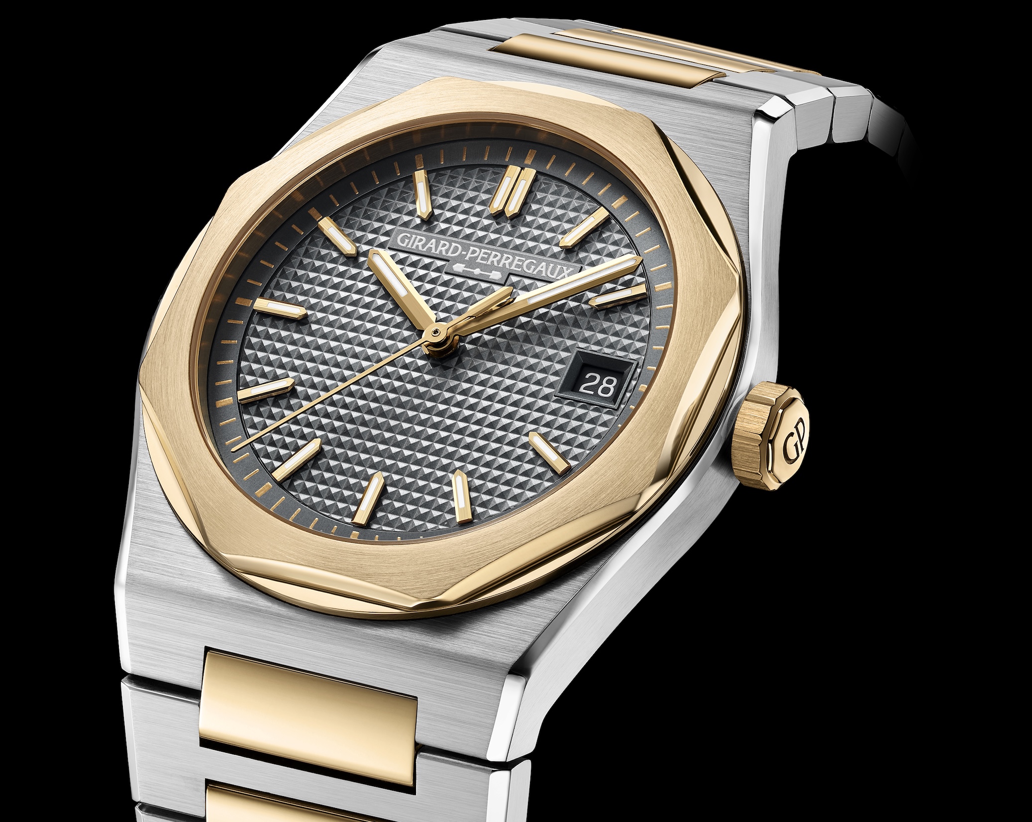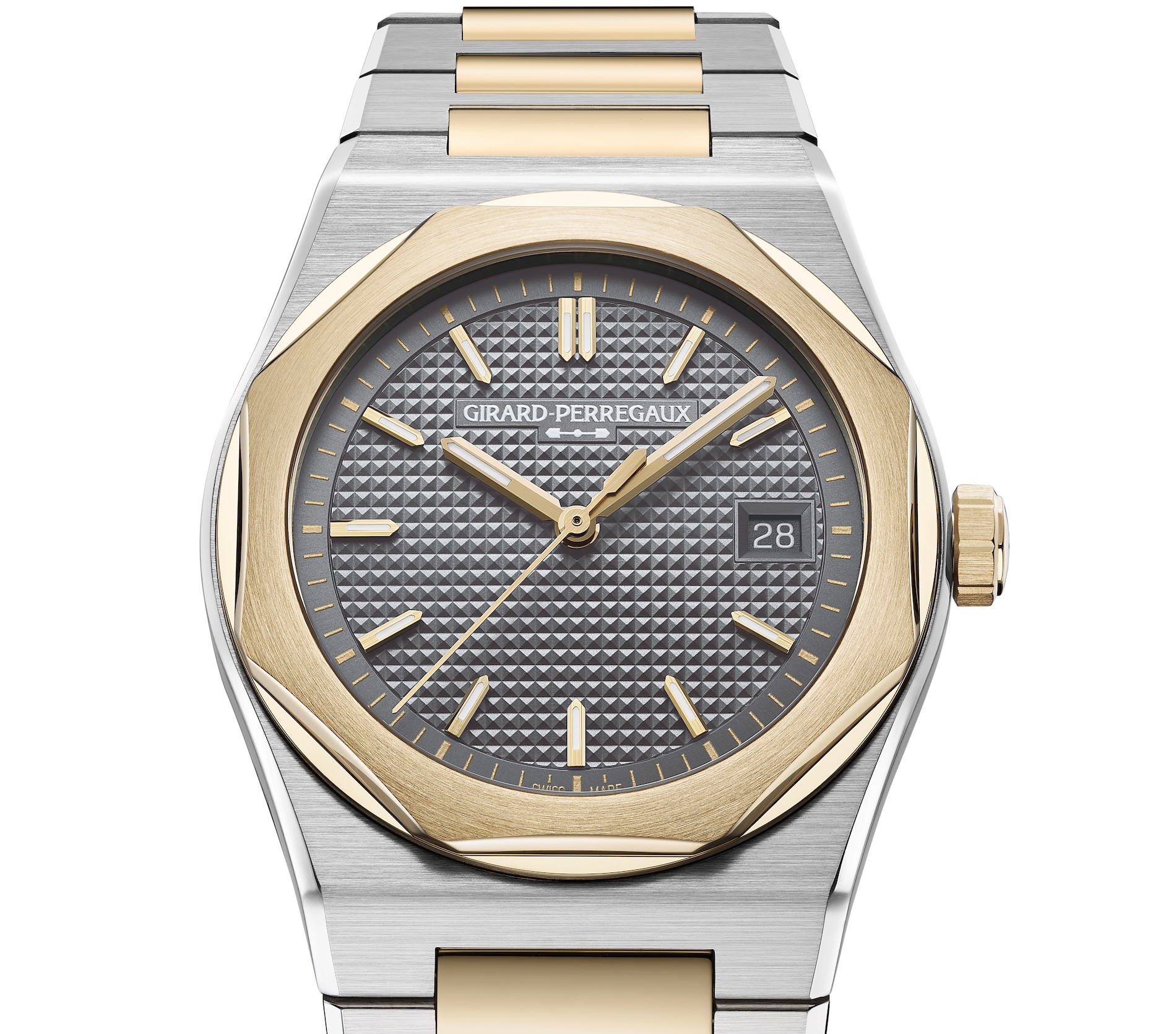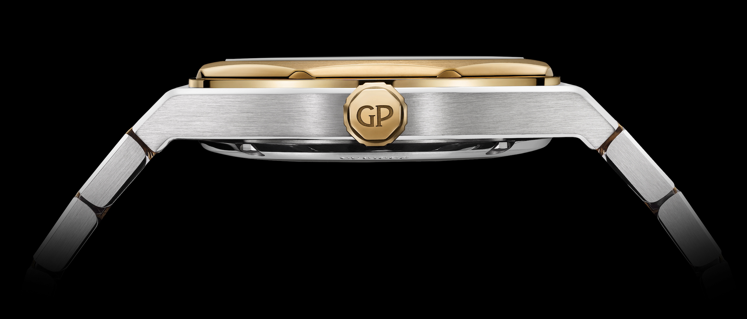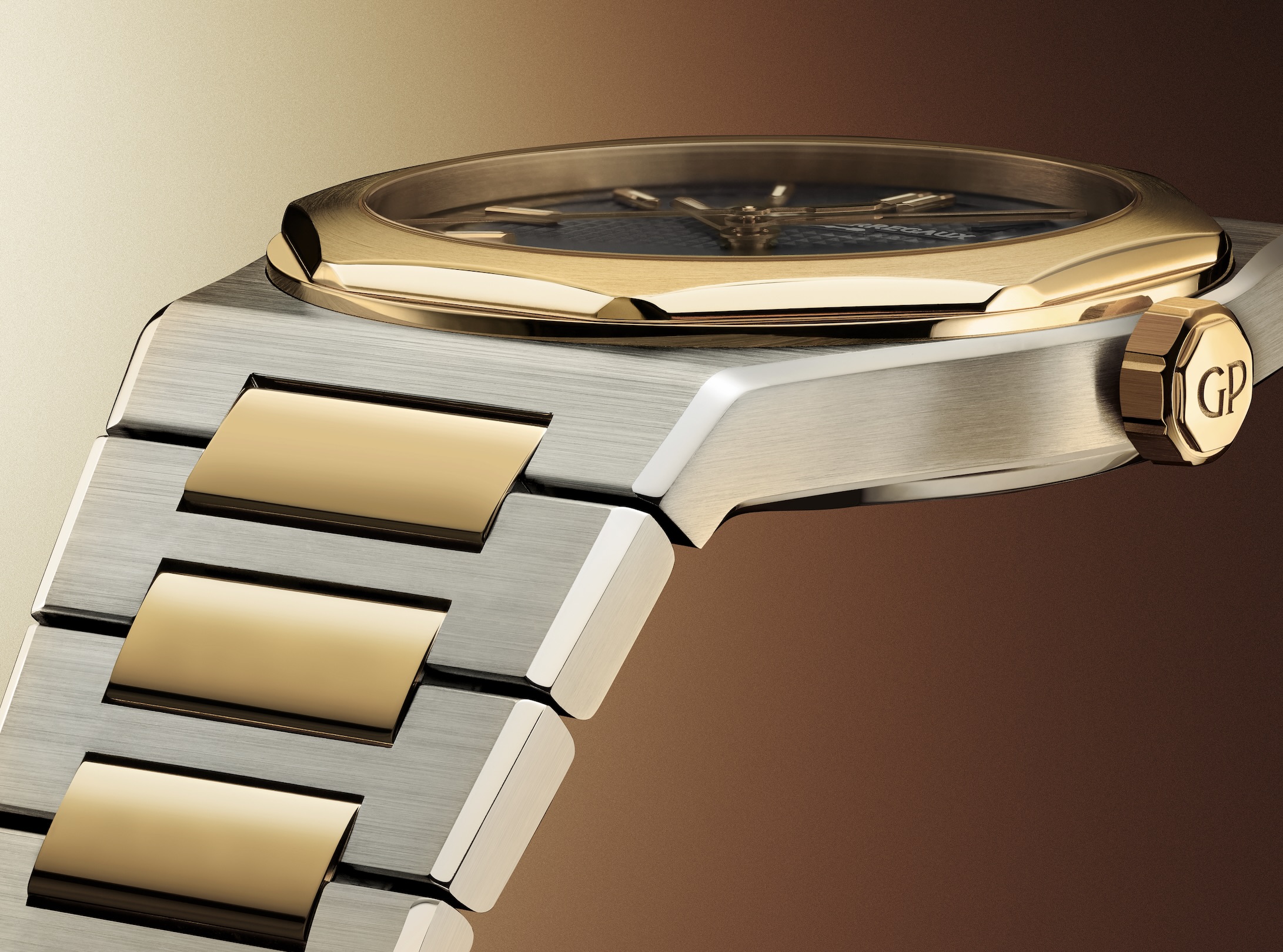 Cette philosophie s’écrit aujourd’hui avec la Laureato Fifty. Directement inspirée du modèle originel, cette nouvelle création incarne à la fois la fidélité au design historique et l’intégration des technologies les plus avancées. Logée dans un nouveau boîtier de 39 mm de diamètre pour 9,8 mm d’épaisseur, la Laureato FIFTY, fidèle à ses origines, joue sur la noblesse de la matière : l’alliance de l’acier et de l’or jaune 3N. Cette combinaison évoque le premier modèle bicolore de 1975, tout en affirmant une allure contemporaine. Le boîtier tonneau a été retravaillé : angles plus francs, chanfreins plus prononcés,intégration du bracelet encore plus fluide. La lunette octogonale, emblématique, alterne les finitions satinées et polies, créant un jeu de lumière subtil et sophistiqué. Les glaces saphir, plates côté cadran comme côté fond, participent à la finesse visuelle de l’ensemble. Un détail inhabituel sur une pièce de ce type : elle est étanche à 150 mètres. Le cadran, d’un gris soleillé profond, présente un motif Clous de Paris réhaussé par des index et aiguilles faisant écho à l'or 3N de la montre. L’aiguille centrale des secondes est équilibrée par un contrepoids en forme de double flèche, emblème de GP, et un guichet à 3h affiche la date sur un disque dont la couleur s’assortit à celle du cadran — un niveau de finitions et de détails qui témoignent d’un respect absolu des codes de la Haute Horlogerie. Le bracelet en acier et or jaune s’inscrit dans la lignée du dessin originel. Sa complexités’exprime dans une construction en chute dont les maillons « H » en acier s’affinent progressivement vers la boucle. Ces maillons,légèrement plus courts sur ce nouveau modèle, permettent au bracelet de mieux épouser la courbe du poignet. Ils intègrent en outre un demi-maillon de réglage pour un confort optimisé. Les maillons centraux, en or jaune, sont quant à eux légèrement plus bombés que ceux en acier, jouant ainsi sur les volumes et la lumière. La boucle triple déployante arbore le logo GP, gravé aussi sur les lames internes. Les poussoirs de la boucle, de forme octogonale, font écho à la lunette et renforcent la cohérence du design. La boucle intègre aussi un système de réglage fin inédit qui permet un ajustement précis du bracelet de 4 mm, particulièrement utile notamment par temps chaud – détail fonctionnel, raffiné et discret.