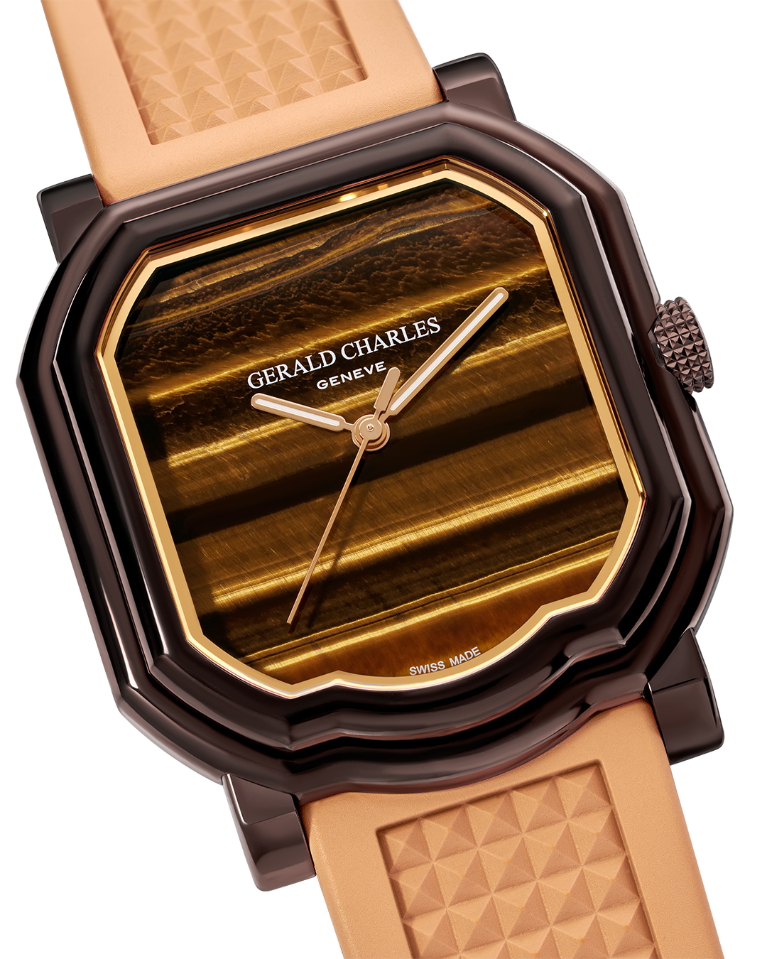 Au cœur de la montre : un cadran en œil-de-tigre, une pierre semi-précieuse à la chatoyance dorée, prisée pour son éclat unique. Popularisée dans les montres des années 1970, cette pierre naturelle est ici réinterprétée avec une modernité audacieuse, reflet de l’ADN des deux maisons. En raison de sa fragilité naturelle, sa découpe et sa finition nécessitent des outils diamantés, un travail lent et précis réservé à quelques rares lapidaires expérimentés. Seuls les cadrans les plus équilibrés et homogènes sont sélectionnés, pour un résultat aussi technique qu’artistique. Pour la première fois chez Gerald Charles, le cadran n’affiche aucun index ni minuterie : un choix esthétique assumé qui laisse toute la place à la beauté brute de la pierre. « Cette montre incarne notre esthétique du baroque minimaliste : une boîte inspirée de l’architecture baroque, riche et expressive, associée à un cadran d’une grande sobriété », explique Ziviani. Le cadran est encadré par la célèbre boîte Maestro, aux lignes architecturales fluides. Cette édition introduit pour la première fois la finition Colormix bronze métallisé, obtenue par un mélange exclusif de traitements chimiques et physiques, jusqu’ici réservé aux composants internes. Cette teinte chaude, appliquée également à la boucle, est associée à un bracelet en caoutchouc vulcanisé couleur sable, à la texture mate évoquant les paysages dorés des Émirats. L’ensemble compose un récit visuel cohérent, entre tradition et modernité, artisanat et beauté naturelle. Côté mécanique, la montre est animée par le calibre suisse GCA2000, un mouvement automatique de 3,7 mm d’épaisseur, avec heures, minutes, secondes et date à 6h. Composé de 189 composants et orné de colimaçon, Côtes de Genève et perlage, il allie élégance et performance, avec une réserve de marche de 50 heures. Unisexe et polyvalente, la Maestro 2.0 Tiger’s Eye est bien plus qu’un garde-temps : elle incarne une collaboration emblématique, un pont entre passé et avenir, tradition horlogère et innovation contemporaine.