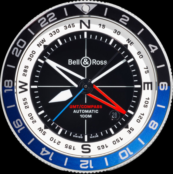 Bell & Ross garde le cap avec la nouvelle BR-03 GMT Compass. Capable d’indiquer une direction, grâce à sa lunette bicolore et son cadran gradué à la manière d’une boussole, cette montre-instrument dotée d’une fonction GMT permet de se repérer non seulement dans le temps, mais aussi dans l’espace. Certaines inventions ont changé de manière remarquable le cours de l’histoire humaine. La création de la boussole en fait partie. Dès la plus haute antiquité, les hommes ont éprouvé le besoin de se repérer pour pouvoir explorer, voyager, et retrouver leur chemin. Les historiens attribuent généralement l’apparition de la boussole en Chine, il y a plus de 2000 ans grâce aux premières observations du phénomène du magnétisme. A l’horizon du XVe siècle, elle devient courante chez tous les marins. Essentielle à toute f orme de navigation, en mer, sur terre et dans les airs, elle est présente dans tous les tableaux de bords de l’ère moderne. Au XXIe siècle, elle se réinvente en s’adaptant au poignet sous la f orme d’une montre-bracelet avec la nouvelle BR-03 GMT Compass, mariant le dessin familier de la boussole et la f onction GMT. Conçue comme un instrument de voyage, la nouvelle BR-03 GMT Compass de Bell & Ross reprend le principe à succès du double fuseau horaire, introduit dans les collections de la maison dès 2007 avec la BR-03 51 GMT Titanium. Cette fonctionnalité est prisée des globe-trotteurs puisqu’elle permet de lire instantanément l’heure dans deux fuseaux horaires. Le nouveau modèle se f onde sur la récente BR-03 93 GMT. Très lisible et facile d’utilisation, cette montre robuste et fiable, étanche à 100 mètres, adopte une lunette en aluminium anodisé graduée sur 24 heures, dont la partie bleue affiche les heures diurnes et, le segment noir les heures nocturnes. Cette lunette ronde est fixée sur un boîtier carré de 42 millimètres de côté. Une association du rond et du carré typique de la ligne directrice du design de Bell & Ross. Les quatre vis positionnées aux angles de la boîte sont également caractéristiques de l’identité de la maison et rappellent les instruments de bords des avions. Un garde-temps de précision animé par le mouvement mécanique à remontage automatique calibre BR-CAL.303 doté de 54 heures de réserve de marche.