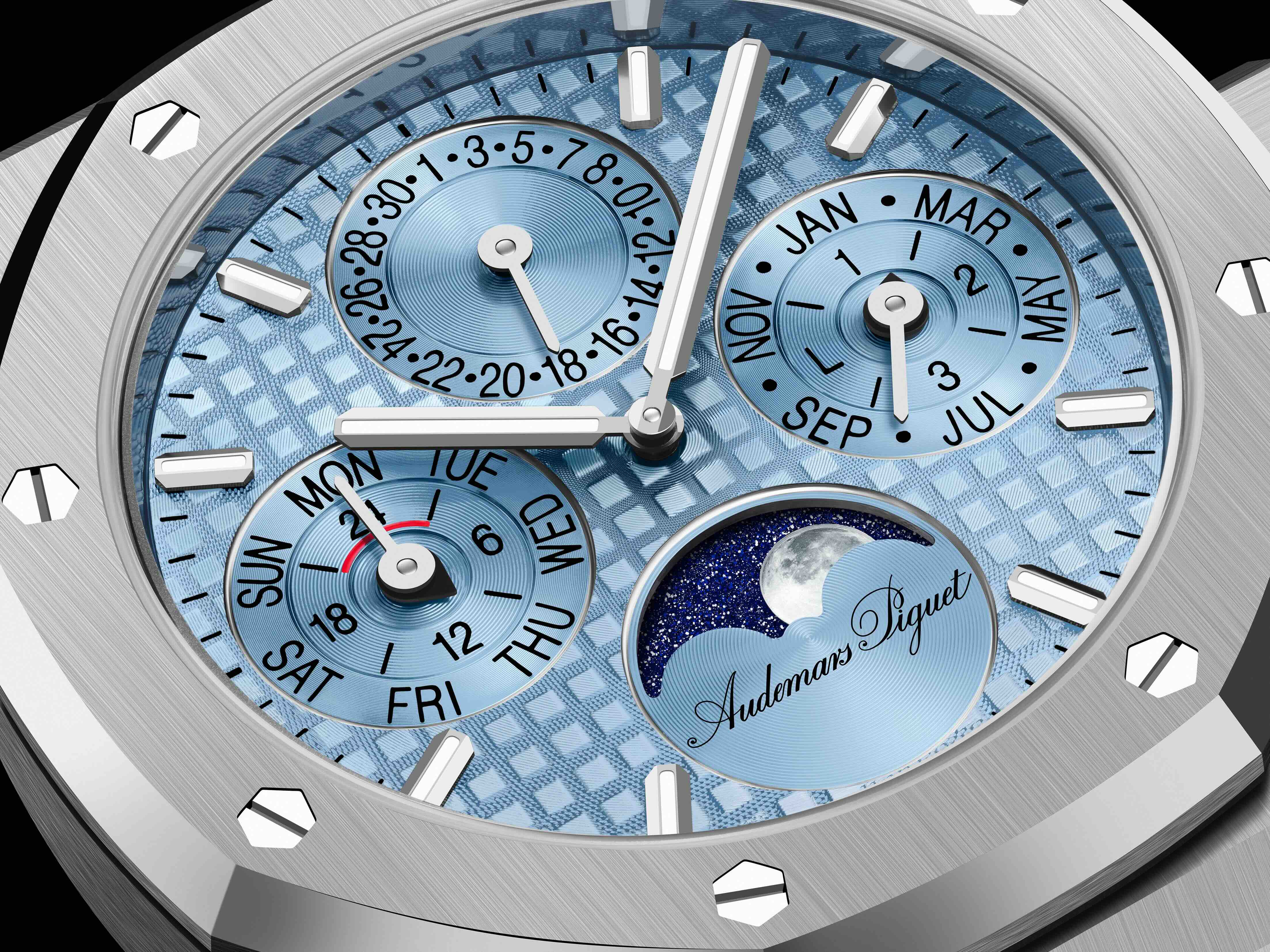Longtemps réservé au diamètre de 41 mm, le quantième perpétuel fait à présent son apparition en 38 mm. « Chez Audemars Piguet, nous croyons que la passion de l’horlogerie doit être partagée avec le plus grand nombre. Souvent considérées comme plus masculines, les montres à complications fascinent cependant tous les amateurs, sans distinction d’âge ou de genre. En lançant ce quantième perpétuel ergonomique dans une boîte de 38 mm de diamètre, nous invitons tout le monde à rêver et à célébrer 150 ans de savoir-faire, d’innovation et d’amour des belles montres. » (Ilaria Resta, Directrice Générale, Audemars Piguet). Alliant complexité horlogère, ergonomie et raffinement esthétique, ces trois modèles de 38 mm sont introduits simultanément dans les collections Code 11.59 by Audemars Piguet et Royal Oak. L’absence de correcteurs sur le côté de la boîte renforce leur élégance toute en finesse ainsi que leur étanchéité. Le premier modèle Royal Oak marie une boîte et un bracelet en acier inoxydable à un cadran Grande Tapisserie en PVD bleu clair assorti aux compteurs azurés. Les index rhodiés et les aiguilles en or gris 18 carats couverts d’un revêtement luminescent assurent le contraste et la lisibilité, même dans l’obscurité. Les indications imprimées en noir sur les compteurs et en périphérie du réhaut gris poli ajoutent la touche finale. Ces trois modèles sont équipés d’un fond saphir révélant l’élégance de leur calibre respectif. La masse oscillante en or rose 22 carats et le pont de barillet, visible de 12h à 3h, se distinguent des autres éléments rhodiés du mouvement. Pour célébrer les 150 ans de la Manufacture, ces nouveautés seront également disponibles en éditions limitées de 150 pièces, arborant de subtils éléments de design créés spécialement pour l’occasion. Parmi ceux-ci, une signature « Audemars Piguet » vintage inspirée des documents d’archives vient s’insérer dans l’indication de phase de Lune à 6h. Ces éditions limitées sont également dotées de deux gravures supplémentaires au dos de la montre : le logo « 150 » et la mention « 1 of 150 pieces ». Comme pour les versions de 41 mm parues en début d’année, les compteurs ont été réorganisés afin derenforcer la lisibilité, la symétrie et l’harmonie visuelle. Ainsi, le cadran affiche désormais la date selon les conventions européennes avec le jour à 9h, la date à 12h et le mois à 3h. C’est désormais la première semaine de l’année (« 1 ») qui apparaît à 12h (au lieu de la semaine 52 auparavant). Suivant le même raisonnement, « MON » pour le lundi et « 1 » sont à présent alignés à 12h dans leur compteur respectif, marquant le début de la semaine et le premier jour du mois. À 12h, le compteur de date est doté d’un système breveté d’affichage progressif pour lequel une roue de date a été développée comptant 31 dents sur mesure, dont la taille varie afin de s’adapter à la largeur des chiffres et de gagner en lisibilité. Pour assurer une symétrie parfaite avec le compteur du mois et de l’année bissextile à 3h, une indication des 24h a été insérée dans le compteur des jours à 9h. Une zone de non-correction apparaît en rouge entre 21h et 3h, indiquant la période durant laquelle le quantième perpétuel ne peut pas être corrigé. Toutefois, toute tentative de réglage par l’utilisateur durant ce laps de temps n’endommagera pas le mouvement. La phase de lune qui affiche une représentation réaliste du satellite terrestre basée sur une photographie de la NASA, demeure à 6h comme sur les modèles précédents. Mais la pleine lune est à présent centrée sur l’axe de 12h, contribuant ainsi à l’harmonie générale du cadran.