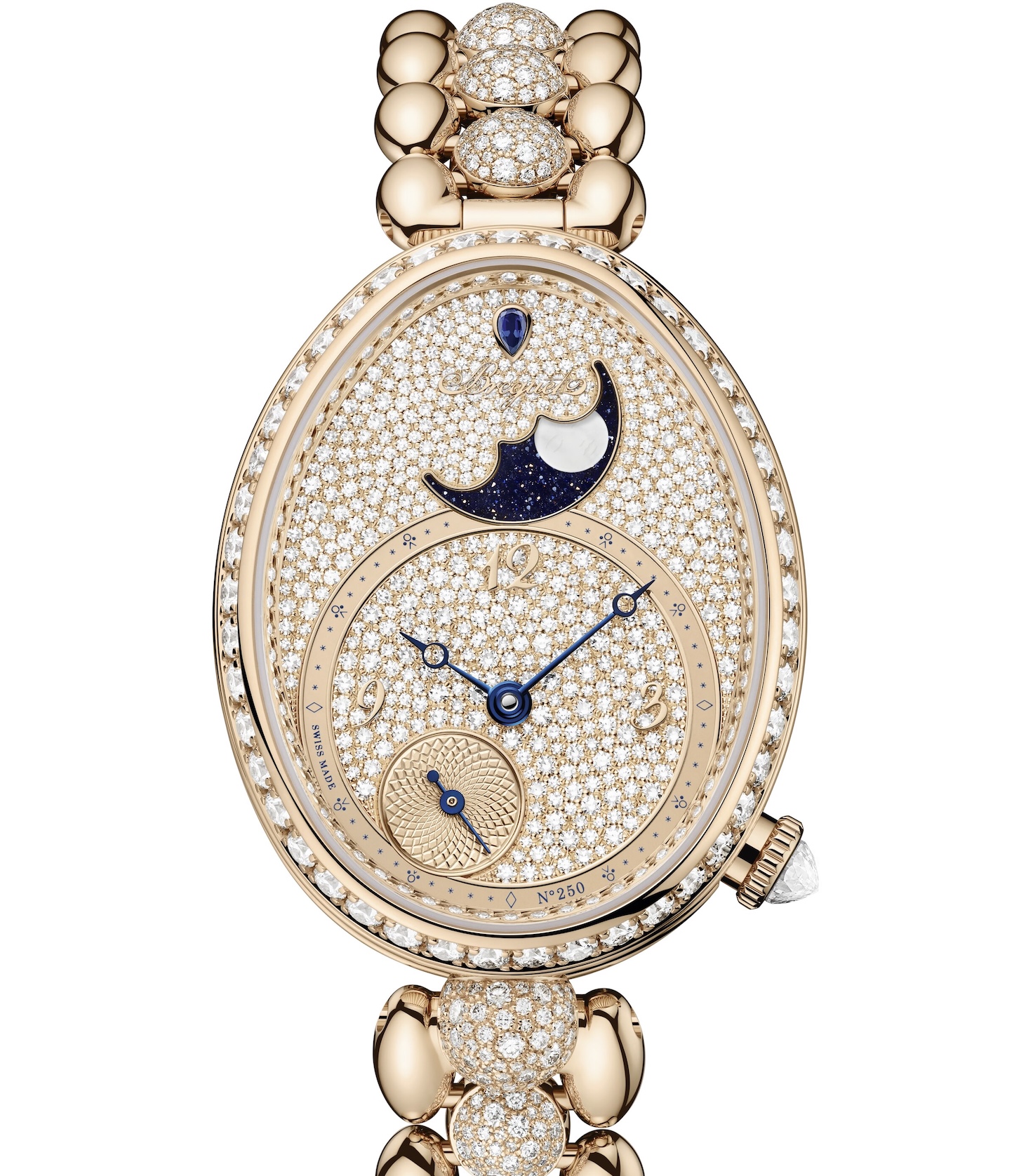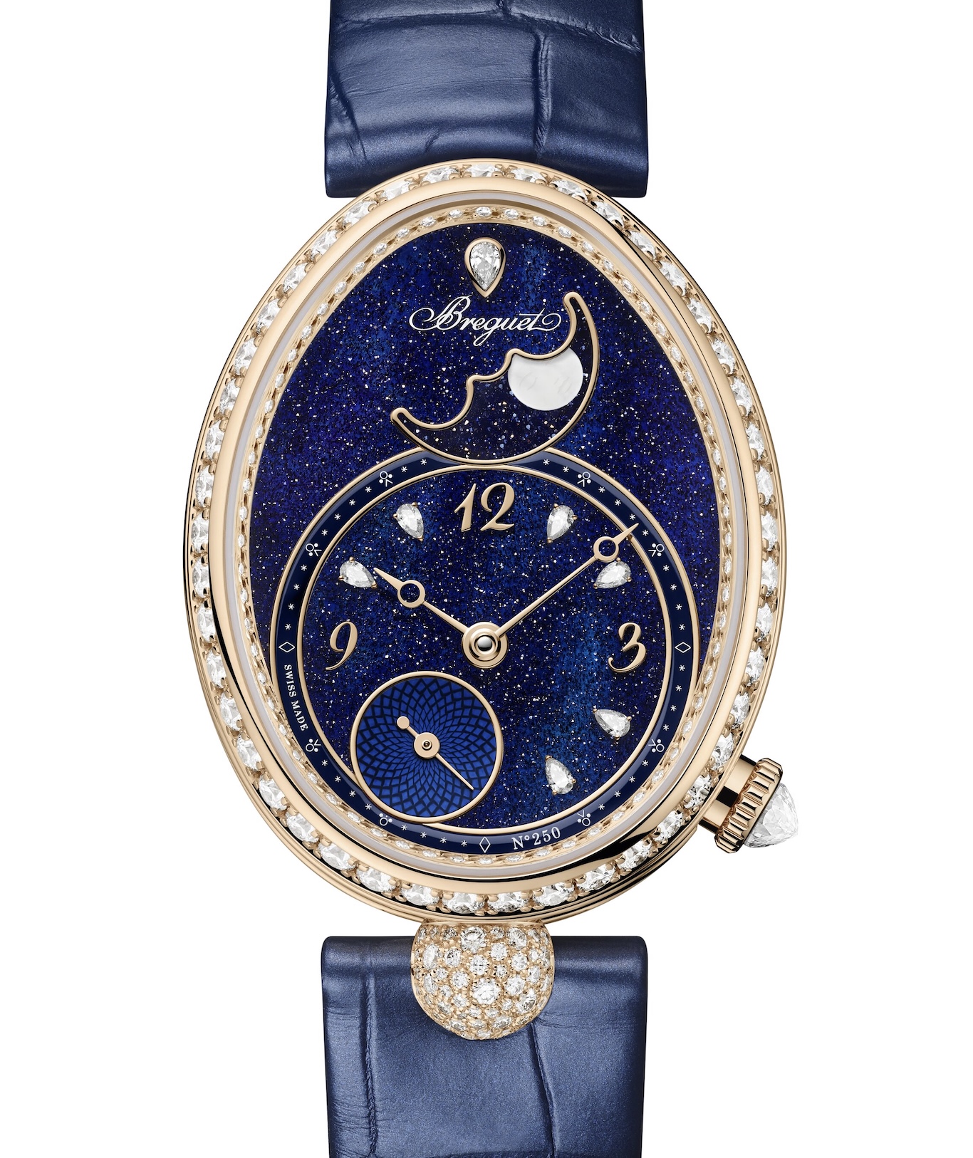 Ce caractère original, combiné au bleu du verre aventurine pailleté de cuivre, confère à la Reine de Naples un visage nocturne, radieux et onirique - en parfaite adéquation céleste avec la phase de lune. La lune elle-même, légèrement bombée, est réalisée en nacre blanche. Elle estapposée sur un disque en verre aventurine bleue, de manière à en renforcer la lueur. C’est une première sur la Reine de Naples. Qui plus est, elle comporte une signature secrète. Tout en transparence, son visage apparaît décalqué en blanc sous la nacre. Seule la propriétaire de la pièce sera en mesure de le discerner si elle y prête une attention particulière. Première Reine de Naples en or Breguet, la boîte de la référence 9935 comporte une attache centrale ronde sertie neige à 6 h dont la géométrie a inspiré les maillons du centre du nouveau bracelet. Ce dernier s’inspire de la boîte oblongue, si caractéristique des montres Reine de Naples, mais aussi des perles chères à Caroline Murat, s’inscrivant ainsi dans une continuité esthétique. Souple et délié, ce nouveau bracelet peut être ajusté au millimètre près en boutique Breguet et se dote d’un attache-fermoir exclusif et invisible, parfaitement intégré. Deux versions sont dotées de ce nouveau bracelet : la première sur un cadran en nacre blanche perlée, la seconde intégralement pavée (1387 diamants et 1 saphir bleu pour un total de 5.2 carats). La variation en verre aventurine bleu est proposée sur bracelet alligator bleu effet satin. La version avec le cadran nacre blanche perlée est également disponible sur ce même bracelet.