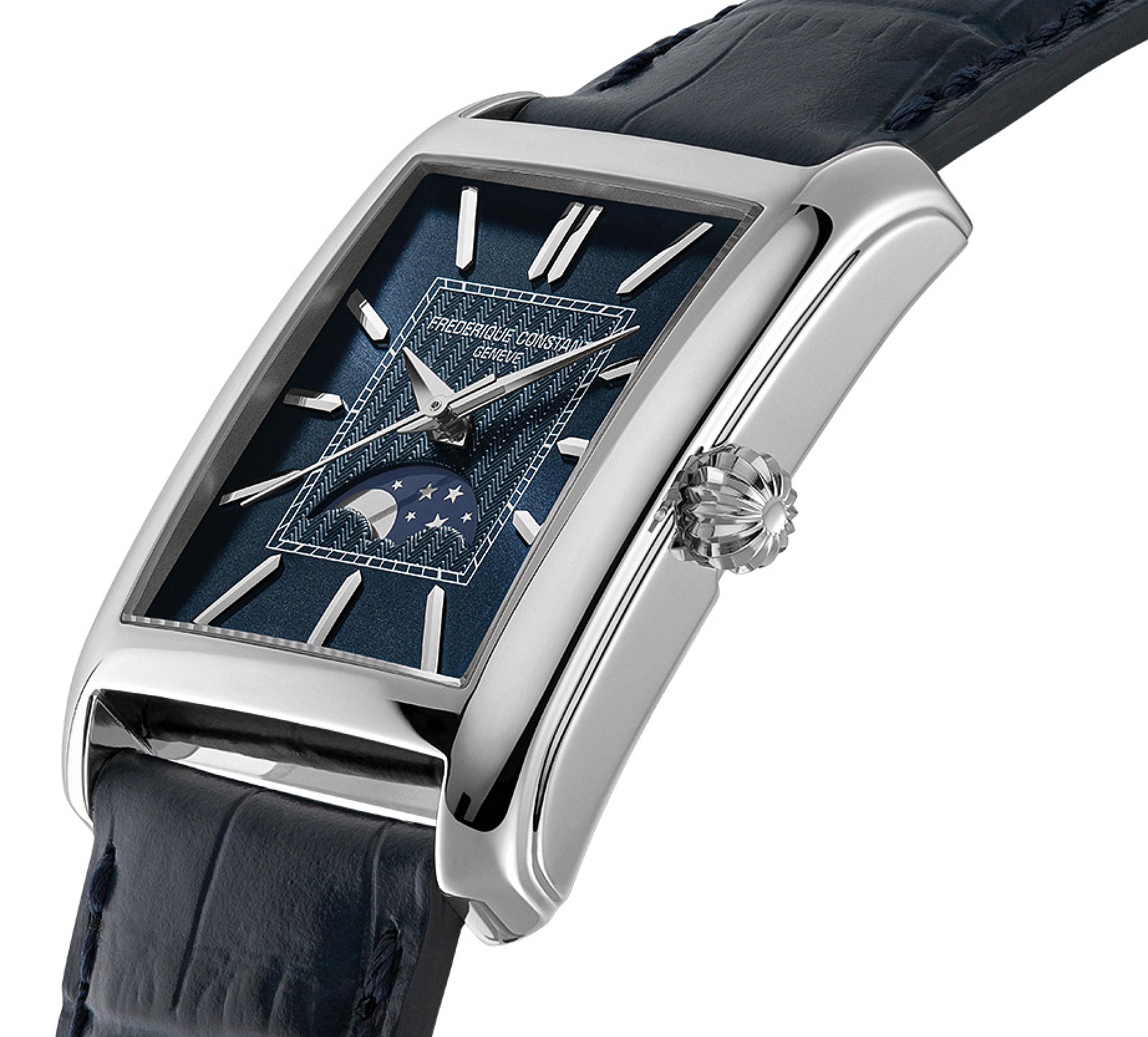 La nouvelle phase de Lune de la Classics Carrée Moonphase Automatic est implantée à 6h. Elle vient ainsi équilibrer les mentions signatures de la manufacture, « Frédérique Constant Genève », visibles à midi. Entre les deux, un délicat motif guilloché à chevrons. Comme une belle étoffe, il se dessine à fleur de cadran, en relief. Il est monochrome sur cadran argenté, mais combine le bleu céleste et le gris lunaire sur la version à cadran bleu. La phase de Lune est en harmonie, mariant elle-même une Lune et des étoiles grises, sur fond bleu astral. La découpe où se déploie ce ballet est en forme de croissant, dévoilant et masquant alternativement les différents visages du précieux satellite de la Terre. Tout comme la phase de Lune est une complication séculaire de la haute horlogerie - elle est concomitante aux premiers calendriers perpétuels, le format rectangulaire de la Classics Carrée Moonphase Automatic renvoie lui aussi aux canons formels du siècle passé. C’est un design classique de l’Art déco. Très présent dans les années 20 et 30, il constituait jadis un défi horloger pour loger dans un boîtier carré ou rectangulaire un mouvement qui, lui, restait rond dans la grande majorité des cas. Frédérique Constant perpétue cette tradition tout en l’interprétant dans un langage contemporain. La pièce s’étire donc à présent dans un format de 42,3 mm de hauteur pour 30 mm de largeur. Ce format généreux met en valeur les trois aiguilles centrales et la phase de Lune, tout en offrant au cadran une belle lisibilité et un juste équilibre visuel. On y découvre douze index facettés et appliqués, ainsi que deux aiguilles dauphine et sa trotteuse, toutes trois polies à la main. Le motif central est pour sa part entouré d’une minuterie « chemin de fer », ou « sector dial », elle aussi typique des années 20 et 30. La boîte rectangulaire est quant à elle entièrement en acier poli, confirmant sa vocation naturelle de pièce de standing. Son profil à deux niveaux équilibre subtilement lignes droites et courbes douces, dans une harmonie maîtrisée. Côté fond, comme pour la quasi-totalité des montres mécaniques créées par Frédérique Constant, les deux nouvelles Classics Carrée Moonphase Automatic sont dotées d’un fond saphir. Il dévoile le calibre automatique FC-333, reconnu pour sa fiabilité et utilisé de longue date par la Maison. Il offre une réserve de marche de 38 heures.