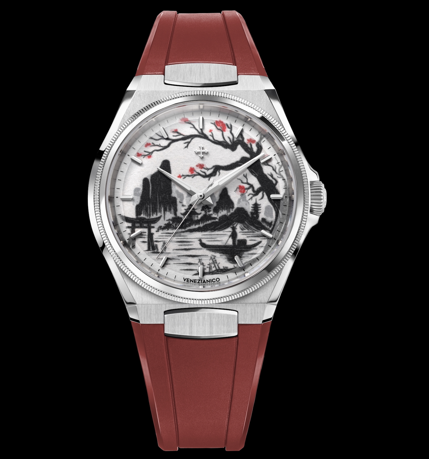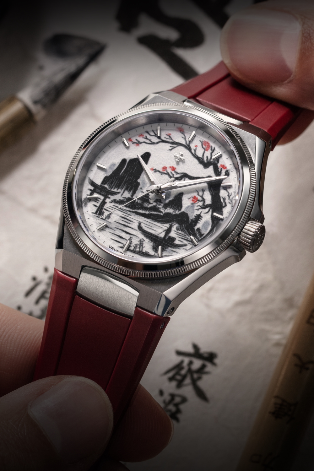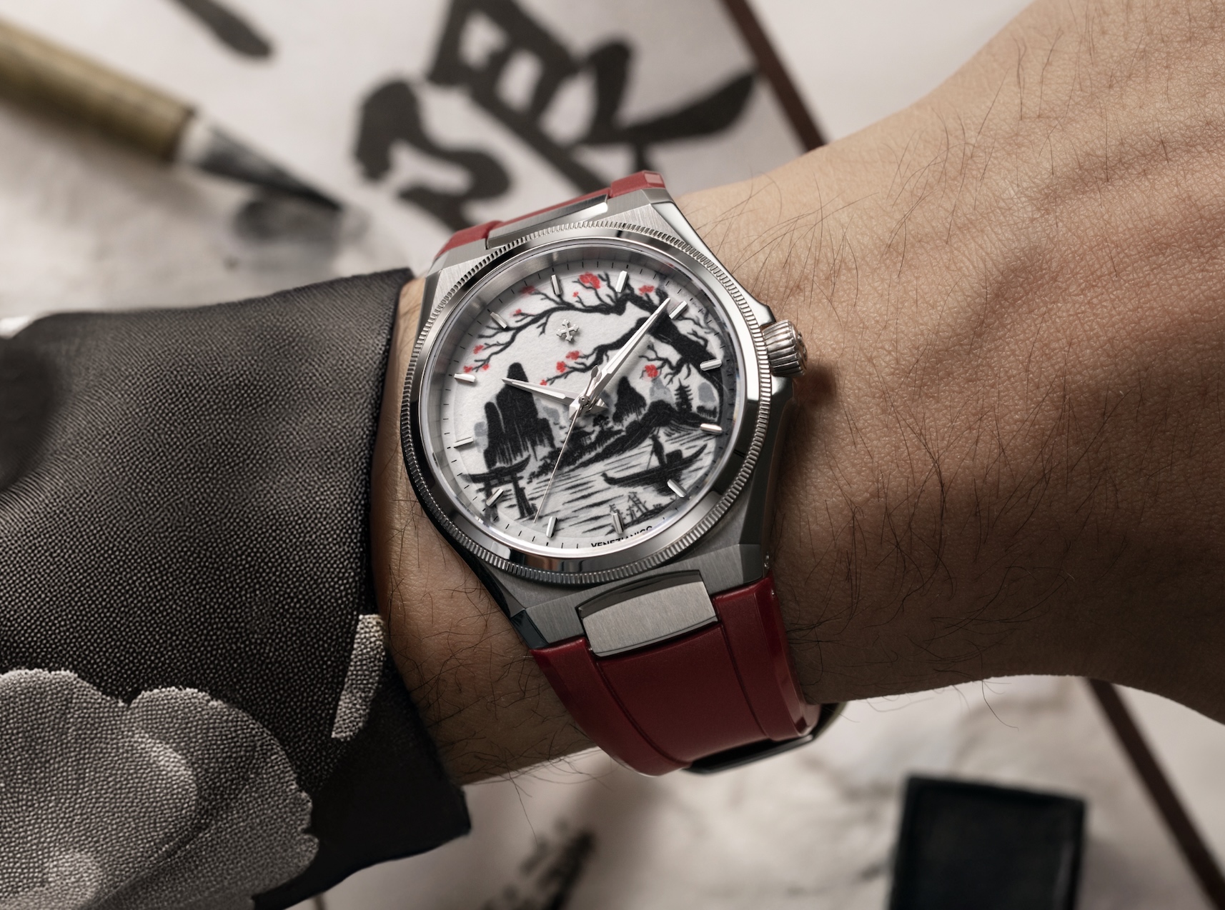 Reproduire la profondeur et la sensibilité du Sumi-e 墨絵 sur un cadran de quelques centimètres a exigé une précision absolue. Chaque couche de couleur est déposée avec un contrôle millimétrique, respectant la trame et les imperfections naturelles du papier Washi afin que l’image finale conserve la vibration de l’œuvre originale. Comme dans la peinture traditionnelle japonaise, aucune correction n’est possible : chaque couche d’encre est définitive, fruit d’un équilibre parfait entre maîtrise technique et sensibilité artisanale. Le boîtier en acier satiné de 40 mm, aux proportions rigoureuses et harmonieuses, d’une épaisseur de seulement 9,95 mm verre saphir antireflet compris, encadre ce microcosme visuel avec une élégance sobre. Les surfaces alternent poli et satiné dans un jeu de contrastes qui rappelle la dialectique même du Sumi-e 墨絵 : le dialogue entre plein et vide, lumière et ombre, matière et esprit. Le bracelet rouge, profond et intense, ajoute une touche vibrante qui souligne le raffinement de l’ensemble, tout en évoquant la passion et l’énergie vitale qui relient Venise à l’Extrême-Orient. Sur le fond vissé, garantissant une étanchéité jusqu’à 50 mètres, se détachent les caractères japonais identifiant la technique à laquelle le modèle rend hommage. Autour d’eux se déploie un motif gravé rappelant l’encre se dissolvant dans l’eau, symbole d’équilibre et de mouvement perpétuel.