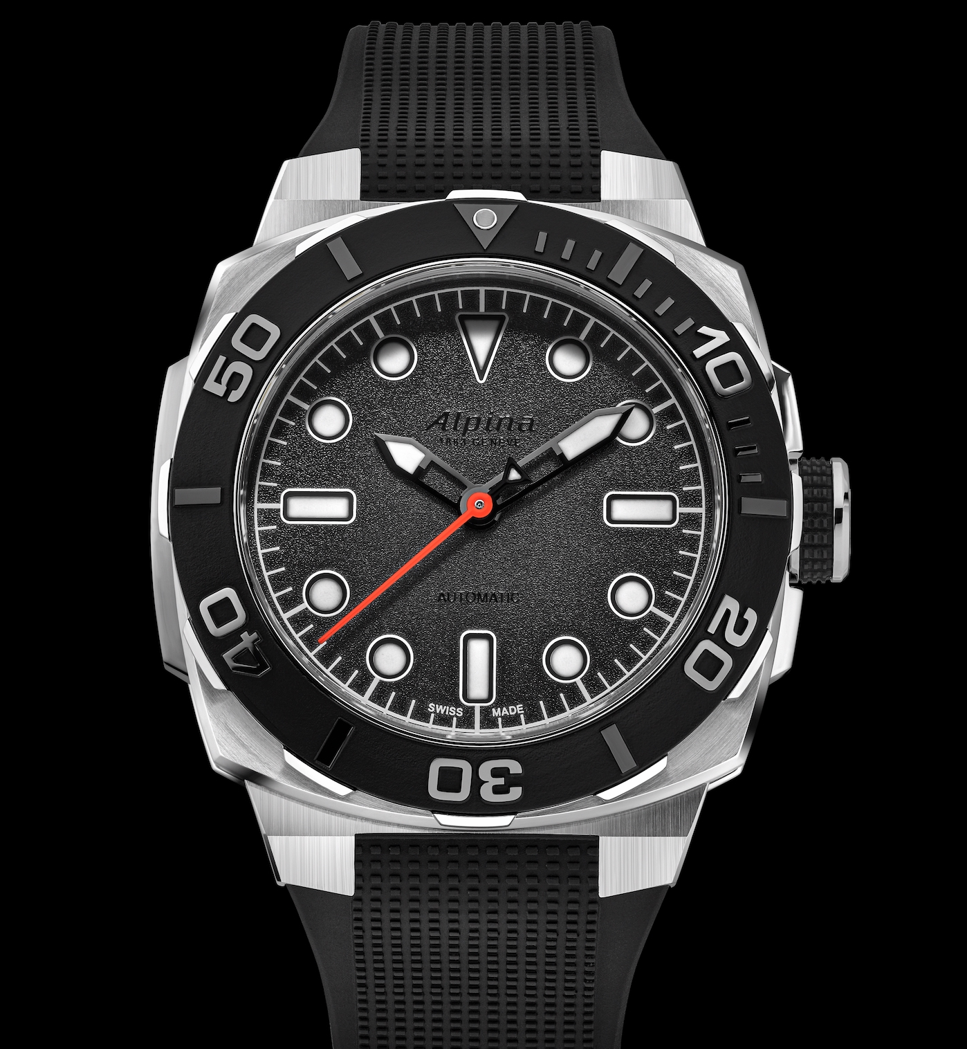 Le rehaut qui, dans la collection d’origine, se trouve surélevé, a été supprimé. L’ouverture de cadran s’en trouve élargie, permettant par la même occasion des index horaires plus grands, ainsi qu’une minuterie intégrée qui offre une lecture de la seconde plus précise. La base noir mat des inserts de la lunette en céramique se marie parfaitement avec le cadran grainé couleur charbon, tandis que la finition brillante des index appliqués des minutes vient renforcer celle que l’on retrouve aussi sur le nom de la marque ainsi que sur la mention « Automatic », tissant un lien naturel entre l’intérieur et l’extérieur de la composition. Le pourtour plus foncé des aiguilles des heures et des minutes souligne leur segment luminescent blanc éclatant qui se détache nettement sur le cadran gris. Le contrepoids caractéristique de la trotteuse luminescente est lui aussi resté noir, attirant ainsi le regard vers son extrémité allongée ; de ce fait, celle-ci ressort particulièrement bien sur la texture du cadran, toujours changeante (mais jamais déroutante). Pour Alon Ben Joseph, « Nous voulions créer une montre qui soit en phase à la fois avec les valeurs d’Alpina et de The Real Time Show, mais suffisamment différente de ce qui a été fait précédemment, afin de donner à notre communauté quelque chose de réellement désirable. La plupart de nos auditeurs sont déjà propriétaires de montres Alpina. Ils se sont montrés très intéressés lorsque nous leur avons dit que nous avions un projet en cours avec la marque. Après plusieurs échanges avec eux au sein de la boucle WhatsApp du Real Time Network, et au fil de nos conversations individuelles, nous avons eu la claire direction dans laquelle nous devions avancer. Je suis très content du résultat obtenu avec cette montre. Et impatient de la voir au poignet de plusieurs membres de notre communauté, notamment lors des prochaines réunions et que nous pourrons tenir à Amsterdam, Londres ou ailleurs encore. » Proposée sur un bracelet en caoutchouc noir (en cohérence visuelle avec la couronne moletée vissée noire), la montre arbore un style robuste et marin. Grâce aux proportions récemment redessinées du boîtier Alpina Seastrong (à présent en 39 mm de diamètre, 12 mm d'épaisseur et 40,5 mm d'entre-corne), la pièce offre un confort discret et compact, convenant à la plupart des poignets.