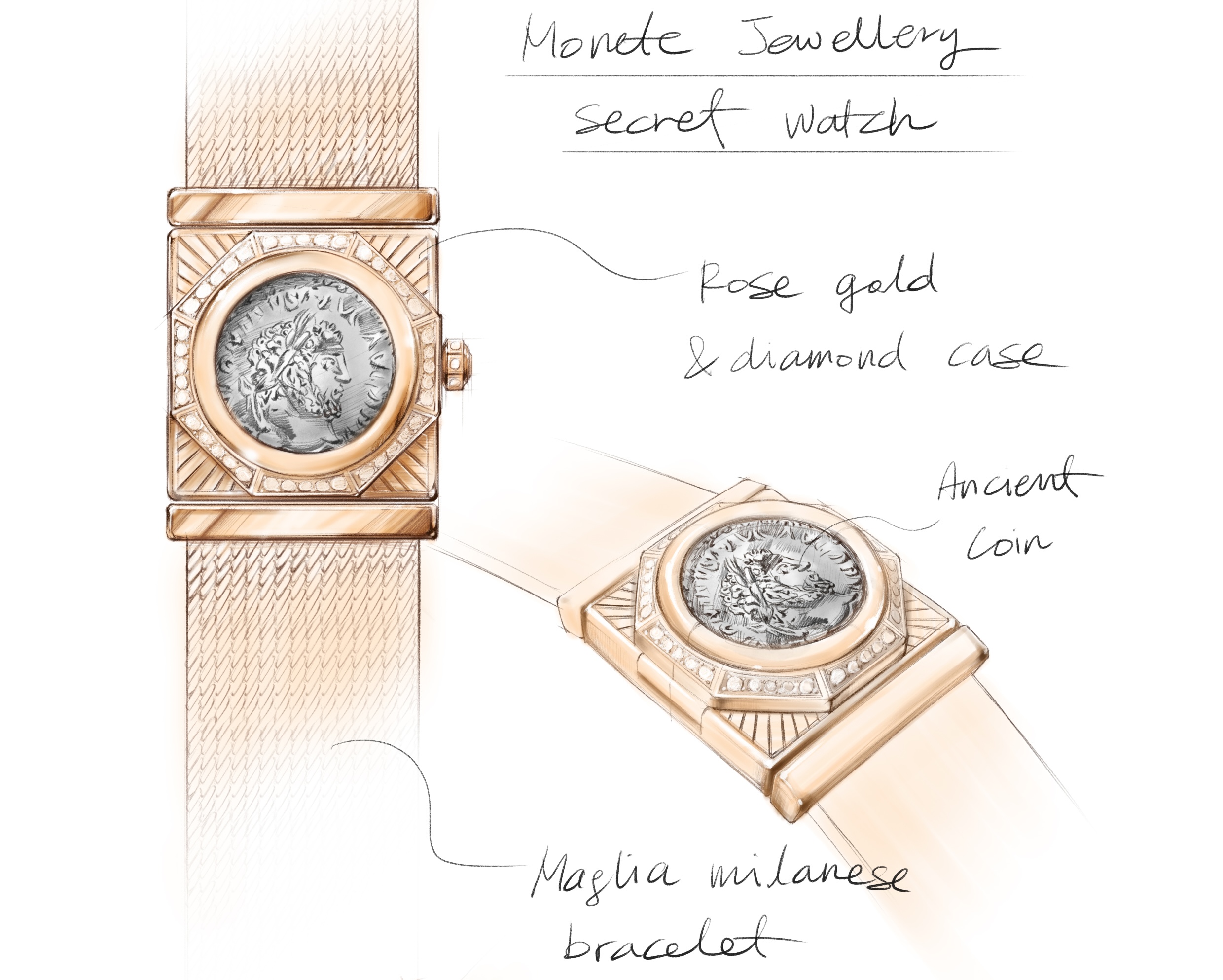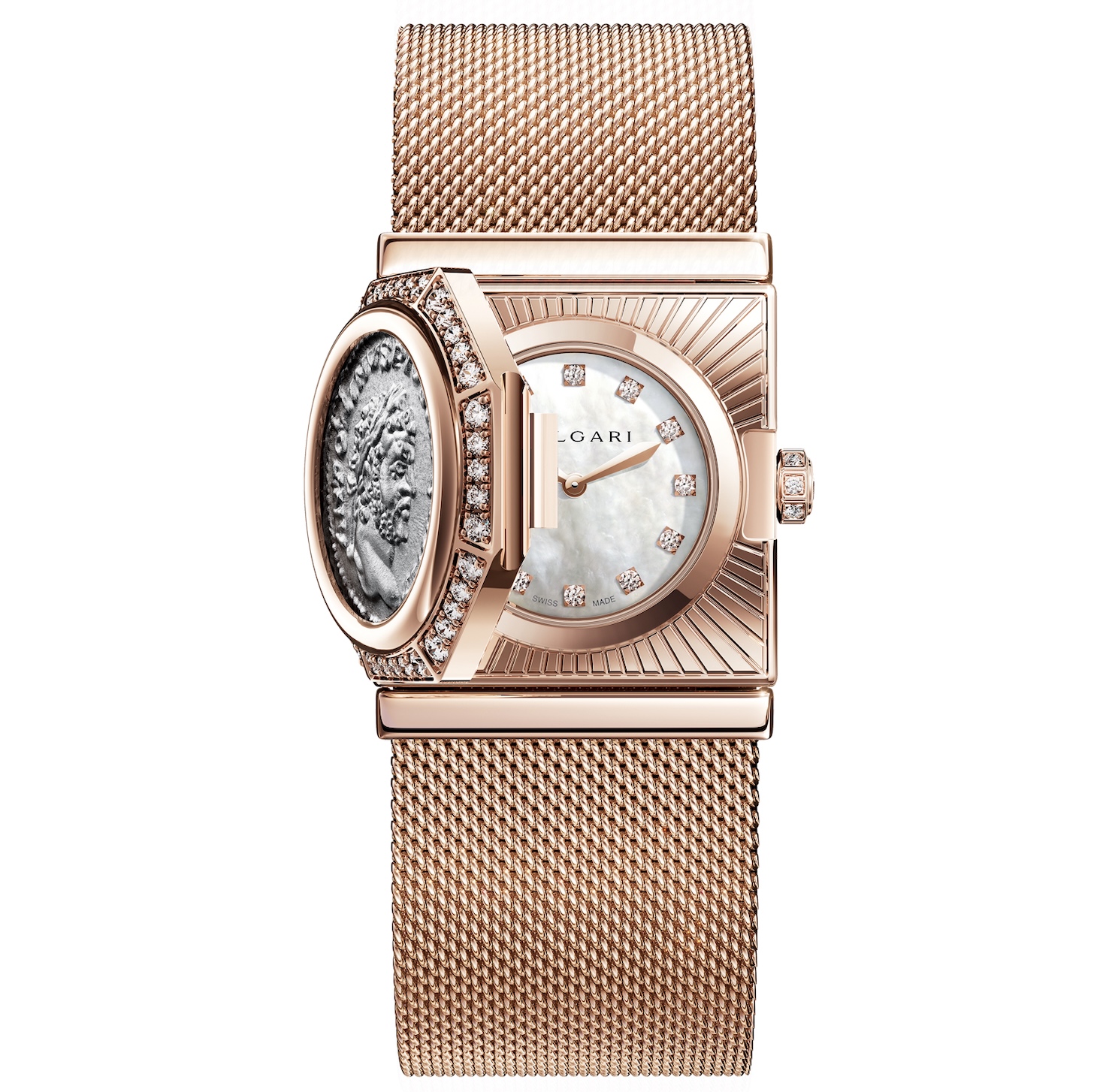 « L’essence de cet objet réside dans sa flexibilité, une inspiration qui a donné naissance à un projet inattendu ayant évolué au fil du temps. Cette création est une révélation qui offre une occasion unique de découvrir l’univers joaillier et horloger de la Maison. Sa nature éclectique se révèle à travers ses différents thèmes : une pièce de monnaie ancienne, une forme octogonale et une maille milanaise délicate », affirme Fabrizio Buonamassa Stigliani, directeur de la création horlogère chez Bvlgari. La montre Monete est à la croisée du temps et de l’art. La joaillerie italienne et l’horlogerie suisse se perçoivent dans chaque détail. Bvlgari a voulu agrémenter cet hommage à la Rome éternelle d’une boucle ardillon, une première pour la collection. Avec cette montre, la Maison laisse libre cours à sa vision plurielle à travers un mélange des genres : le symbolisme d’une pièce ancienne, la pureté géométrique de l’octogone et la texture tout en finesse de la maille milanaise.