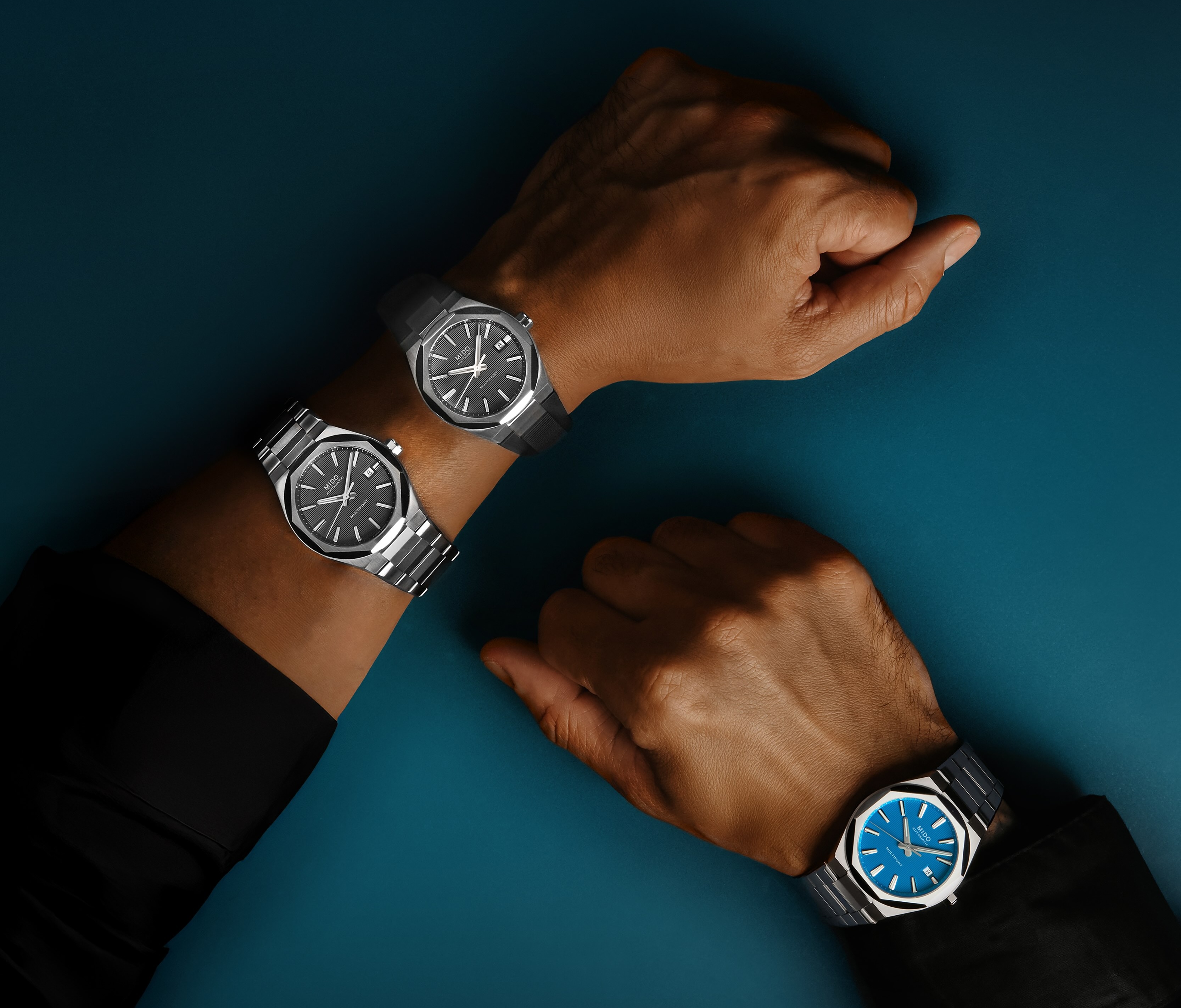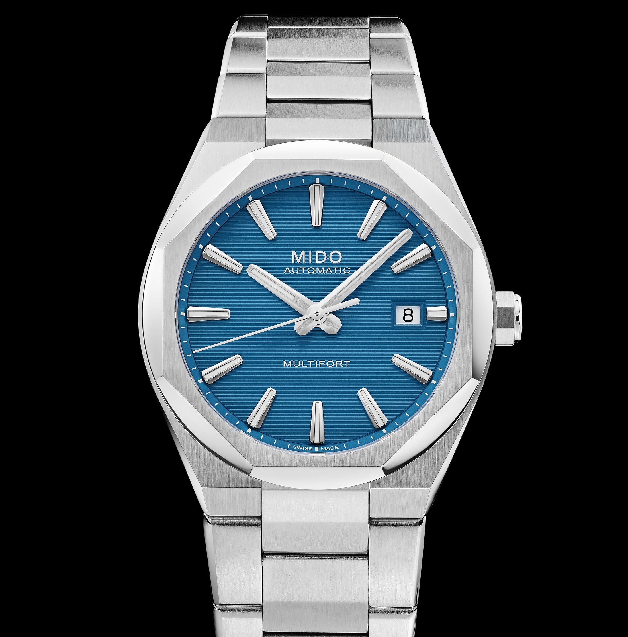 D’un bleu perçant, le cadran de la Multifort 8 One Crown ne laisse personne indifférent. Tracée de lignes horizontales, caractéristiques de la collection, son énergie est communicative. Les index polis et satinés, ainsi que les aiguilles trifaces des heures et des minutes sont garnis de Super-LumiNova® blanc – gage d’une lisibilité parfaite de jour comme de nuit. Tellement pratique, un guichet discret de date, en noir sur fond blanc, apparaît à 3 heures. Un affichage parfait pour explorer le quotidien, avec élégance et efficacité, protégé par un verre saphir traité anti-reflets sur les deux faces. L’autre clou du spectacle ? La lunette à huit faces, la couronne reprenant cette géométrie sur le flanc de la boîte en acier polie et satinée, et les jeux de lumière jusque sur le fond, lui aussi marqué par huit côtés. Fiable dans ses moindres détails, la Multifort 8 One Crown résiste jusqu’à une pression de 10 bars (100 m / 330 ft). Son bracelet en métal satiné est équipé d’une boucle déployante et du système à changement rapide de Mido, atout de choc pour un style versatile. Au cœur de la Multifort 8 One Crown bat le Calibre 80, d’une exactitude redoutable. Sa sublime mécanique est visible par le fond transparent, avec la masse oscillante décorée de côtes de Genève et gravée du logo Mido. Doté d’un spiral high-tech en Nivachron, ce mouvement est particulièrement résistant aux impacts subis par la montre, et aux champs magnétiques du quotidien. Son autonomie allant jusqu’à 80 heures en fait le partenaire parfait pour mesurer le temps avec précision, et, surtout, en profiter ! Mido enrichit sa collection avec deux styles supplémentaires au cadran noir : l’une associée à un bracelet en acier inoxydable pour une allure raffinée, l’autre dotée d’un bracelet en caoutchouc noir pour un esprit sportif. Ces interprétations offrent une élégance intemporelle tout en multipliant les possibilités de style. La Multifort 8 One Crown de Mido affirme d’emblée sa puissance géométrique et technologique. Entre silhouette racée et expertise horlogère, elle trace sa propre ligne, véritable déclaration de style.