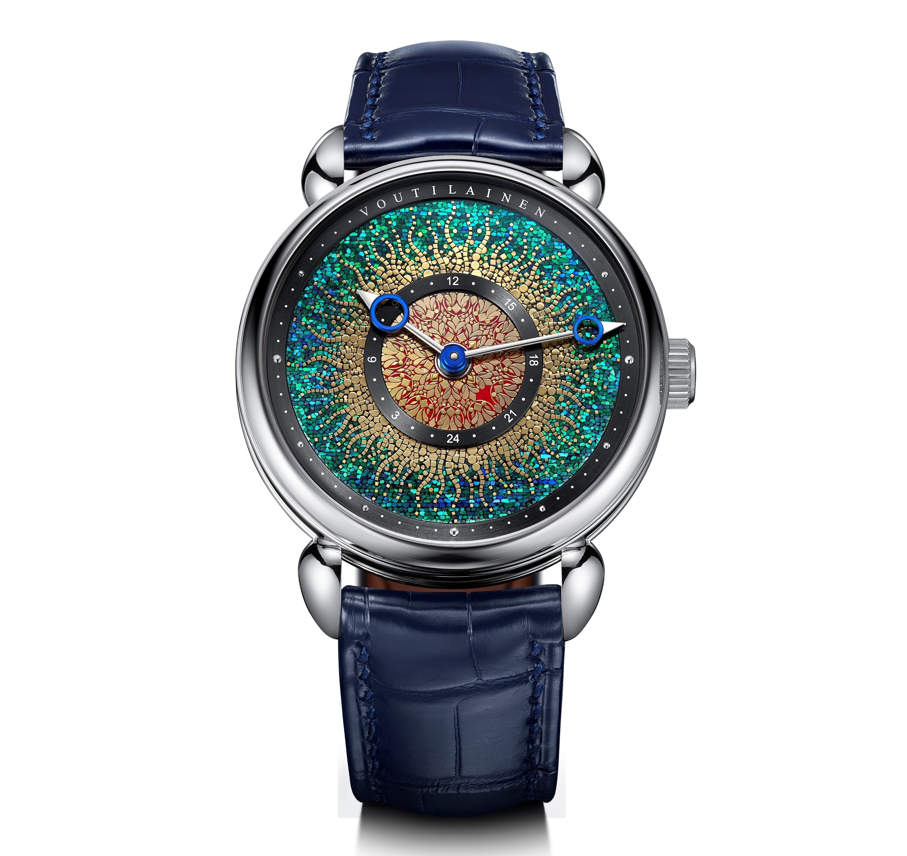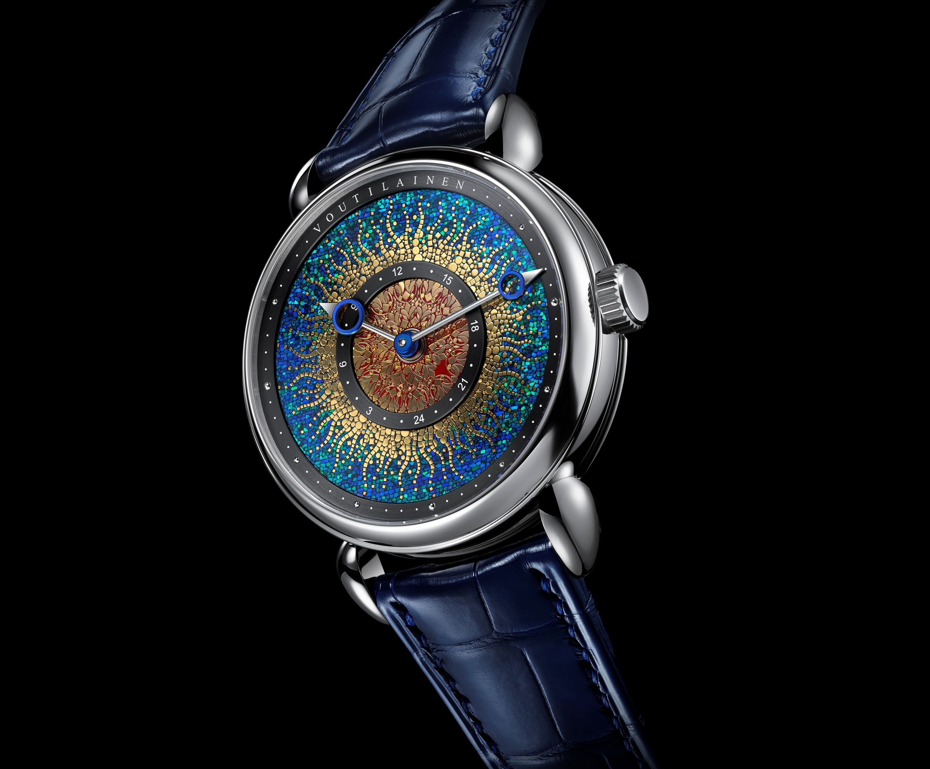 La Voutilainen 28GML Souyou est un chef -d’œuvre qui allie l’extraordinaire art de la laque japonaise de M. Tatsuo Kitamura à l ’engagement de l’atelier Voutilainen en faveur de la longévité, laprécision et la tradition horlogère classique. Cette montre offre un équilibre parfait entre excellence esthétique et mécanique, mêlant influences orientales et occidentales. Le cadran envoûtant s’inspire de la devise « Souyou » – un terme inventé qui reflète le contraste saisissant entre le bleu-vert, l’or et le rouge : « Sou » évoque des nuances profondes et limpides de bleu-vert représentant la mer, tandis que « You », avec ses nuances dorées et rouges au centre, faitréférence à une forme organique naturelle symbolisant l’énergie solaire. Réalisé selon la technique traditionnelle de laque Urushi, ce cadran demande plus de mille heures de travail minutieux. Cette création exceptionnelle intègre des matériaux naturels tels que l’Urushi (sève d’arbre), le Kinpun (diverses poudres d’or), le Kirigane (feuilles d’or découpées) et le Kirigai (fragments de coquilles de turban vert géant (Turbo marmoratus) et d’ormeau de Nouvelle-Zélande). Idéale pour les grands voyageurs, cette pièce unique affiche les heures, les minutes, ainsi qu’un second fuseau horaire central via un disque qui effectue une rotation complète sur 24 heures, indiquant l’heure du domicile. Subtilement intégrée dans le motif doré sur fond rouge, l’indication du second fuseau horaire est lisible au premier coup d’œil. L’aiguille centrale des heures peut quant à elle être réglée facilement à l’heure locale de la destination par une simple pression sur la couronne.