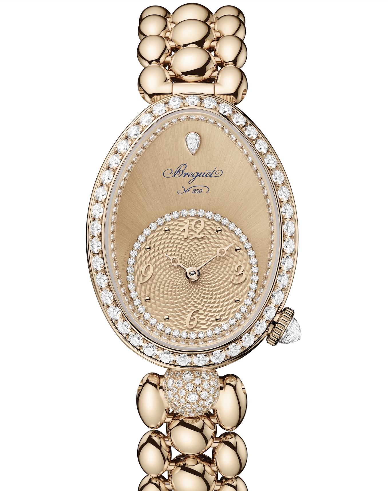 Pour le 250e anniversaire de la Manufacture Breguet, la collection Reine de Naples est enrichie de nouveaux modèles portant les références 9935 et 8925. Les premières bénéficient d’un nouveau mouvement, d’un affichage inédit et de nombreux apports esthétiques exclusifs. Les secondes se dotent d’un nouveau visage et d’un bracelet tout en or. Chacune de ces références se pare pour la première fois de l’or Breguet. Ces montres versatiles, conçues comme des bijoux, deviennent le compagnon idéal de chaque instant, tout au long de la journée et au fil des activités. La collection Reine de Naples trouve son inspiration dans la pièce réalisée de 1810 à 1812 pour Caroline Murat. La sœur de l’empereur Napoléon 1er, devenue par la suite Reine de Naples, était collectionneuse de multiples créations signées Breguet. Le dessin original de la montre n’existe plus, mais le registre provenant des ateliers du Quai de l’Horloge nous renseigne sur deux éléments fondamentaux. En premier lieu, sa forme oblongue, qui a inspiré la collection contemporaine. En second lieu, qu’il s’agissait expressément d’une montre-bracelet, ce qui en fait probablement la première, conçue comme telle, de l’histoire de l’horlogerie. Breguet réaffirme ainsi son lien historique avec la clientèle féminine. Depuis ses origines, la Maison a imaginé des créations pour les femmes, de la première montre-bracelet à la légendaire montre de poche dite « Marie-Antoinette », considérée durant près d’un siècle comme la plus compliquée au monde. Fidèle à cet héritage et toujours attentive aux envies de ses clientes, Breguet enrichit aujourd’hui cette ligne emblématique avec un bracelet inédit, créé pour les nouvelles références anniversaire 8925 et 9935.