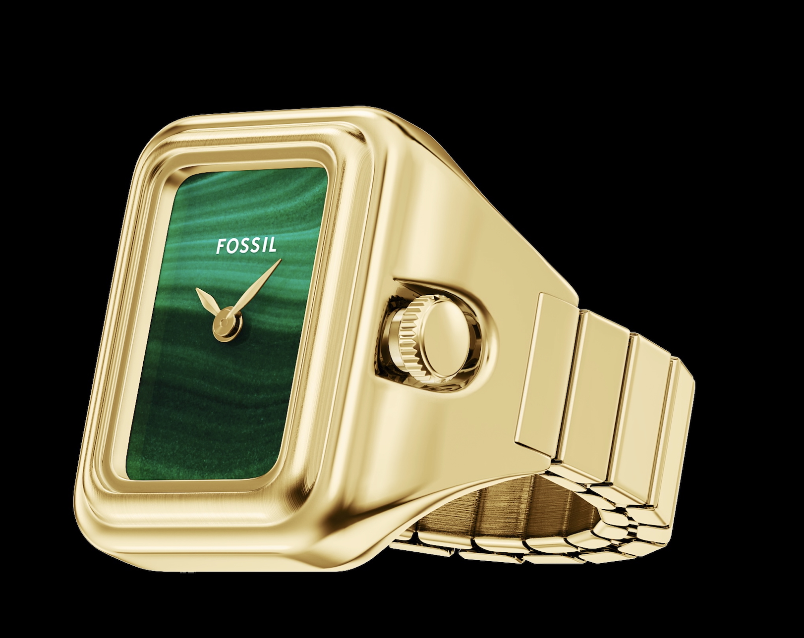 UN COMMENTAIRE ? La mode des bagues-montres, disponible à tous les prix (ici 149 euros pour un « boîtier » de 14 mm étanche à 50 m et doté d’un mouvement à quartz), est assez révélatrice d’une forte demande de montres qui ne soient plus ennuyeuses, mais créatives, ludiques et accessibles. La bonne idée de Fossil est d’avoir adopté le style malachite pour le cadran…