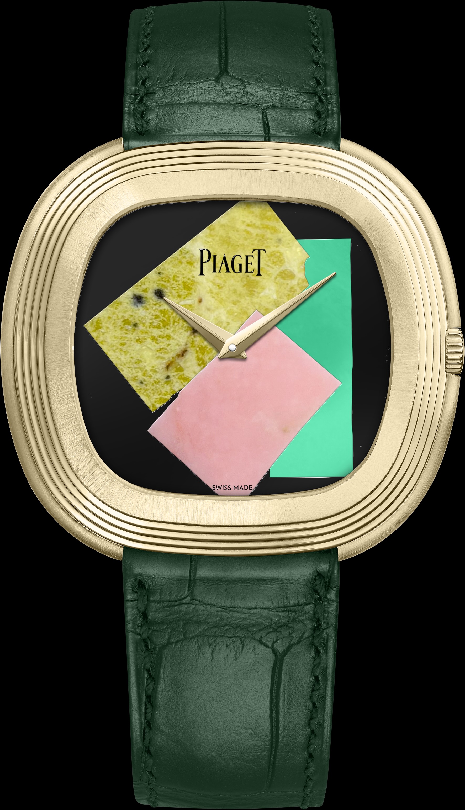 Citant le théoricien des médias Marshall McLuhan, Andy Warhol a un jour déclaré : « L’art, c’est tout ce que l’on peut se permettre. ». Pourtant, quand Piaget a noué son partenariat avec la Fondation Andy Warhol, il en a été tout autrement. Stéphanie Sivrière, la directrice artistique de la Maison et son équipe se sont au contraire plongées dans l'œuvre d’Andy Warhol et le projet collaboratif, et fait le déplacement à New York pour consulter en exclusivité les archives de la fondation, visiter des expositions et dévorer un nombre incalculable d’ouvrages consacrés à l’immense catalogue du roi du pop art. D’un commun accord, les deux partenaires ont décidé que, la première année, la collaboration mettrait à l’honneur la couleur, l’un des éléments clés de l'œuvre d'Andy Warhol, qui s'inspirait souvent des motifs ultracolorés de l'art commercial développé à des fins de marketing et de publicité. « Nous avons passé six mois à faire des recherches sur Andy Warhol avant de choisir une piste », raconte Stéphanie Sivrière. « Son œuvre est tellement vaste, qu'il a été extrêmement difficile de savoir par où commencer. Par ses créations les plus célèbres en proposant une réinterprétation d’une banane, d’une conserve de soupe, ou encore de Marilyn Monroe ? Nous avons très vite réalisé que nous souhaitions exprimer l’univers de Warhol sans que ce soit trop évident. Suggérer plutôt que montrer. La fondation nous a encouragés à appréhender le projet en toute liberté, et à interpréter Warhol dans le style expressif et sans limite de Piaget. Le résultat est une montre qui raconte l'histoire de notre collaboration mais qui s'impose comme une pièce d'art horloger à part entière, un objet de collection inspiré de l'un des collectionneurs les plus prolifiques de l'histoire. » Dans la montre Andy Warhol Collage Limited Edition, le motif du cadran résulte de l'application méticuleuse de quatre pierres ornementales qui ont été façonnées, taillées et agencées selon les techniques de la marqueterie, métier d’art ancestral. En hommage à la montre de 1973 qu’Andy Warhol possédait personnellement, le cadran est en onyx noir, rehaussé de fines tranches de pierres ornementales colorées : serpentine jaune de Namibie, opale rose et chrysoprase verte. Le boîtier à gradins de 45 mm en or jaune 18 carats est monté sur un bracelet en cuir vert, une couleur intense et mûrement choisie pour enrichir la palette sans détourner l'attention du cadran. La montre Andy Warhol Collage Limited Edition est dotée d’un fond en or 18 carats au fini satiné vertical. La montre abrite le mouvement Manufacture à remontage automatique 501P1 de Piaget, une unité de puissance extra-plate dotée d’une réserve de marche de 40 heures et ornée de Côtes de Genève circulaires. Enfin, sur le fond du boîtier sont gravés plusieurs éléments : une reproduction de l'autoportrait d’Andy Warhol qui a inspiré le cadran, le logo Piaget et la signature d’Andy Warhol. Une édition résolument collector.