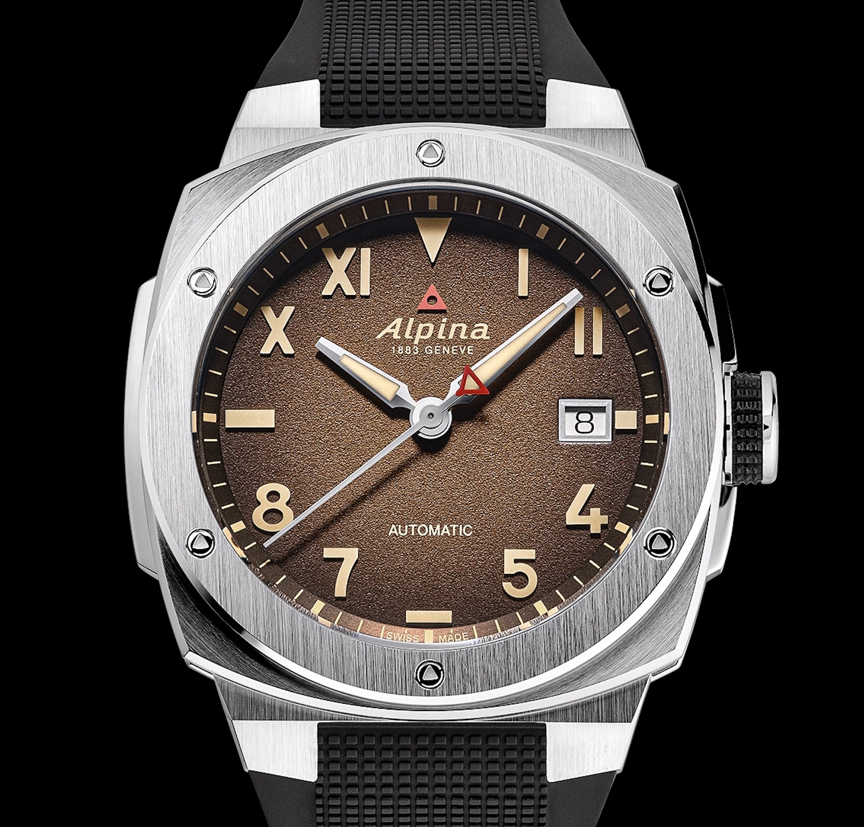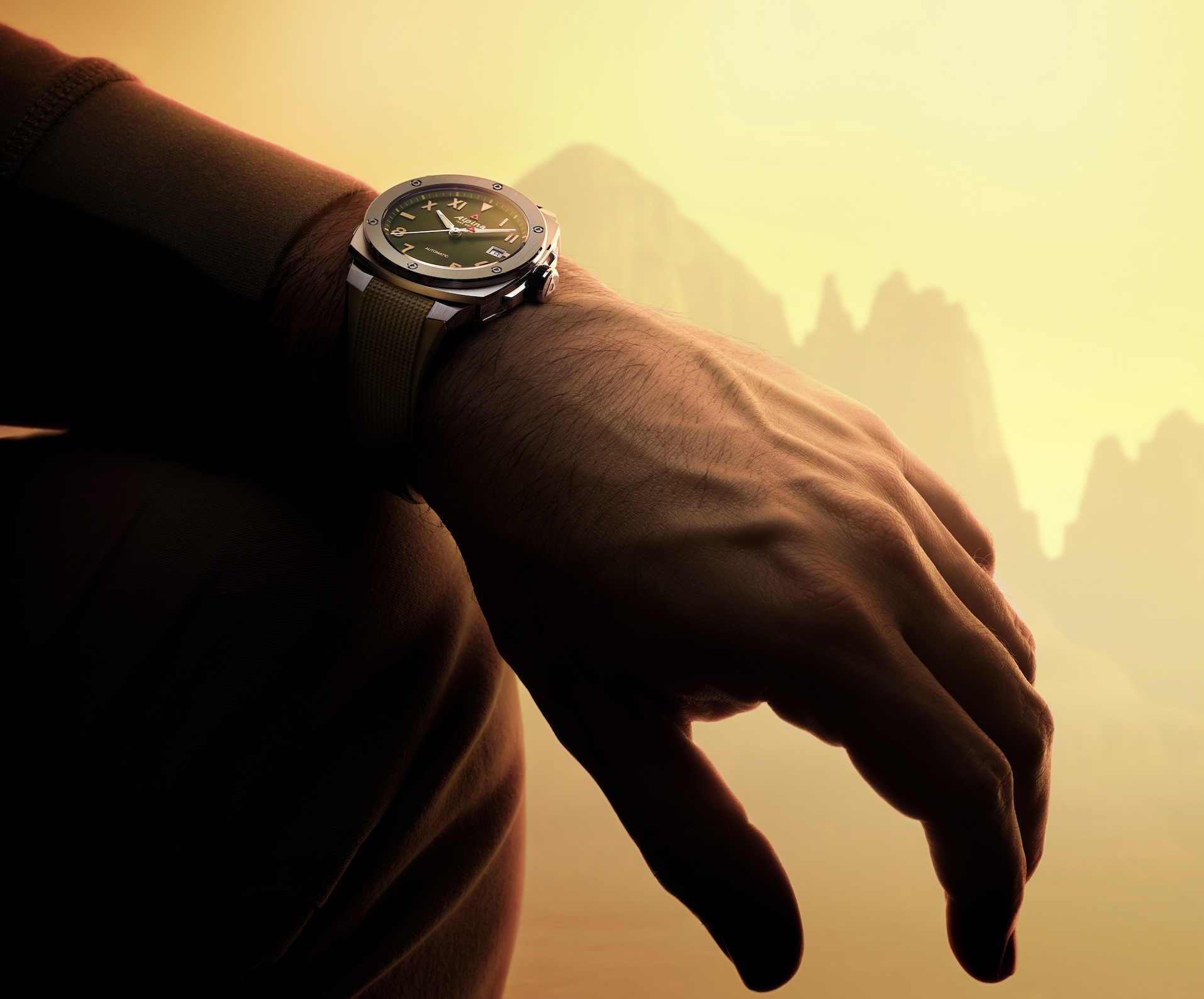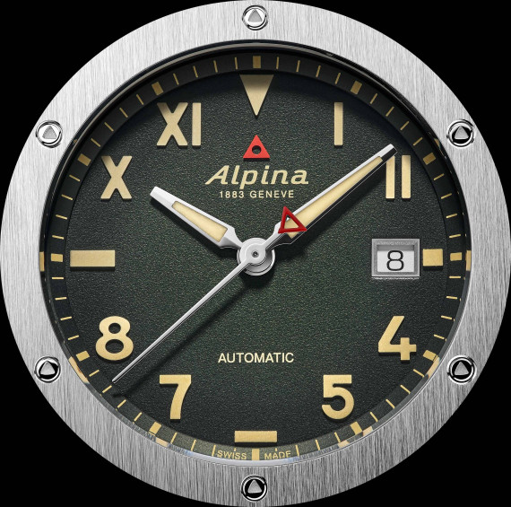 Ensuite, par la création de deux couleurs inédites de cadran. Le premier est Sunburst. C’est un classique horloger. Il consiste à reproduire les nuances du soleil couchant sur l’horizon du Pacifique. À mesure que l’on se rapproche du réhaut incurvé de la minuterie, le soleil se couche, le brun se teinte d’une pointe de noir sur lequel peuvent s’éclairer les index luminescents. Le second reprend le même principe avec un dégradé de vert sapin. Le choix n’est pas anodin : c’est l’appel de la forêt et de la conquête des cimes, environnement natif de la maison Alpina, née sur les contreforts alpins. Le vert est profond sur les bords, plus doux au centre. Enfin, les deux nouvelles Alpiner Extreme Automatic California se conforment à l’esprit vintage et le célèbre coussin se dessine désormais en 39 x 40,5 mm, un format consensuel et unisexe, prisé des collectionneurs. La nouvelle boîte acier reprend les finitions de ses aînées, avec une lunette en brossé vertical, posé sur une carrure en satiné circulaire. Les chanfreins sont polis miroir, soulignant les lignes de fuite de cette construction complexe et iconique d’Alpina. Les deux références sont animées par le calibre automatique AL-525, largement éprouvé dans les collections de la maison. Il dispose d’une date à trois heures et d’une réserve de marche de 38 heures.