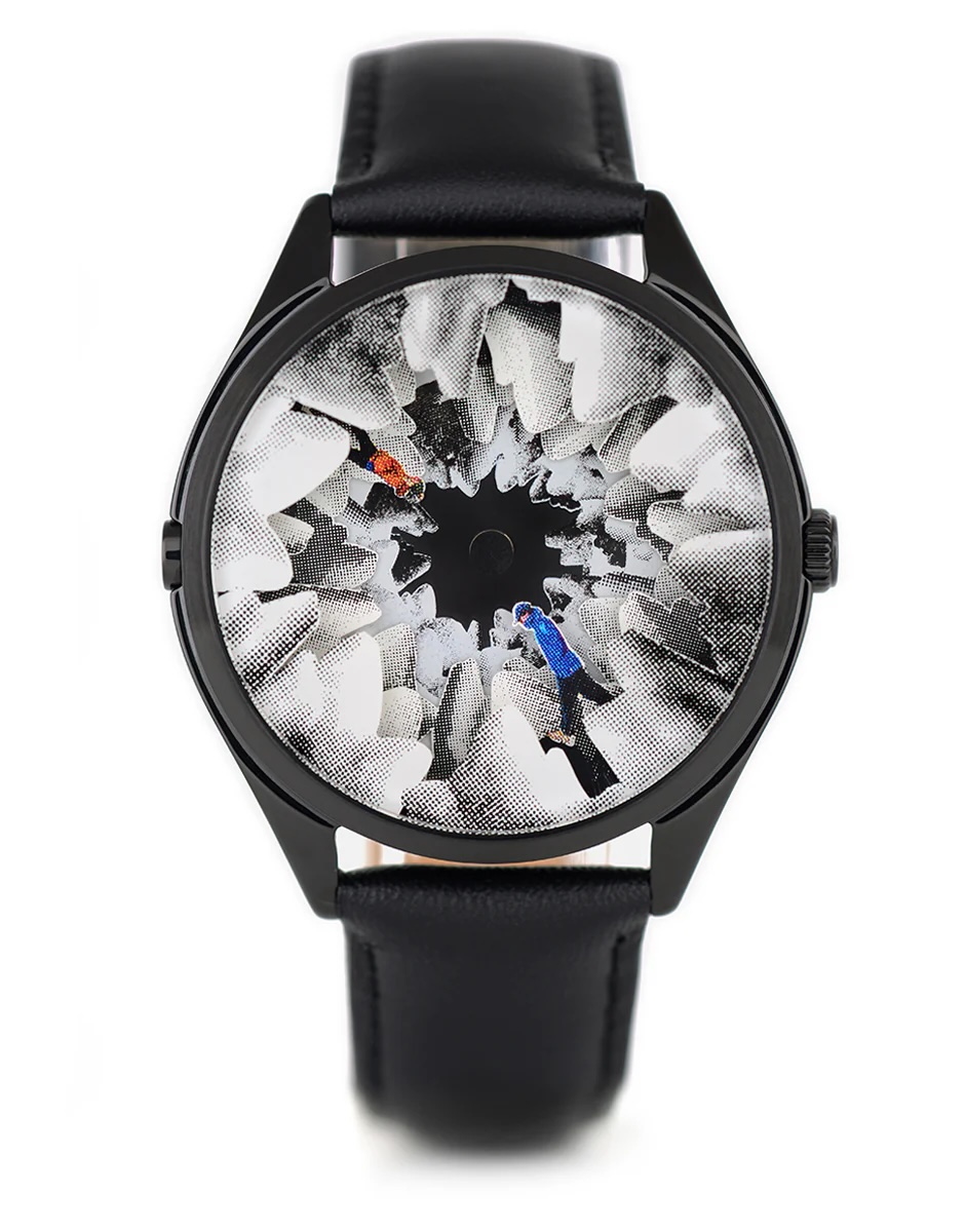 Créé par l'artiste et éducateur Robin Williamson, K9 est une célébration des détours, des découvertes et de la joie de sortir des sentiers battus. Inspiré par les voyages à pied où chaque mauvais virage devient une nouvelle aventure, le design transforme l'inattendu en quelque chose d'extraordinaire. L'étincelle est venue lorsque Robin a trouvé l'une des dents de lait de son chien sur le sol. Les sommets incurvés et l'émail blanc brillant lui rappelaient une chaîne de montagnes glaciaires, suscitant l'idée d'un paysage à la fois intime et immense. De cette petite relique est née un vaste monde glacé oùl'imagination et la mémoire se heurtent. Tout comme les sentiers de randonnée s'enroulent et divergent, les aiguilles mobiles de la montre tracent un voyage sans fin à travers un terrain circulaire changeant.Comment lire l'heure ? Deux explorateurs errent dans ce paysage surréaliste : La figure vêtue de bleu pointe vers les minutes Le caractère en orange marque les heures. Robin explique son inspiration de conception pour K9 : « Chaque année, je pars en vacances à pied avec des amis. L'un d'entre eux, qui travaillait avec des cartes, ne peut apparemment pas en lire une, et il nous conduit régulièrement dans la mauvaise direction. Cependant, cela pourrait être ma partie préférée de nos voyages, car nous voyons beaucoup plus de notre environnement.Cet aspect a alimenté ma conception, avec ce sentiment d'être perdu dans le temps et d'embrasser notre environnement. Les pics incurvés et les blancs brillants de la dent de mon chien m'ont rappelé de vieilles photographies d'explorateurs polaires. » Robin Williamson est un artiste et conférencier d'université de Bedford, en Angleterre. Sa pratique comprend des sculptures interactives faites à la main et des machines de gravure qui encouragent et documentent l'interaction du public.