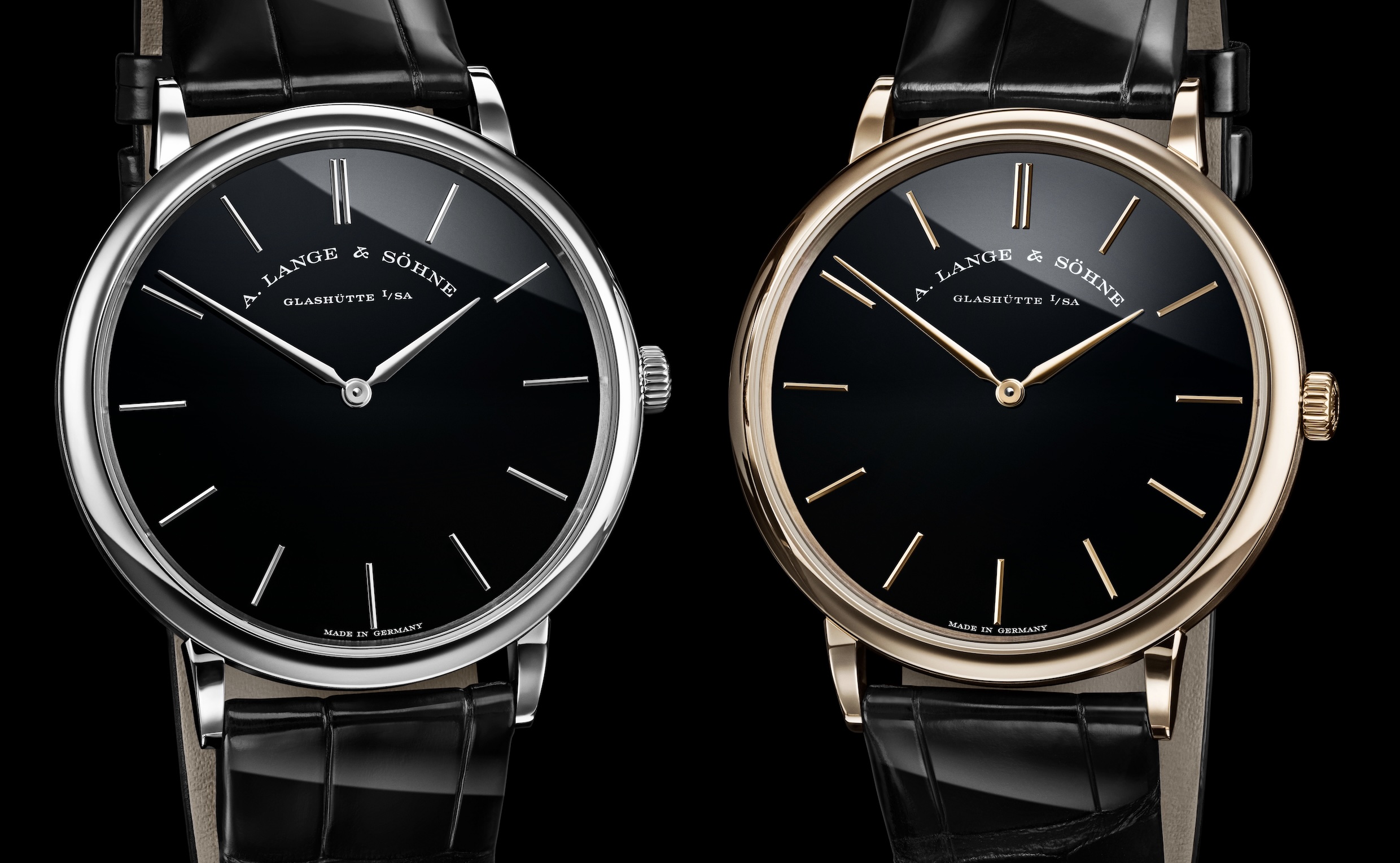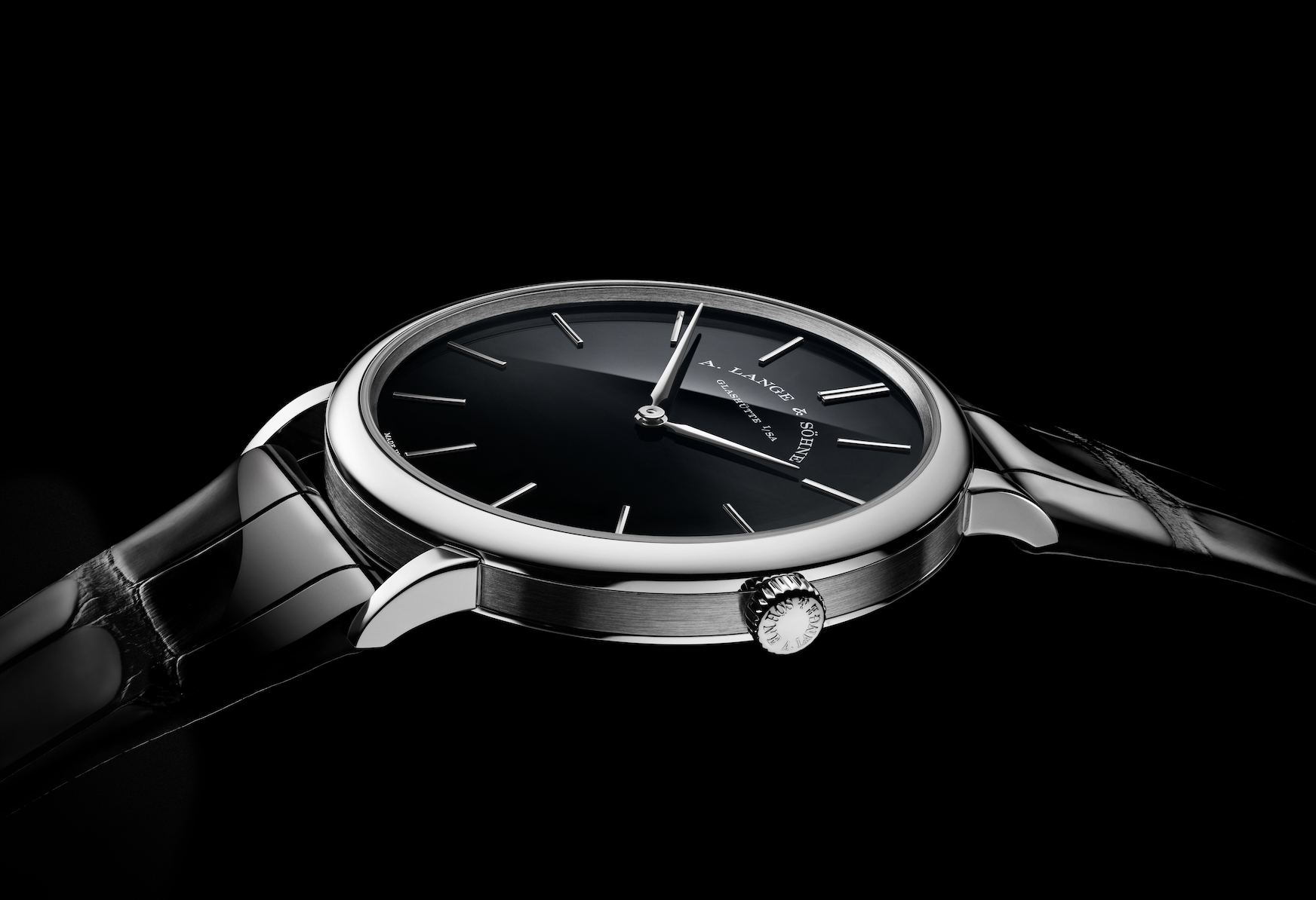 L’épure et la clarté réduites à leur essence même guident le design si singulier de la Saxonia Plate. Avec ses appliques et ses deux fines aiguilles, le cadran se dédie exclusivement à l'affichage des heures et des minutes. Son harmonie résulte de proportions parfaitement adaptées. En témoignent le soin apporté aux moindres détails de ce garde-temps. Les designers d'A. Lange & Söhne ont consacré unegrande partie de leur travail à optimiser la longueur et la forme des aiguilles, à parfaire les appliques bâton et leurs chanfreins polis, ou encore à ciseler l'élégant boîtier en trois parties qui confère sa légèreté caractéristique à la Saxonia Plate. Deux nouvelles combinaisons de couleurs à l’éclat remarquable Le cadran en onyx qui orne les nouvelles versions confère noblesse et allure à la composition esthétique. Rarement utilisée en horlogerie de précision, cette pierre précieuse fascine par sa surface noire, intense et brillante. Dans la version en or miel 750/1000, sa teinte sombre s'harmonise parfaitement avec l'éclat chaleureux du métal précieux. Dans la version en platine 950/1000 aux tons froids, elle offre un contraste saisissant qui fait ressortir les appliques et les aiguilles sur le fond du cadran.