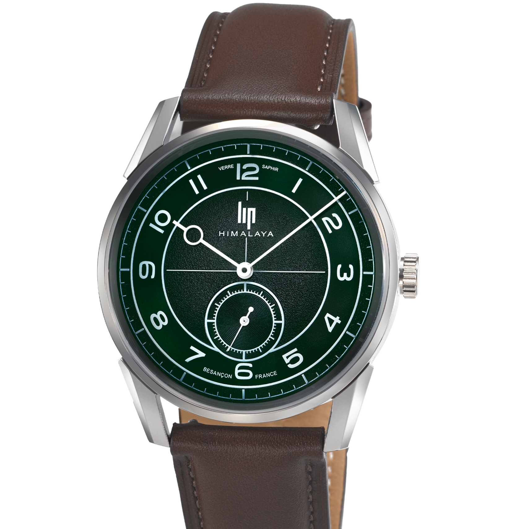 En 1950, Maurice Herzog et Louis Lachenal marquent l’Histoire en atteignant le sommet de l’Annapurna, devenant les premiers hommes à conquérir un sommet de plus de 8 000 mètres. À leur poignet : des montres Lip Himalaya, témoins fiables de cet exploit historique. Depuis, Lip perpétue cet héritage à travers des montres sportives et élégantes, pensées pour accompagner chaque instant de la vie. Entre élégance classique et design intemporel, ce modèle présente un boîtier de 40 mm en acier inoxydable 316L poli et brossé, associé à un bracelet en cuir marron surpiqué ton sur ton, fermé par une boucle ardillon chromée siglée Lip. Son cadran vert foncé soleillé et sablé, affiche des chiffres arabes blancs, un compteur petite seconde à 6 h et des aiguilles blanches protégées par un verre saphir antireflet. Dotée d’un mouvement quartz, d’un fond vissé et étanche jusqu’à 50 mètres, cette montre combine élégance et fiabilité au quotidien.