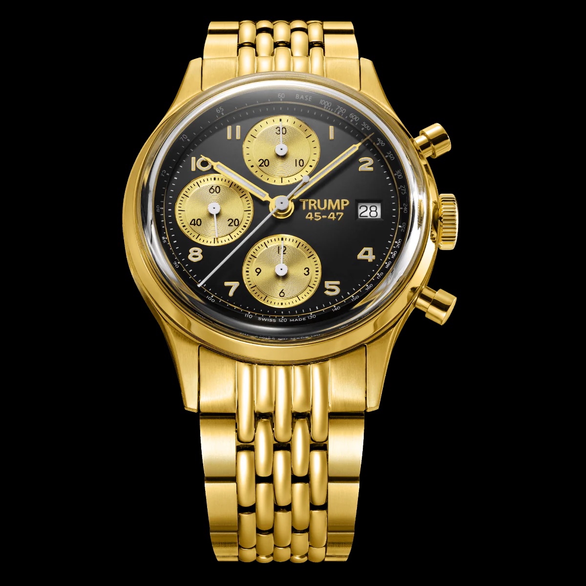Que vous naviguiez dans une journée de travail rapide ou un week-end plein d'action, le Trump Racer Chrono est conçu pour suivre votre emploi du temps exigeant. Le Trump Racer Chrono offre un cadran noir mat frappant avec des sous-cadrans et des aiguilles dorés. Cette combinaison de couleurs a été conçue pour une clarté et une précision ultimes. Avec un beau placage d'or 18 carats (la couleur préférée du président !) sur le boîtier et le bracelet, cette montre est une déclaration incroyable de qui vous êtes et que vous êtes avec les meilleurs. Ce bracelet de riz plaqué or 18 carats est complété par ces cadrans dynamiques - son design à maillons distinctif reflète magnifiquement la lumière. Que vous travailliez ou que vous alliez à un mariage ou à un dîner chic, cette montre est conçue pour avoir un impact, alliant performance et luxe. Le cadran noir et or frappant du Trump Racer Chronograph présente fièrement son nom emblématique en relief en or, se détachant sur le fond noir de jais. L'inscription « 45-47 » sert d'hommage durable à l'héritage du président Trump, commémorant son nouveau rôle de 47e président. Cette montre est une déclaration audacieuse d'admiration et de soutien. Ajoutant à son caractère unique, la signature de Trump est élégamment gravée en or sur le rotor du mouvement du chronographe, ce qui en fait une authentique création Trump. Avec des index, des aiguilles et des sous-cadrans dorés, cette montre offre une lisibilité exceptionnelle dans toutes les conditions tout en dégageant une élégance et un raffinement indéniables - un reflet du style signature de Trump.