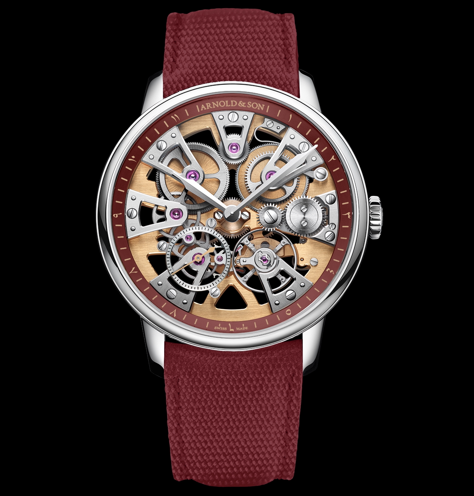 Arnold & Son et Ahmed Seddiqi célèbrent les 75 ans du détaillant avec une édition limitée de 10 pièces, la Nebula 40 Steel, dont le calibre squelette s’impose par son agencement harmonieux et son style particulier. Boîtier en acier de 40 mm, finitions de mouvement remarquables, densité technique unique : cette création se distingue par son élégance et sa puissance. La Nebula se démarque de tout autre squelette. Par sa structure, elle incarne l’horlogerie. Par son style, elle exprime une élégance singulière. Fondée en 1950 à Dubaï, Ahmed Seddiqi est devenue la référence horlogère du Moyen-Orient, incarnant passion, savoir-faire et transmission. En 75 ans, l’enseigne familiale a bâti un héritage unique, rassemblant les plus grandes maisons horlogères et cultivant un rôle d’ambassadeur de la haute horlogerie dans la région. Cette édition limitée rend hommage à cette histoire d’excellence et célèbre une relation privilégiée entre Arnold & Son et la famille Seddiqi. Cette édition anniversaire peut se porter avec un choix de trois bracelets : acier à trois maillons, cuir de veau de couleur grenat et tissu technique assorti. La platine squelettée et les barillets dorés dialoguent avec les chiffres arabes orientaux apposés sur le réhaut grenat. Les ponts palladiés rappellent l’acier du boîtier, créant un équilibre de matières et de nuances.