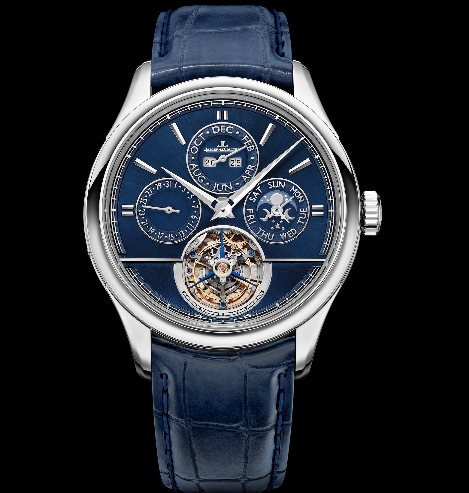 Autant de qualités qui en font le spiral idéal pour le Calibre 985. Entièrement développé et produit par la Manufacture, le Calibre 985 est un mouvement complexe et sophistiqué composé de 431 pièces, dont 83 pour le seul tourbillon volant. Fabriqué en titane, il ne pèse que 0,386 gramme et offre toutes les fonctions d’un quantième perpétuel, ainsi qu’une phase de lune qui ne nécessitera aucun ajustement avant 122 ans. Au verso, un verre saphir révèle l’exceptionnelle minutie des finitions de Haute Horlogerie du mouvement : vis bleuies, Côtes de Genève soleillées, colimaçonnage ou encore anglage à la main. La masse oscillante en or rose 916/1000 présente une gravure soleillée et une reproduction de la médaille d’or décernée à Antoine LeCoultre lors de l’Exposition universelle de 1851 à Londres, « The Great Exhibition ». À cette occasion, l’horloger avait été récompensé pour la mise au point de machines à tailler et à timbrer et de tours mécaniques finement calibrés, favorisant l’interchangeabilité des composants. Alliant design étudié et structure complexe, la boîte de la Master Grande Tradition compte plus de 80 pièces. Avec ses cornes vissées et sa juxtaposition de surfaces polies, satinées et microbillées, elle reflète le raffinement des plus beaux calibres de la Maison. Sur la version or rose, la chaleur du métal est prolongée par le brun voluptueux du cadran. Inversement, les tons froids des pièces en platine offrent un contraste saisissant avec le cadran bleu profond, accentué par une lunette intensément polie ou sertie de 72 diamants taille baguette pour un total d’environ 3,4 carats – une ornementation qui a nécessité 15 heures de travail au sein de l’atelier des Métiers Rares de la Manufacture.Le cadran est, quant à lui, séparé en deux par un pont anglé à la main : la partie inférieure qui entoure le tourbillon est ainsi plus basse que la partie supérieure pour des raisons à la fois esthétiques et techniques. De minuscules détails et de subtiles variations dans les nuances ajoutent à l’intérêt visuel : le chemin de fer et le pourtour microbillés de chaque compteur contrastent avec leur cœur opalin qui semble changer de couleur selon la lumière ; les lettres et chiffres tridimensionnels des indications calendaires sont, eux, gravés au laser en relief pour se détacher du fond. Soulignant la précision de la chronométrie, le tourbillon est accompagné d’une échelle de 20 secondes figurant sous son guichet. Cet arc de cercle est parcouru par chacune de ses trois aiguilles bleues le temps d’une rotation complète de la cage autour de son axe en 60 secondes. Multipliant les complications et les composants, les fascinants calibres de la collection Master Grande Tradition incarnent l’esprit d’innovation et le souci de précision de la Grande Maison. Une sophistication doublée d’une minutie remarquable dans la décoration et la finition, aussi bien du mouvement que de l’habillage. Les nouveaux cadrans de la Master Grande Tradition Calibre 985 ajoutent à l’élégance et à l’épure du design, tandis que le fond en verre saphir lève le voile sur la beauté intrinsèque de l’ensemble.