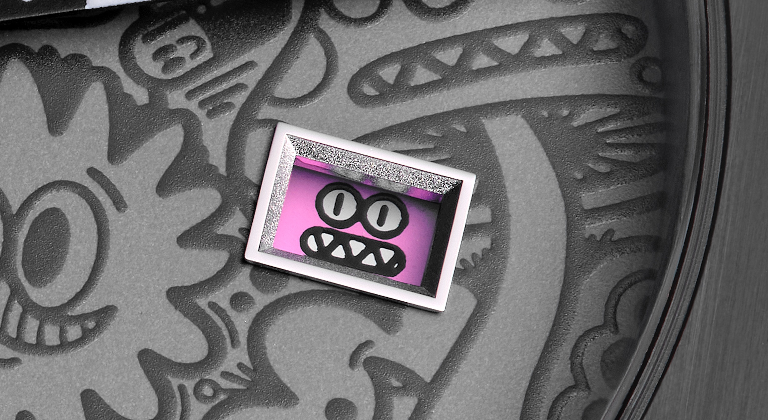 UN COMMENTAIRE ? Une montre plutôt originale, tant par son concept de décoration que par son prix (moins de 1 400 euros), qui s’explique aussi par le mouvement à quartz suisse de ce boîtier de 40 mm x 9 mm d’épaisseur, étanche à 100m et doté d’une grammaire graphique alternative pour l’affichage du calendrier. Ambiance Halloween garantie…