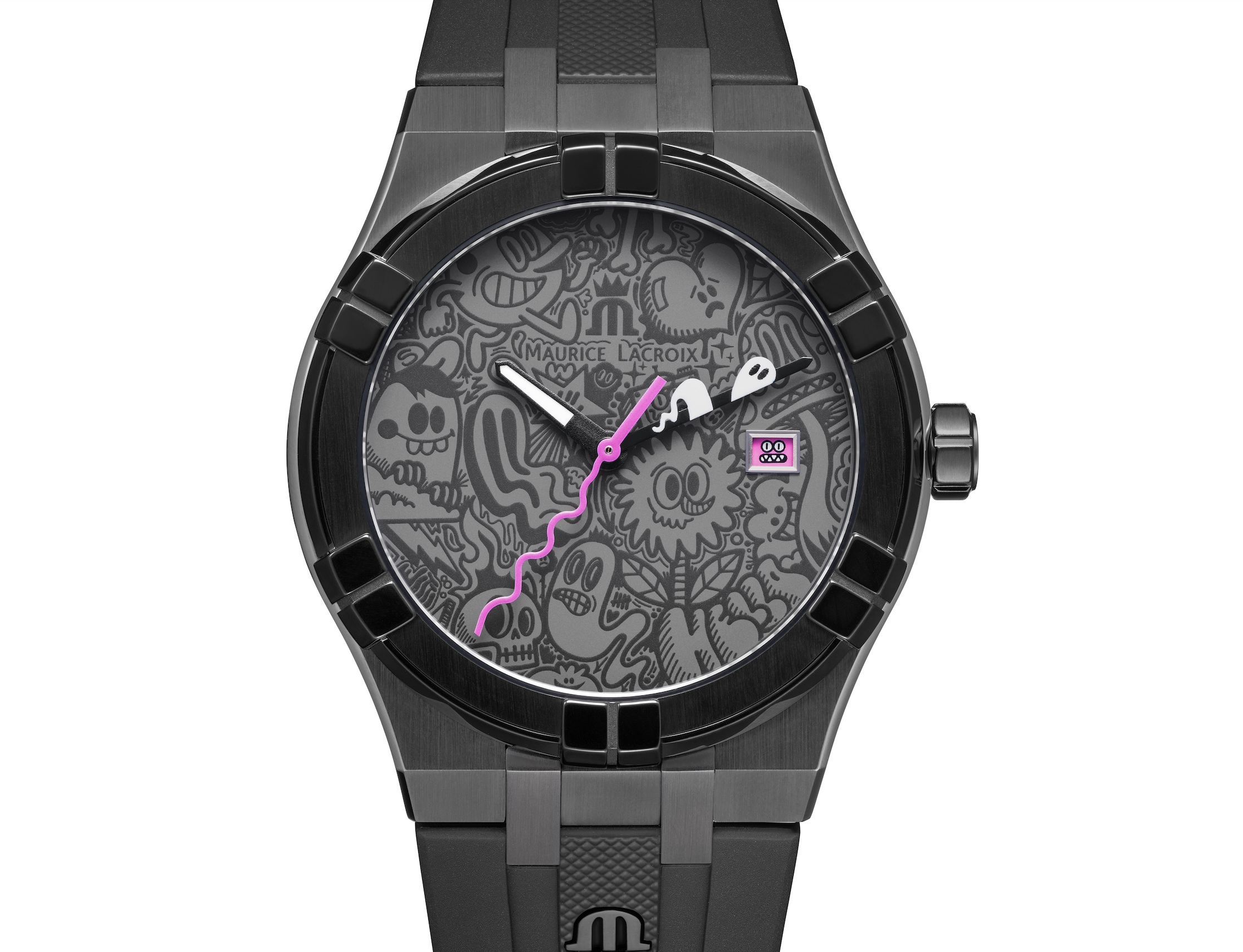 Maurice Lacroix provoque une nouvelle rencontre entre horlogerie suisse et art contemporain avec le lancement de l’Aikon Quartz Wotto Limited Edition. Fruit du dialogue continu entre la manufacture suisse et l’artiste britannique Wotto, alias Craig Watkins, cette création transforme le poignet en une élégante galerie d’art miniature. Reprenant le design emblématique de la collection Aikon, cette nouveauté dénote en jouant subtilement la carte du mystère. Le boîtier en acier inoxydable bénéficie d’un double traitement PVD couleur gunmetal qui lui confère une teinte gris anthracite particulière, contrastant avec une lunette noire. Cette palette monochrome sert de parfait emballage aux surprises colorées qui ponctuent discrètement la montre. Car c’est bien dans les détails que se révèlent toutes les énigmes poétiques de cette création. Le véritable coup de maître réside ici dans l’intégration harmonieuse de l’univers artistique de Wotto. Sur le cadran gris anthracite, ses créatures emblématiques – crânes, fantômes et autres figures de son bestiaire fantastique – se dévoilent en impression ton sur ton, créant un effet de profondeur saisissant. L’aiguille des minutes révèle un détail particulièrement ingénieux : ornée d’un petit fantôme luminescent, elletransforme chaque lecture de l’heure en clin d’œil cachotier. Associées aux index absents du cadran, ces aiguilles noires mates dotées de Super-LumiNova blanc garantissent une lisibilité optimale tout en préservant l’esthétique épurée de l’ensemble. Une aiguille des secondes d’un rose vibrant serpente sur le cadran, le même rose dont se parent les passants du bracelet en caoutchouc noir équipé du système Easychange de Maurice Lacroix. Sa boucle métallique reprend la teinte grise canon de fusil de la carrure. L’innovation la plus remarquable de cette Aikon réside dans son approche révolutionnaire de l’affichage de la date. Abandonnant les traditionnels chiffres, Wotto a créé 31 dessins uniques qui se succèdent sur le disque de date, chaquejour devenant ainsi au regard du porteur l’occasion de la découverte d’une nouvelle œuvre miniature inédite. Il suffit de retourner le précieux objet pour réaliser le sérieux de la conception technique de cette nouvelle réalisation horlogère signée Maurice Lacroix. Le fond de boîte porte fièrement la mention « Maurice Lacroix x Wotto » ainsi que le numéro de l’exemplaire, témoignant de l’authenticité de cette collaboration artistique limitée à 500 pièces seulement. Le boîtier d’un diamètre de 40 millimètres et étanche jusqu’à 100 mètres protège la mécanique réputée du mouvement quartz Ronda 515. Proposée en Suisse au prix de CHF 1 200.-, cette Aikon Quartz Wotto Limited Edition s’inscrit parfaitement dans la philosophie de Maurice Lacroix : rendre accessible l’horlogerie suisse, sans compromis sur la qualité nil’originalité. Présentée dans un écrin spécialement développé pour l’occasion, elle constitue le cadeau parfait, combinant style et sophistication.