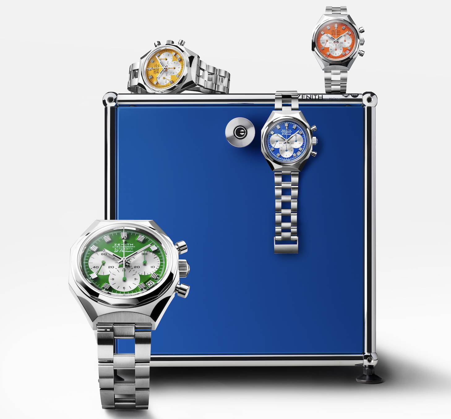 La Defy Chronograph USM s’impose comme une pièce unique dans l’histoire de la collection. C’est une création qui n’a jamais existé… mais qui semble avoir toujours été là. Breveté en 1965, le système de mobilier modulaire USM Haller s’est imposé comme une icône de modernité intemporelle. Reconnaissable à ses tubes en acier chromé, ses sphères d’assemblage et ses panneaux métalliques colorés, il incarne une esthétique unique, alliant clarté, flexibilité et élégance industrielle. Plus de cinquante ans après sa création, sa capacité à se réinventer et à stimuler la créativité demeure inégalée, faisant de lui le reflet parfait de l’héritage de précision et d’innovation propre à Zenith.Le boîtier en acier de 37,3 mm conserve les lignes fortes de l’originale, avec une lunette à 14 pans et des poussoirs type « pompe » qui renforcent son allure vintage. Elle est montée sur le célèbre bracelet « ladder » créé en 1969 par la manufacture Gay Frères pour Zenith. Étanche à 10 ATM, elle associe robustesse et sophistication. Le cadran, structuré par des index carrés aux rainures horizontales, affirme une identité architecturale forte. Il est décliné en quatre coloris emblématiques de l’univers USM : Vert USM, Orange Pur, Jaune Doré et Bleu Gentiane. Chaque teinte rend hommage à la palette modulaire du système Haller. Les trois compteurs de chronographe, en finition argentée cerclée, apportent relief et profondeur. Leur motif azuré rappelle subtilement la poignée USM. Détail ludique et symbolique : l’aiguille centrale du chronographe se termine par une mini-sphère USM Haller remplie de SuperLuminova. Lors de l’activation du chronographe, elle laisse apparaître discrètement l’étoile Zenith, clin d'œil à l’attention portée aux détails et à la narration intégrée dans la pièce. Chaque couleur est produite à seulement 60 exemplaires. À l’intérieur, on retrouve le célèbre calibre El Primero 400, descendant direct du tout premier chronographe automatique haute fréquence dévoilé par Zenith en 1969. Encore aujourd’hui, ce mouvement reste une référence absolue : fréquence de 5 Hz, remontage automatique, roue à colonnes, affichage des heures, minutes, petite seconde, fonctions chronographe et date à 4 h 30. Visible à travers le fond en saphir, la masse oscillante est décorée d’une étoile ajourée, accompagnée des logos Zenith El Primero et USM. Une signature élégante qui illustre l’union parfaite entre horlogerie et design industriel. Chaque montre est disponible seule ou en coffret complet, comprenant également un meuble USM exclusif et un écrin conçu spécialement pour cette édition.