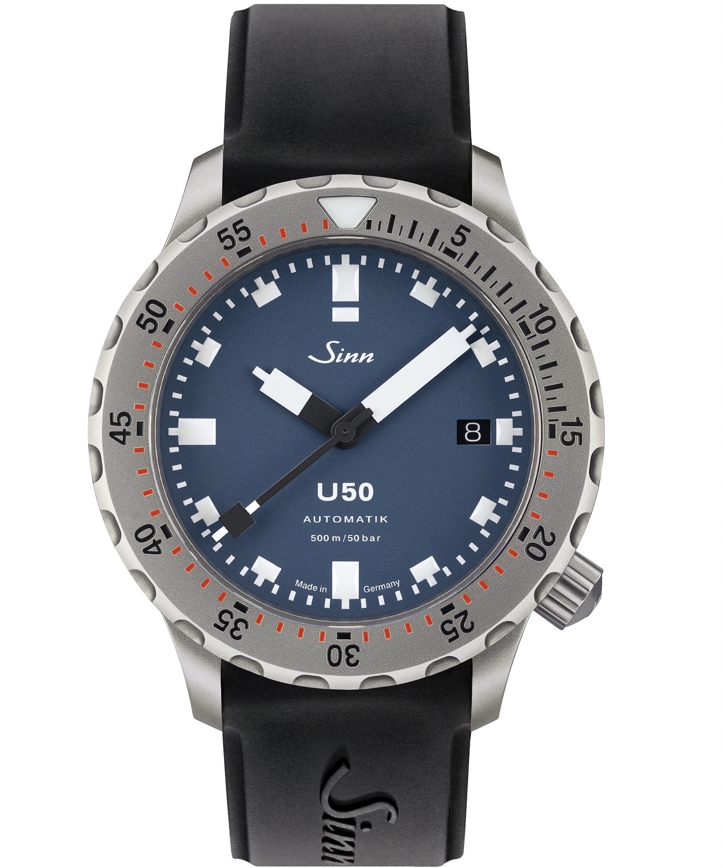 Le modèle U50 B est un instrument de précision pour plongeurs, et en même temps une affirmation forte en matière de design. Le cadran bleu mat saisissant attire immédiatement le regard, signale un professionnalisme absolu et souligne la fonctionnalité sans compromis de cette montre – notamment grâce aux index et aux aiguilles blancs, luminescents, qui offrent un contraste parfait. Le résultat : un ensemble harmonieux avec une lisibilité exceptionnelle. Dans la plus pure tradition Sinn, la U50 B associe un design réfléchi à une excellence technique : le boîtier et la couronne sont réalisés en acier de sous-marin à haute résistance, résistant à l’eau de mer et doté de la meilleure qualité amagnétique. Un matériau utilisé habituellement uniquement dans des conditions maritimes extrêmes. La lunette de plongée captive se révèle particulièrement résistante aux rayures, car elle a été durcie grâce à latechnologie Tegiment. Un détail pratique : la couronne est positionnée à 4 heures, évitant ainsi toute pression sur le dos de la main. Que ce soit pour des plongées ambitieuses ou comme compagnon fiable au quotidien, la U50 B convainc sur toute la ligne, comme le confirment des tests indépendants. Son aptitude à être utilisée sous l’eau a été vérifiée et certifiée par un institut indépendant.