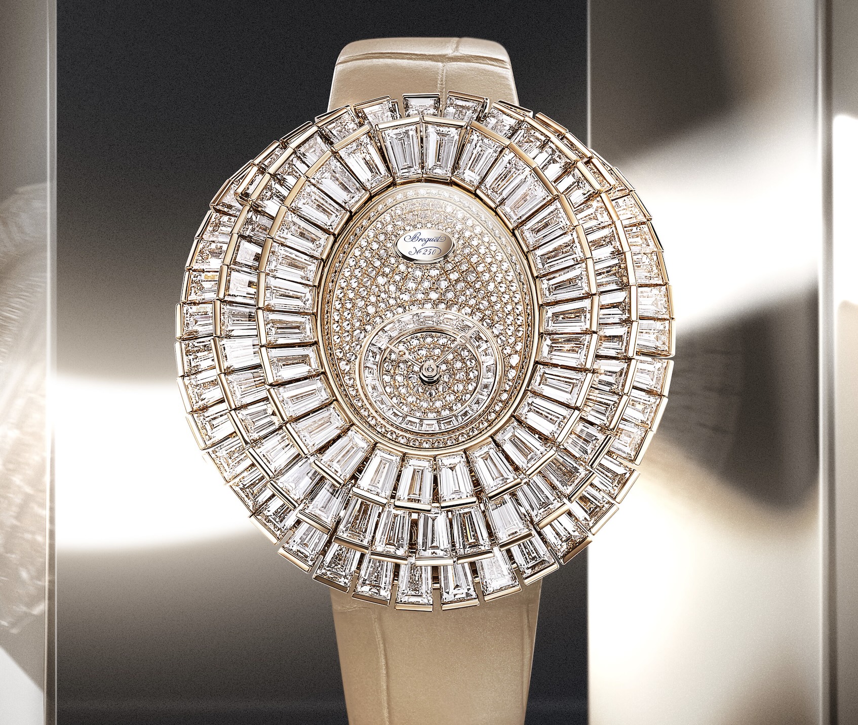 La Reine de Naples est la seule collection 100% féminine signée Breguet. Pour les 250 ans de la Manufacture, deux nouvelles versions Haute Joaillerie sont dévoilées : la Crazy Flower et les Perles Impériales, façonnées en or Breguet. Souplesse, élégance et naturel : les deux nouvelles Reines de Naples, Crazy Flower et PerlesImpériales, partagent un même ADN. Ces deux créations articulent avec délicatesse Haute Horlogerie et Haute Joaillerie. La Crazy Flower, compte 436 diamants. Entièrement pavée (cadran, entourage joaillier, carrure, couronne) dans une composition mobile et déliée l’éclat de ses diamants réfléchit avec intensité les tons chaleureux de l’or Breguet. À l’image d’une fleur sensible au vent qui la caresse, la Reine de Naples Crazy Flower restitue par le diamant la souplesse des mouvements du poignet. La pièce s’inspire directement de la fleur de frangipanier, dont le jaune et le blanc sont un écho au diamant et à l’or Breguet. Pour elle, les artisans joailliers de Breguet ont imaginé plusieurs corolles mobiles entièrement façonnées à la main. Elle est entièrement pavée de diamants baguette. Concentrique et ovoïde, chaque anneau reproduit avec précision la ligne emblématique de la collection Reine de Naples. Les pierres y sont serties une à une, à la main, dans ce mobile en or Breguet qui assure leur mobilité. Libre de se mouvoir avec grâce et légèreté, le geste donnera vie à la Crazy Flower qui en restituera toutes les ondulations avec une parfaite fluidité.