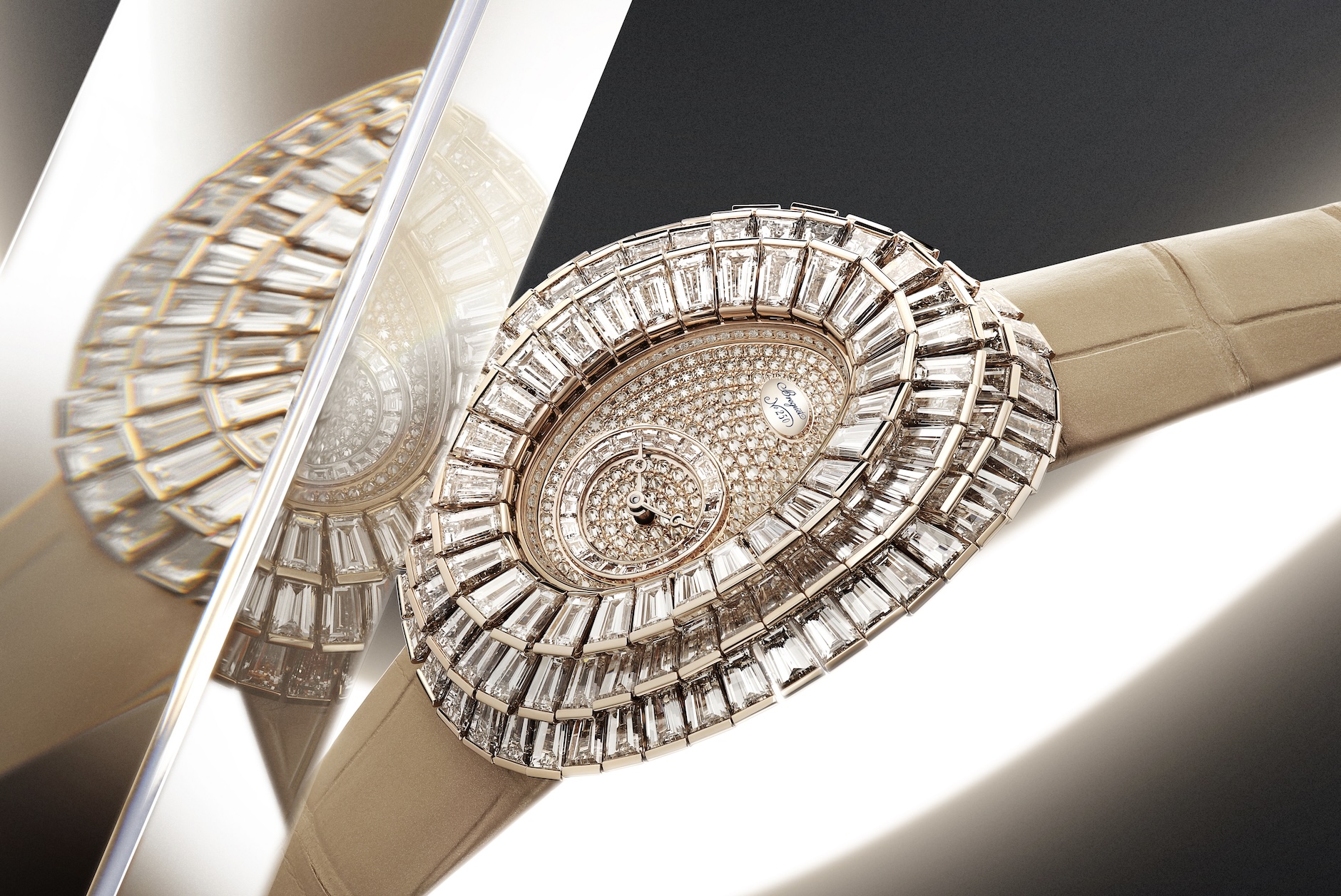 Au cœur de la pièce s’étire un cadran lui aussi entièrement pavé. Bercé en son centre, il accueille sur sa partie basse deux aiguilles Breguet. Elles sont soigneusement cintrées à la main pour s’ajuster à la courbure naturelle du cadran. Heures et minutes sont égrenées au fil d’un chemin de 20 diamants baguette. Tout autour, le plan incurvé du cadran est doté d’un sertissage délicat. Développé spécifiquement pour cette singulière géométrie, il est inversé : la table des pierres est en bas, la pointe vers le haut. L’allégorie est explicite : chaque diamant reproduit à sa manière le pistil de la fleur. Le résultat capte la lumière de façon unique et atypique. Chaque rayon solaire se love autour des pistils diamantés, serpente à travers cette forêt précieuse, se reflète dans les courbes et volutes de l’or Breguet. À midi, un cartouche en or Breguet vient signer la pièce, animée par le calibre 586/1, doté de 38 heures de réserve de marche. Ce mouvement de seulement 3,9 mm d’épaisseur est visible par son fond saphir, où l’on découvrira pour la première fois dans cette version sa masse oscillante en platine guillochée main d’un motif bicolore « Petit Trianon ». Il signe l’appartenance de ce garde-temps d’exception au rang des nouveautés du 250e Anniversaire de la Manufacture Breguet. Chaque pièce, réalisée à la demande, est offerte sur bracelet alligator champagne effet satin, dotée de la triple boucle déployante Breguet, ici sertie de 28 diamants. L’ensemble de la Reine de Naples Crazy Flower comporte 436 diamants totalisant 37.2 carats.