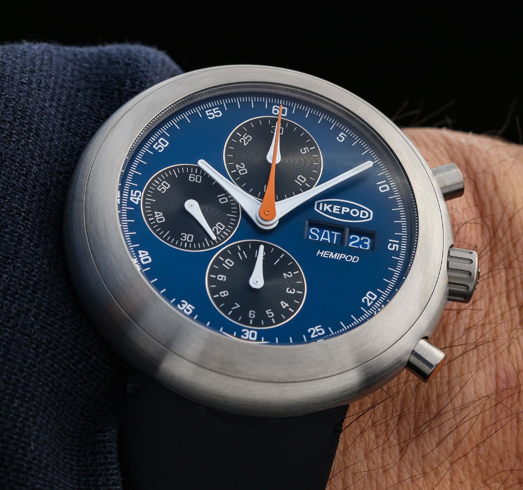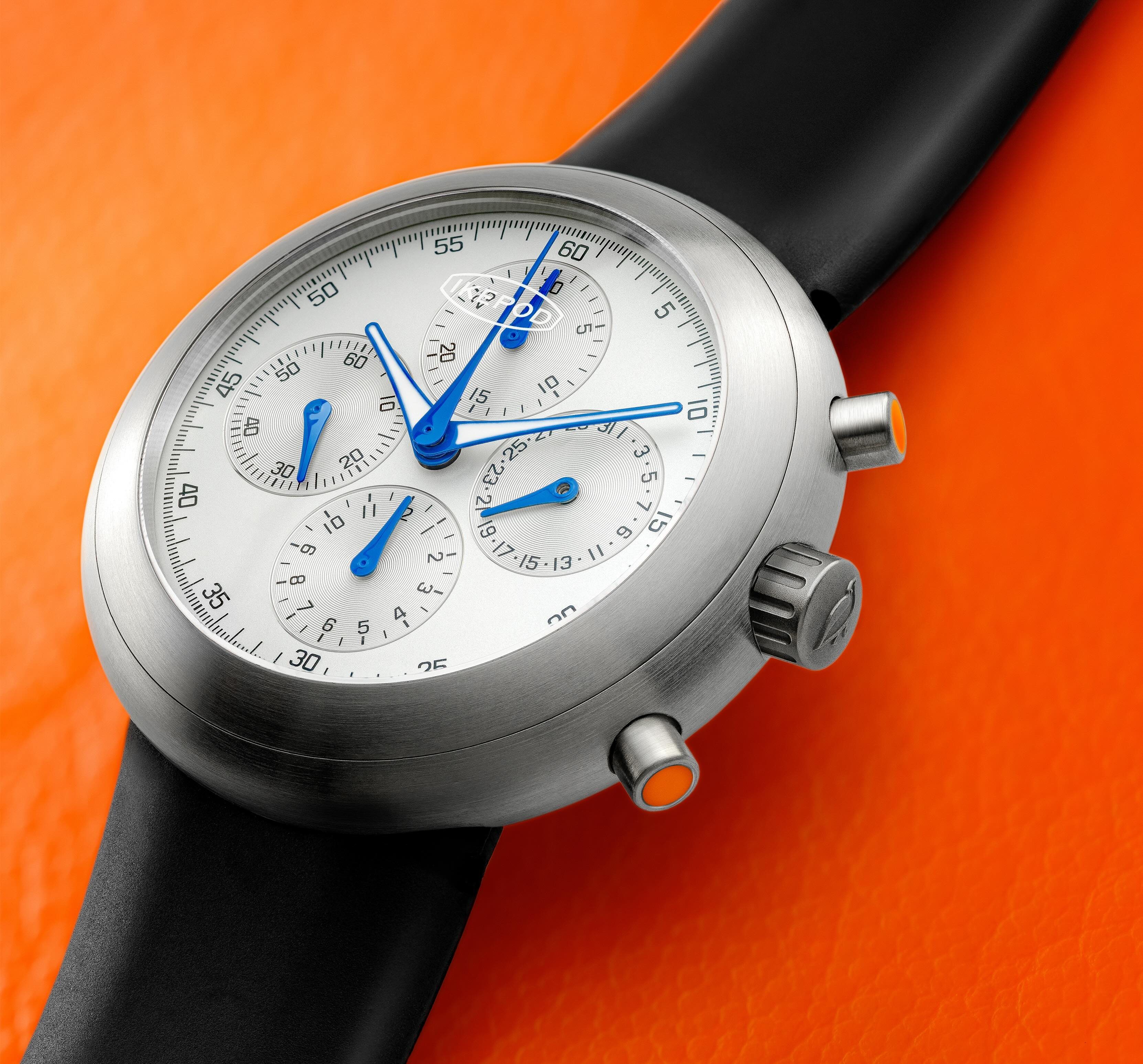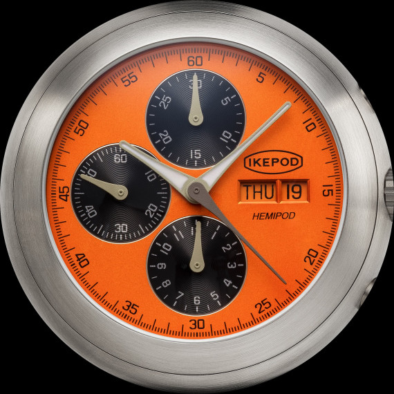 UN COMMENTAIRE ? C’est le grand retour du « style Ikepod », dont l’inspiration vintage vivifie le souvenir chez les amateurs de design tout en prouvant aux nouvelles générations que ce goût vintage ne les condamne pas à trois aiguilles sur cadran bleu danqs un boîtier « à la Genta ». Deux versions pour prolonger l’héritage Ikepod. Série HE00 (cadrans blanc et noir) : quatre compteurs, chronographe date avec mouvement C3IKE by Arola (module sur Valjoux 7750, date à 3 h), deux poussoirs, boîtier de 44 mm en titane grade 2 (forme arrondie), bracelet à pin en caoutchouc, Swiss Made, étanchéité à 50 m, logo gravé sur le saphir. Série HE10 (cadrans orange et bleu) : trois compteurs, chronographe jour-date, mouvement ETA 7750, nouveau cadran inédit chez Ikepod, deux poussoirs, boîtier de 44 mm en titane grade 2 (forme arrondie), bracelet à pin en caoutchouc, Swiss Made, étanchéité à 50 m, logo gravé sur le cadran (Hemipod, Ikepod). Les prix varient entre 5 500 euros et 5 900 euros.
