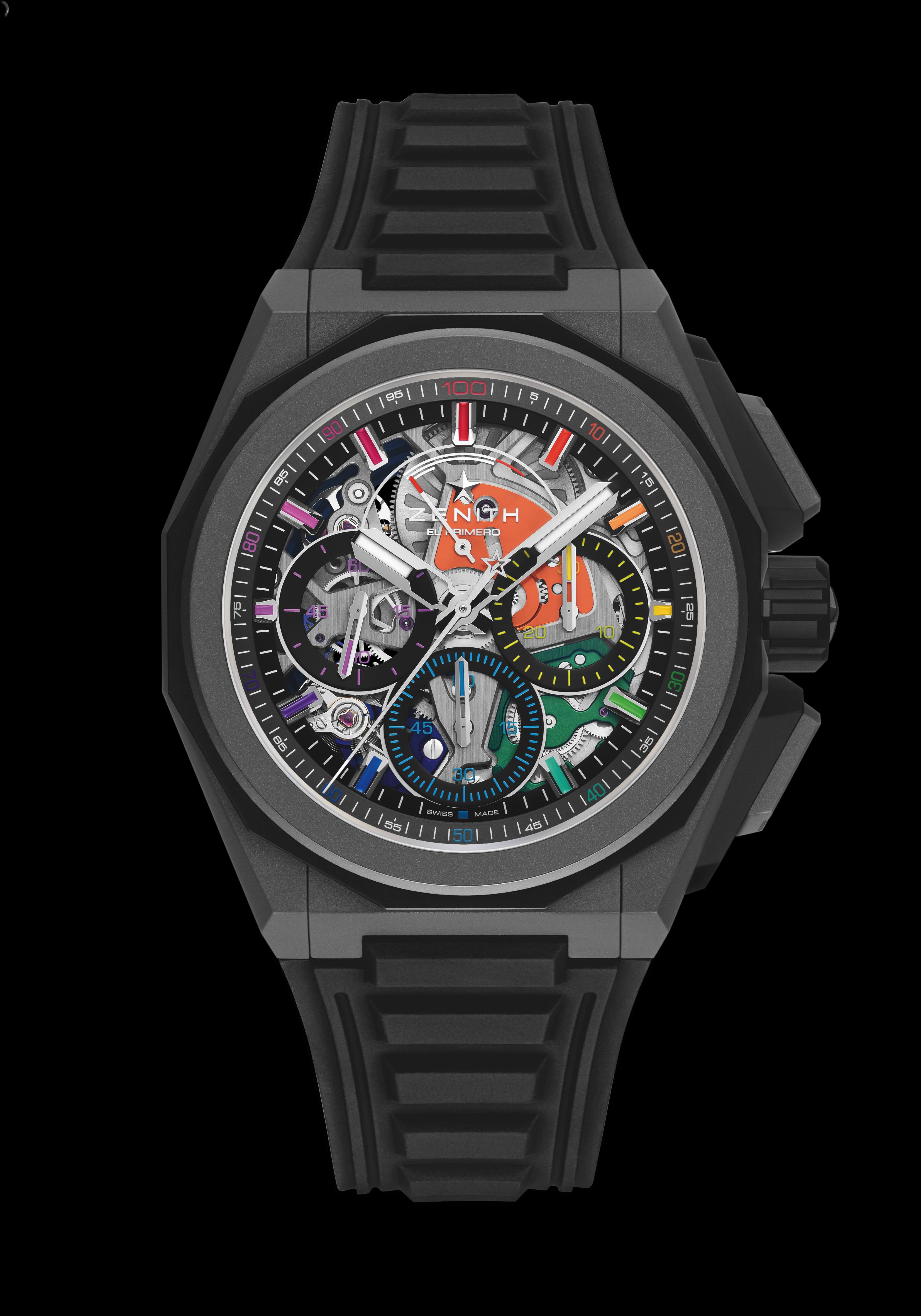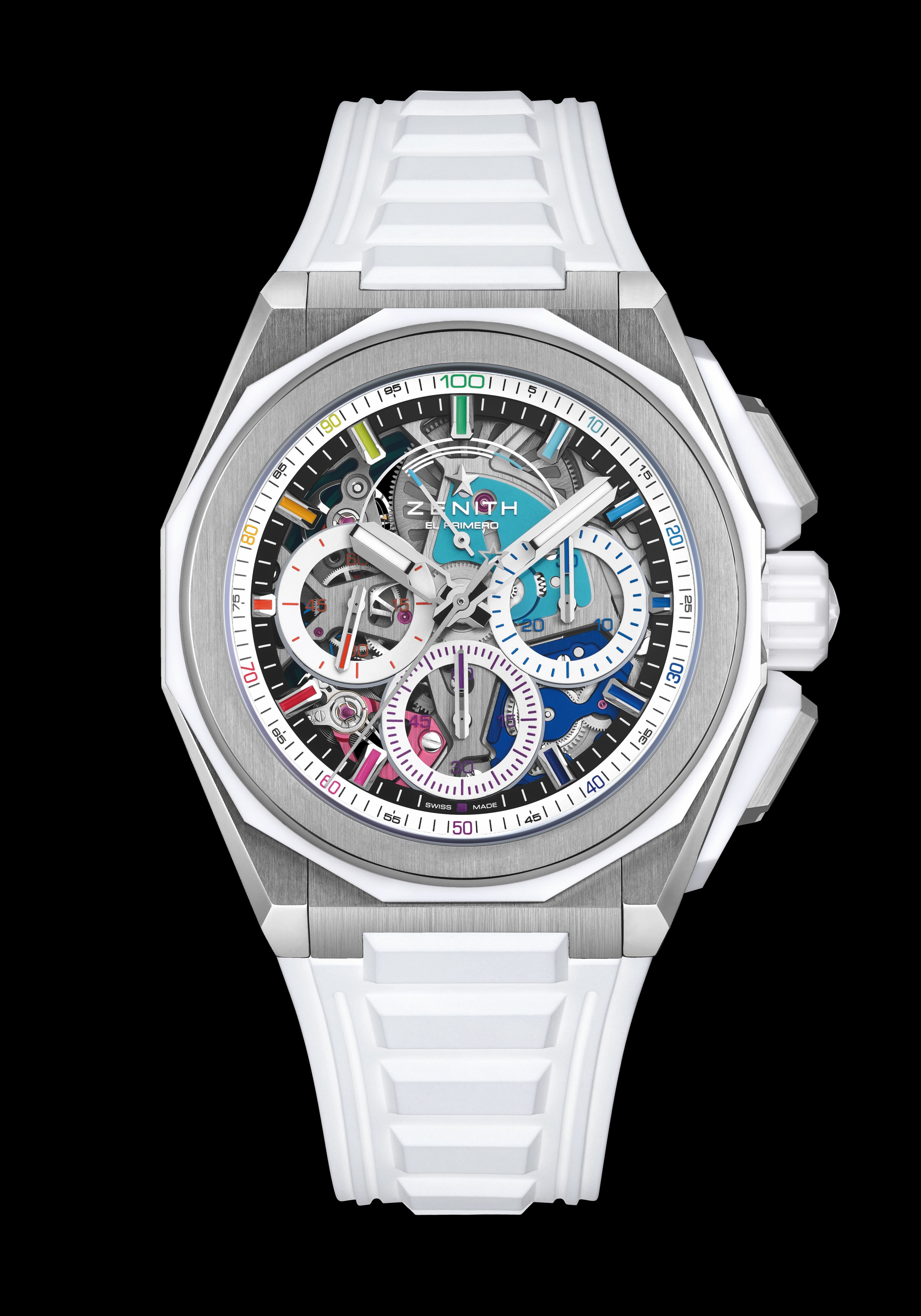 Au cœur de ces éditions Chroma bat une interprétation exclusive du calibre automatique El Primero 9004, dont les ponts arborent un traitement PVD multicolore. Ce véritable arc-en-ciel mécanique apparaît en partie à travers un cadran ajouré noir ou blanc, où index et marquages reprennent les teintes du mouvement dans un dégradé parfaitement fluide. Chaque pièce bénéficie ainsi d’une composition chromatique unique. Les nuances vives se prolongent sur les pointes des aiguilles des différents compteurs : heures et minutes du chronographe à 9 h et 3 h, réserve de marche du chronographe à 12 h, petite seconde à 6 h. Au verso, la masse oscillante en forme d’étoile s’habille de bleu intense pour l’édition noire et d’un vert électrique pour l’édition blanche. Sur le plan technique, l’El Primero 9004 reste inégalé grâce à sa capacité à mesurer le 1/100e de seconde. Cette prouesse repose sur deux organes régulateurs indépendants, chacun doté de son propre barillet. Le premier bat à 5 Hz (36 000 a/h) pour une précision optimale, tandis que le second atteint 50 Hz (360 000 a/h) afin d’entraîner le chronographe. L’aiguille centrale effectue une rotation complète chaque seconde, permettant une lecture instantanée du 1/100e de seconde. Comme toutes les Defy Extreme, les versions Chroma intègrent un système de changement rapide de bracelet, accessible via des poussoirs situés au dos du boîtier. Chaque modèle est livré avec trois options : un bracelet en caoutchouc embossé, noir ou blanc selon l’édition, avec boucle déployante, un bracelet en titane assorti aux finitions de la montre, ainsi qu’un bracelet Velcro noir.