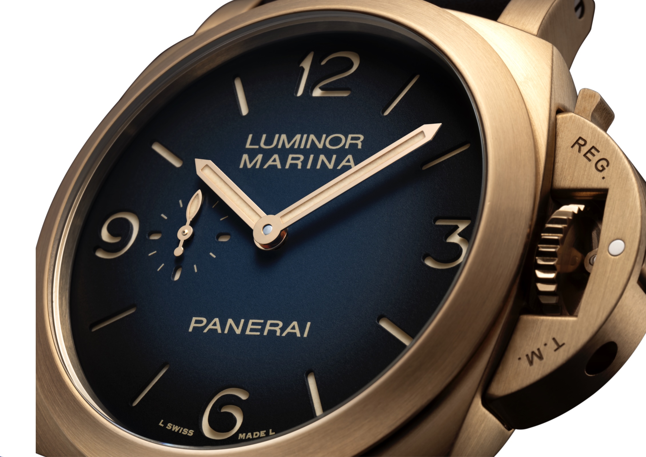 Tous les éléments caractéristiques de la collection Luminor Marina se retrouvent dans la Luminor Marina Bronzo PAM01678, complétés par les récentes améliorations esthétiques et techniques. « Le bronze est plus qu’un simple matériau pour nous : il s’agit d'un terrain d’expression. La nouvelle Luminor Marina PAM01678 évoque immédiatement le monde de la mer : elle réunit le design de notre montre la plus emblématique et un matériau qui incarne notre héritage maritime. Sa patine qui évolue au fil des années nous permet de raconter l’histoire du temps et de la mer, tout en reflétant le parcours de son propriétaire », déclare Alessandro Ficarelli, Chief Marketing and Product Officer de Panerai. Les éléments clés restent inchangés : du pont protège-couronne, conçu à l’origine pour empêcher les infiltrations d’eau dans le boîtier, à l’incontournable cadran luminescent en construction sandwich offrant une lisibilité optimale dans l'obscurité, en passant par le traditionnel compteur de petite seconde rhodié à 9 heures, initialement prévu pour permettre aux commandos de la Marine Militaire Italienne de s’assurer facilement du bon fonctionnement de la montre. Le boîtier en bronze du modèle PAM01678 est associé à un cadran sandwich mat bleu foncé, avec une nuance bleu profond sur le pourtour s’éclaircissant progressivement jusqu’au centre. Ce coloris se marie à la perfection avec les tons chauds du boîtier en bronze et avec le Super-LumiNova beige appliqué sur les chiffres et les aiguilles afin de garantir une bonne lisibilité, même dans l’obscurité. Inspiré des modèles historiques Panerai des années 1960, le cadran est volontairement dépourvu de guichet de date. Il est uniquement orné du nom de la Maison et de la mention « Luminor Marina » pour afficher une esthétique sobre et épurée.