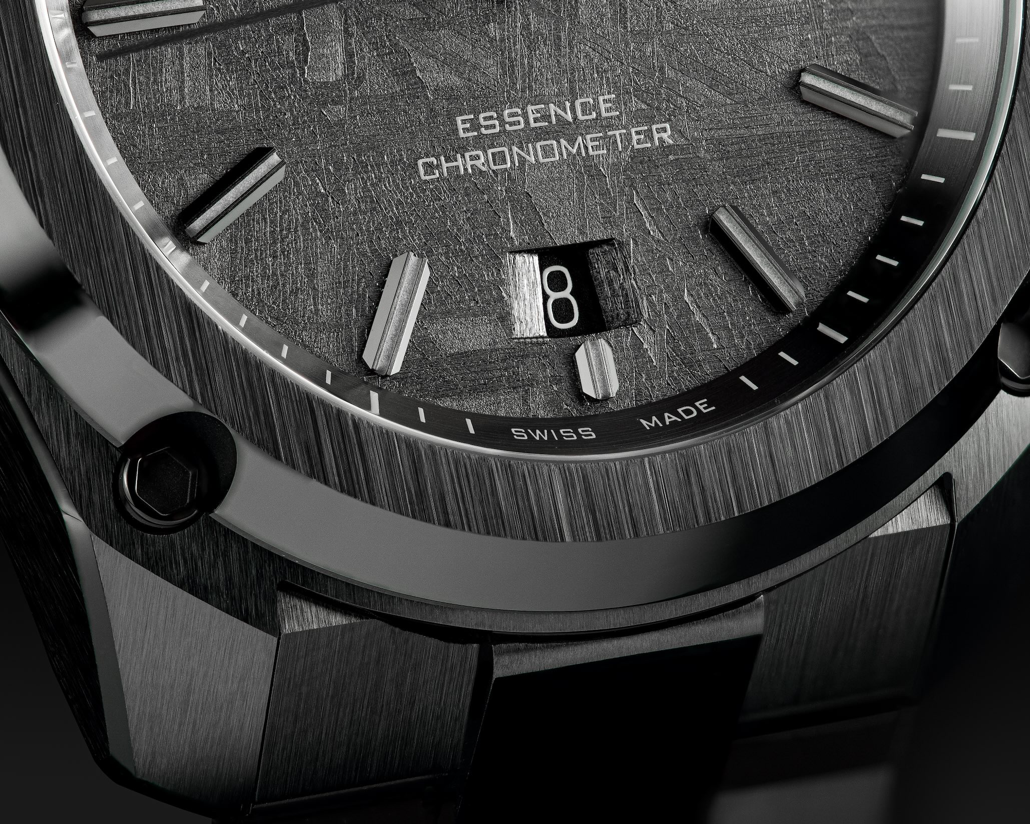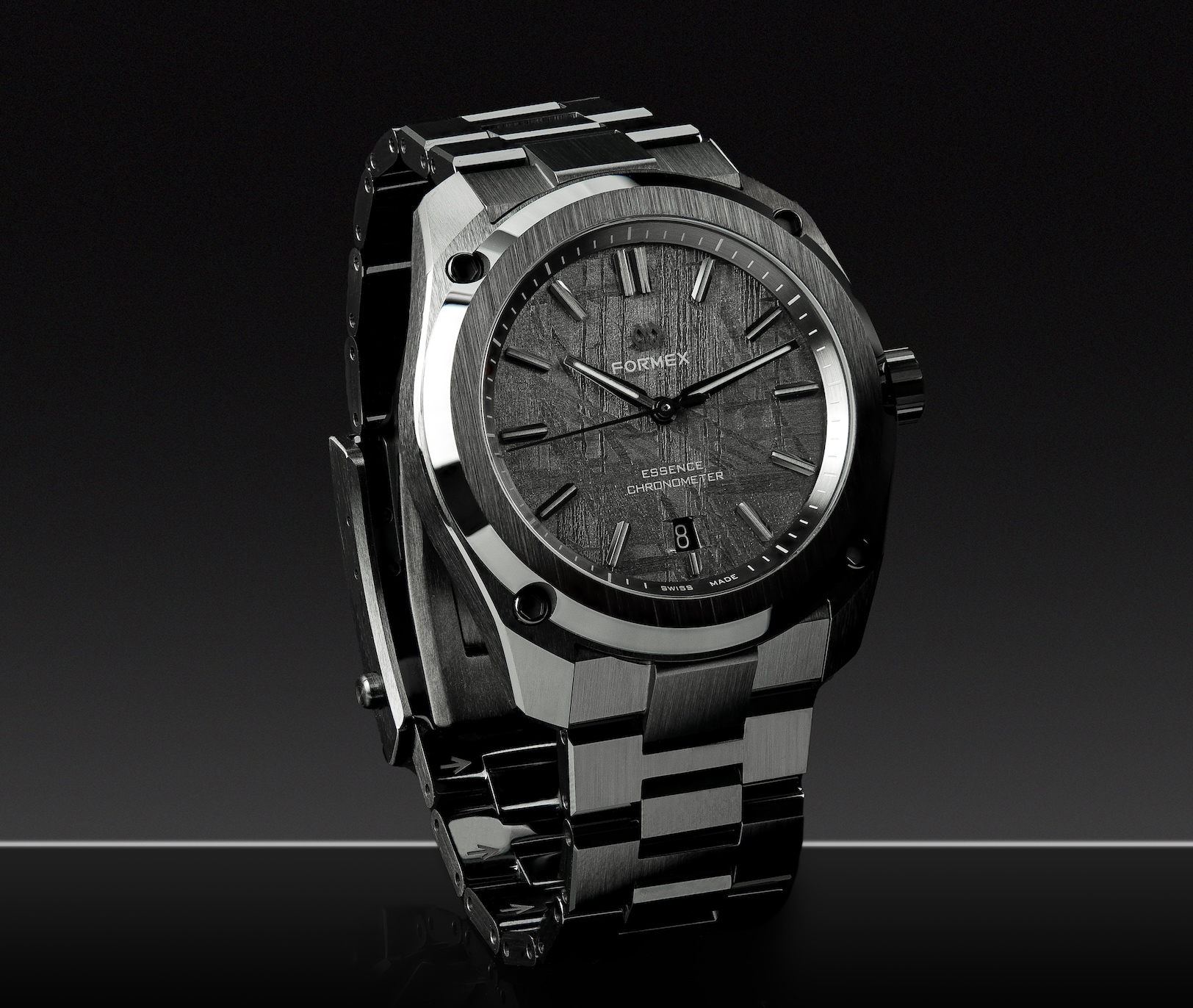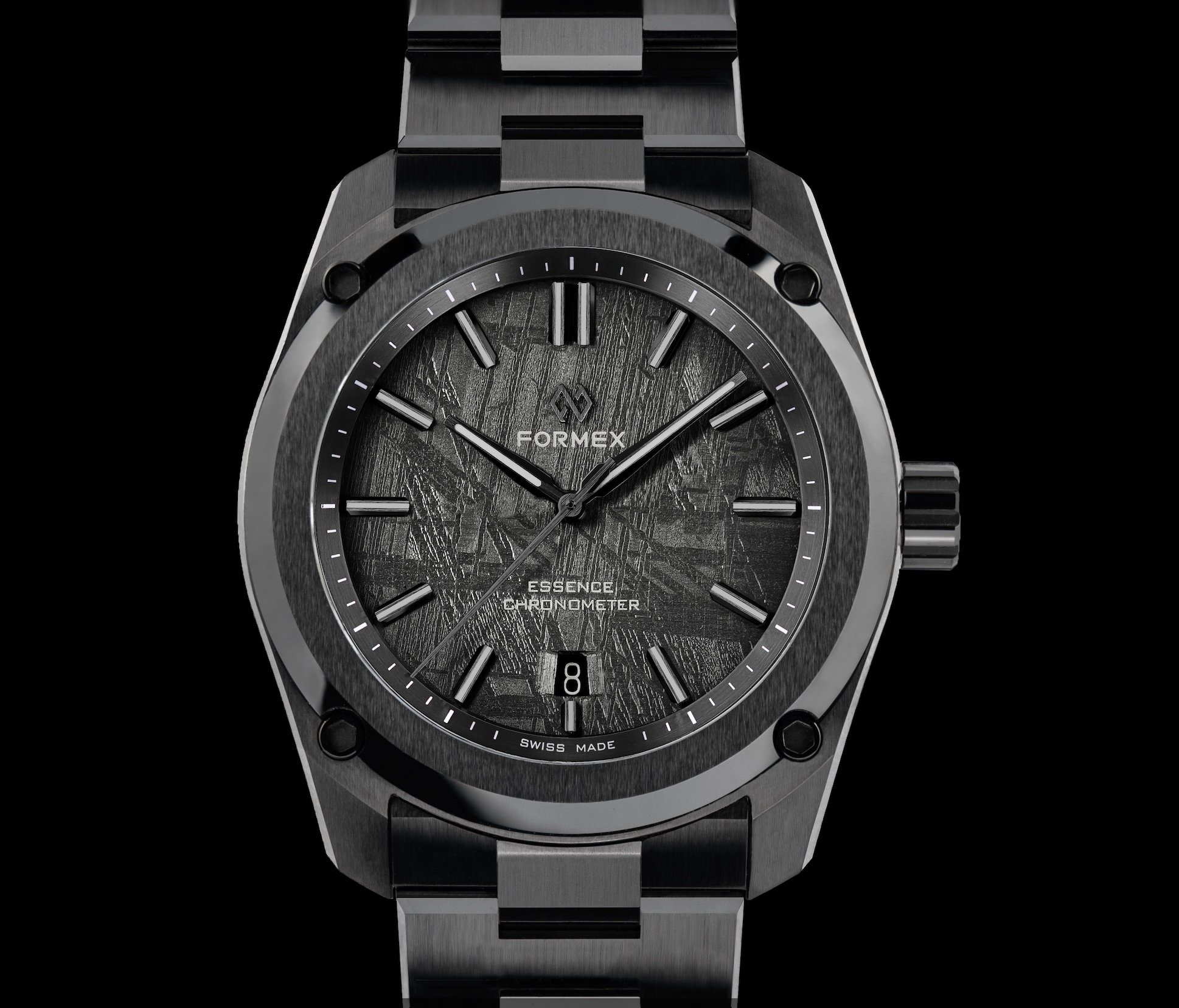 Contrairement à la plupart des cadrans en météorite ou en pierre, qui ne sont que de fines lamelles collées sur des plaques en laiton, le Dark Matter est conçu comme un composant monobloc. Cette approche permet à Formex de souder directement les pieds du cadran dans la météorite, rendant possible une fenêtre de date à 6 heures entièrement fraisée et biseautée — une prouesse technique dans la fabrication de cadrans. Associé au boîtier en céramique noir intense et ultra-résistant aux rayures, le cadran semble presque doté d’une force gravitationnelle, attirant le regard vers ses champs cristallins changeants. Des index et aiguilles appliqués couleur gun-metal flottent au-dessus de la surface, leurs facettes brossées et leurs chanfreins polis captant la lumière tels des fragments en orbite. La Super-LumiNova BGW9 assure une parfaite lisibilité dans l’obscurité, tandis qu’un disque de date ton sur ton préserve l’harmonie visuelle. Même la mention « Swiss Made » se déplace discrètement sur le rehaut, laissant le cosmos occuper le devant de la scène. « En céramique, chaque surface dit la vérité », explique Raphael Granito, CEO de Formex. « Ce matériau ne pardonne rien — chaque angle, chaque arête, chaque transition est exposé et doit être parfait. Introduire de la météorite dans cet environnement revient à associer l’un des matériaux d’ingénierie les plus exigeants à l’un des matériaux naturels les plus imprévisibles. Le Dark Matter est l’endroit où ces deux mondes se rencontrent. En assombrissant la météorite, l’objectif était de lui permettre de s’intégrer harmonieusement à l’architecture en céramique, tout en prenant vie lorsque la lumière frappe le cadran — révélant pleinement la structure cristalline qui rend chaque pièce unique. » Le Dark Matter n’est pas simplement un cadran ; c’est un point de rencontre entre l’histoire interstellaire et l’ingénierie contemporaine. Un rappel que, même dans une montre technique et rigoureuse comme l’Essence Ceramica, il existe une place pour quelque chose qui semble subtilement venu d’ailleurs.