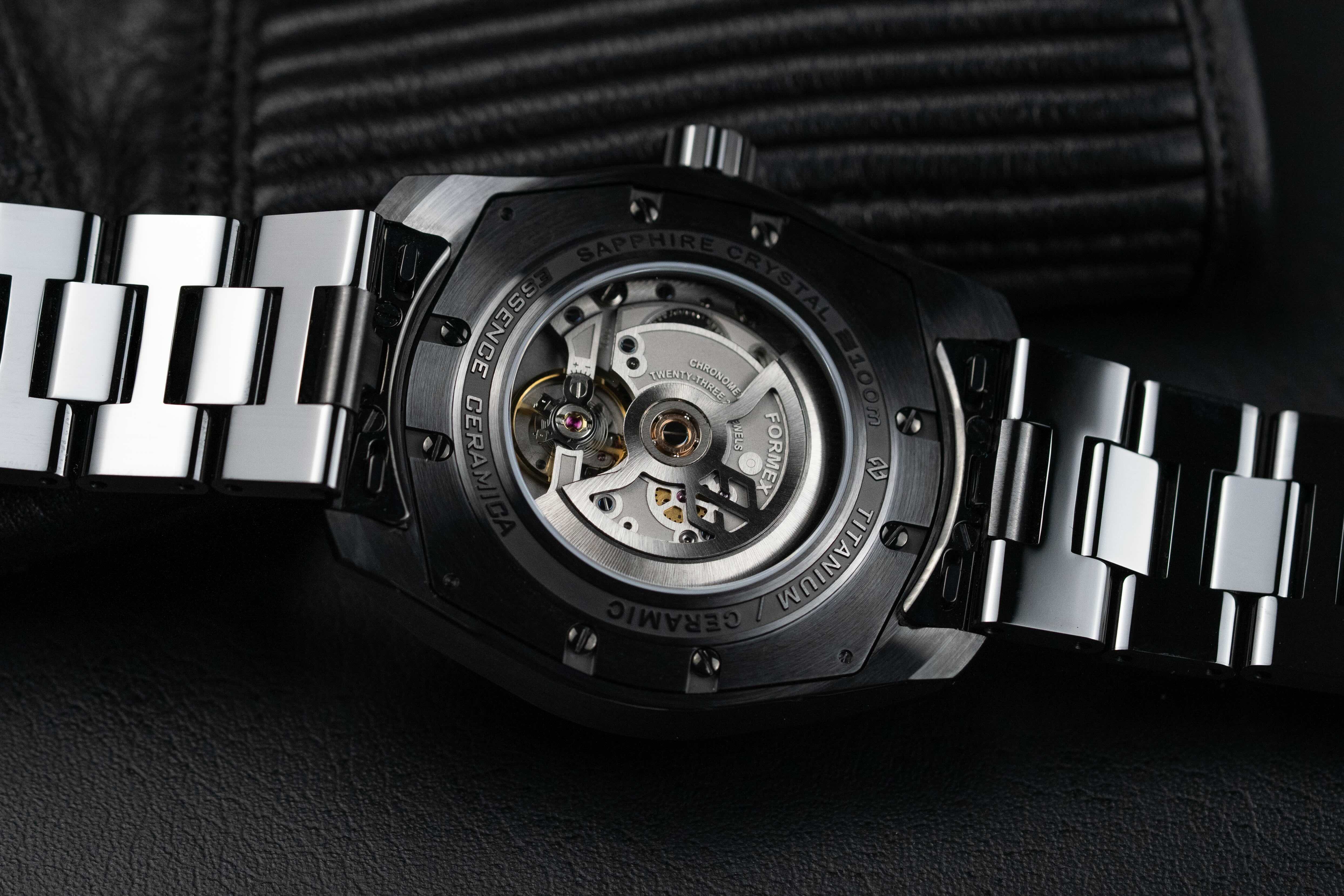 Le lancement de l’Essence Ceramica COSC a également introduit un nouveau partenaire horloger : Soprod. Fondée en 1966 dans la région jurassienne suisse, Soprod rejoint Sellita en tant que seconde source de calibres Swiss Made éprouvés. Projet Newton P092 : en 2023, a débuté le développement d’un calibre Soprod conçu sur mesure selon les spécifications de Formex – le Newton P092. Son architecture a été choisie pour la symétrie de sa disposition 6–12 heures, plaçant le balancier à 6 heures sous un pont transversal qui améliore la résistance aux chocs et aux vibrations — une approche qui fait écho au système de suspension de boîtier breveté de Formex. L’amortisseur à double cône d’Incabloc, considéré comme une référence dans cette catégorie, offre une protection supplémentaire. Les décorations et finitions du Newton P092 ont été conçues en interne afin d’exprimer une esthétique résolument moderne. Les ponts présentent une surface grainée obtenue par texturage laser, avec des chanfreins verticalement brossés, sublimés par un traitement galvanique noir-or. Les vis bleuies thermiquement apportent un contraste traditionnel, tandis que le rotor squeletté arbore un emblème Formex ajouré et une finition soleil affirmée, captant la lumière à travers le fond en saphir. La fiabilité est garantie grâce aux tests indépendants Chronofiable réalisés au Laboratoire Dubois, à La Chaux-de-Fonds, où les mouvements sont soumis à un vieillissement accéléré, à des variations extrêmes de température et d’humidité, ainsi qu’à 20 000 chocs de différentes intensités. Chaque mouvement passe ensuite par le processus rigoureux de certification du COSC, le Contrôle Officiel Suisse des Chronomètres. Pendant 15 jours, les calibres sont testés dans cinq positions et à trois températures, conformément à la norme ISO 3159. Seuls ceux dont la marche journalière moyenne se situe entre −4 et +6 secondes obtiennent le titre de « chronomètre » . Chaque Essence Ceramica est livrée avec son certificat COSC, et chaque mouvement porte un numéro de chronomètre gravé individuellement. « Avoir Soprod et Sellita à proximité est une véritable force pour nous », déclare Raphael Granito, CEO de Formex. « Soprod, dans le Jura, n’est qu’à une demi-heure de Cadranor, notre société sœur spécialisée dans les cadrans, et à moins de 20 minutes de notre siège à Bienne/Biel, tandis que Sellita se trouve seulement un peu plus loin en voiture. Et lorsqu’il est question de boîtiers et de bracelets, Dexel est juste à côté. Cette proximité nous permet de travailler main dans la main avec nos partenaires, garantissant agilité, responsabilité et une transition fluide du design à la production. Cela renforce la résilience de notre chaîne d’approvisionnement et maintient le cœur du savoir-faire horloger suisse littéralement à notre porte. Et avec le Newton P092, nous voyons le résultat de cet écosystème — un calibre qui semble être l’expression pure de Formex. C’est la même fierté qu’une écurie de course ressent lorsqu’elle développe son propre moteur pour le lancer sur la piste : la certitude que ce qui fait battre la montre porte notre ADN. »