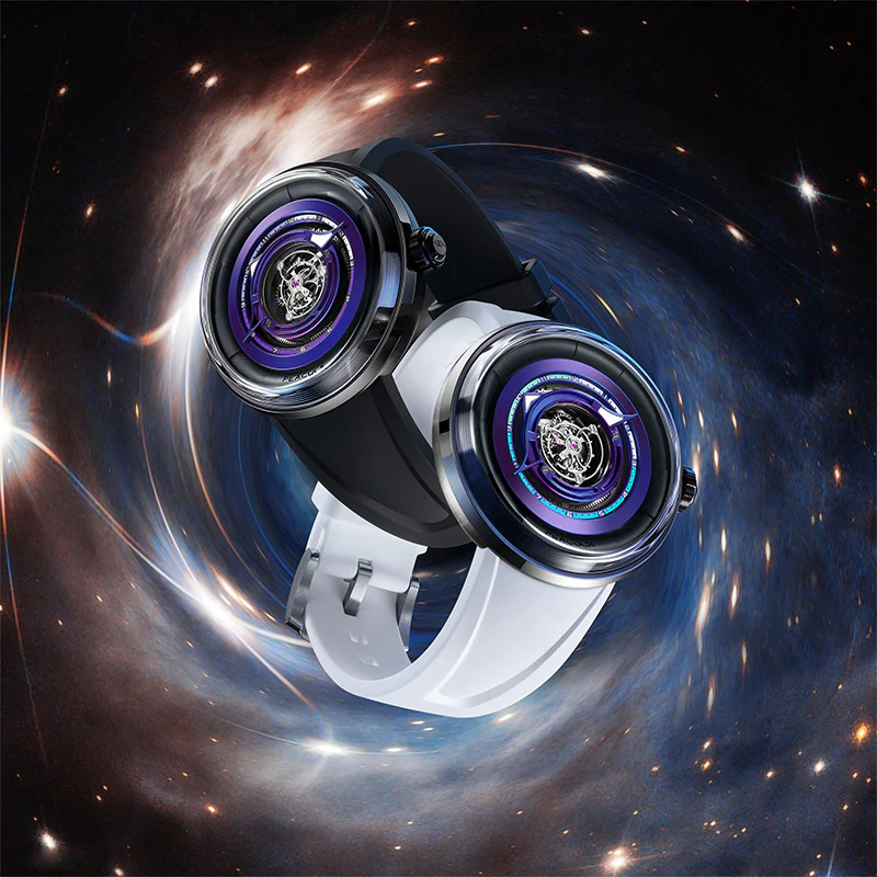Au-delà des limites de la physique connue, là où le temps se dilate et où la matière s'effondre dans la lumière, se trouve le trou noir. La Peacock Black Hole Central Tourbillon – Event Horizon Edition transpose cette énigme cosmique dans un chef-d'œuvre mécanique. Inspirée par la relativité d'Einstein et les disques d'accrétion orbitant autour des puits gravitationnels, cette nouvelle édition fusionne le titane flammé à la main, le guilloché vortex et un tourbillon central argenté pour former un centre gravitationnel à couper le souffle. Dans un monde où la conformité est la norme, la Peacock Black Hole défie les conventions. La montre Black Hole Tourbillon, couronnée du prestigieux Gold Award lors des Muse Design Awards 2023, transcende la simple mesure du temps. C'est une symphonie cosmique, une fusion entre l'horlogerie et l'astrophysique qui séduit les connaisseurs avertis. Les aiguilles et l'anneau intérieur sont bleuis à la flamme à la main à une température de 550 à 600 °C, créant les teintes bleu-violet envoûtantes d'un disque d'accrétion tourbillonnant dans un trou noir. Chaque brûlure est naturellement aléatoire et totalement unique, comme une empreinte cosmique. Il n'y a pas deux montres identiques, ce qui rend chaque pièce unique. Chaque aiguille et chaque anneau en titane sont d'abord polis à la main à l'aide de papiers abrasifs de grain 1000 à 7000 en quatre étapes progressives. Ce n'est qu'après avoir obtenu une surface miroitante impeccable qu'ils sont traités à la flamme. Ce souci du détail lors de la pré-finition garantit que le titane bleui capte la lumière comme du plasma dans l'espace. Fabriqués à partir de titane de grade 5 de qualité aérospatiale, le boîtier, la lunette, les cornes et les aiguilles sont 43 % plus légers que l'acier et plus résistants que le temps. Disponible en noir obsidienne ou en grain naturel, il offre un confort extrême, une hypoallergénicité et une légèreté visuelle, enveloppant un saphir bombé comme un vaisseau spatial en orbite.